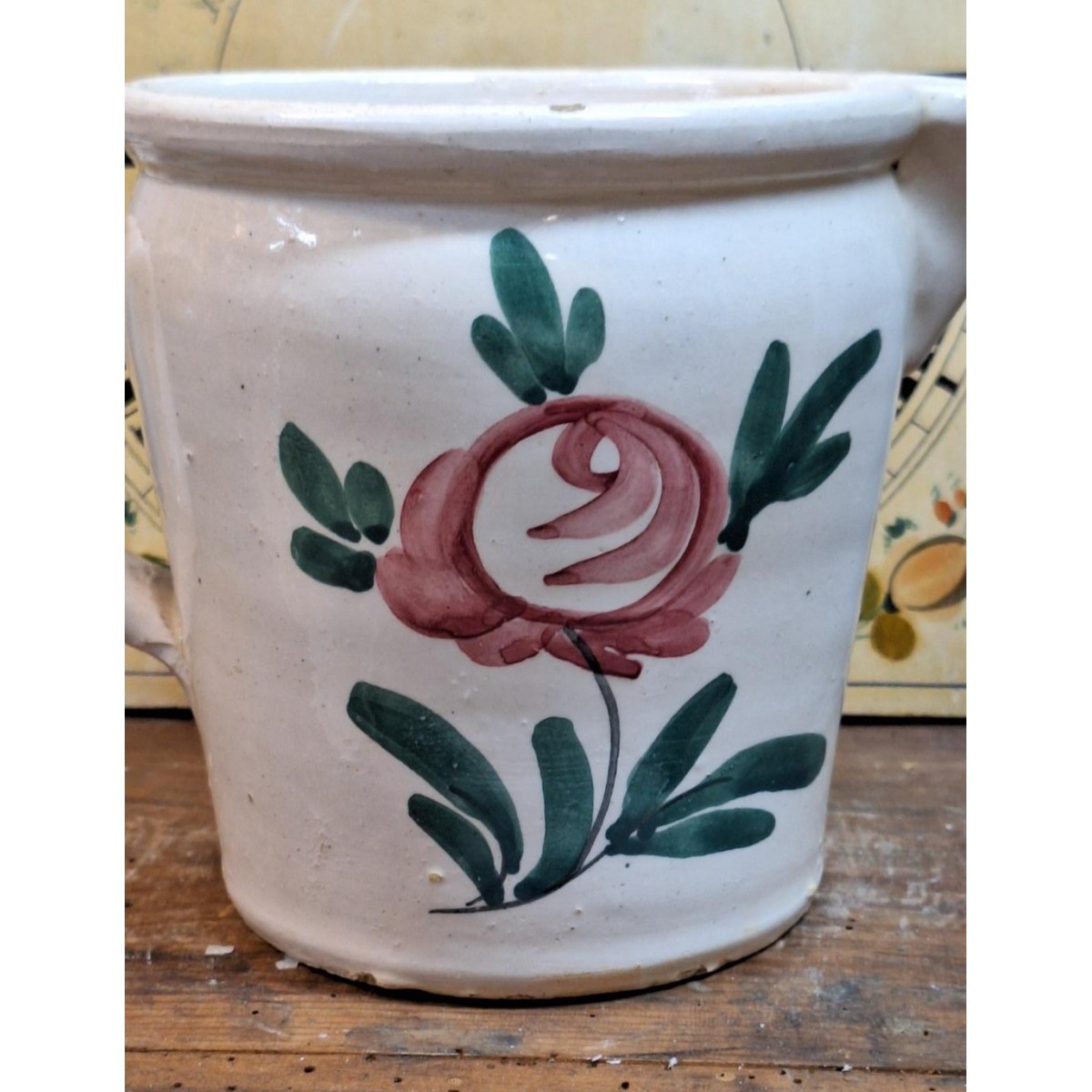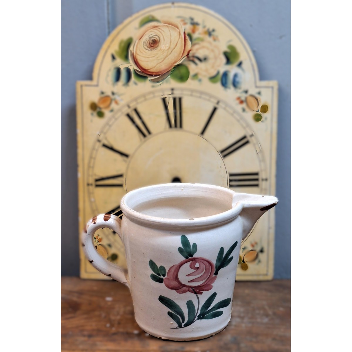 Den fine gamle franske kande er med et naivt motiv af en hane på den ene side. Og på den anden side et fint blomstermotiv. Let patina kan forekomme..SE BILLEDER..