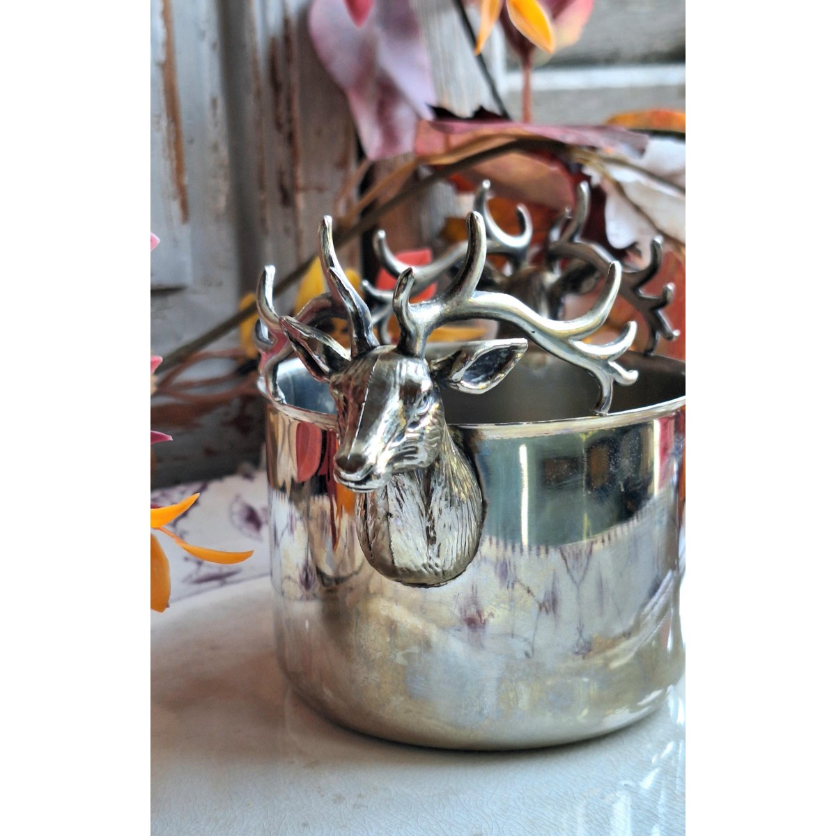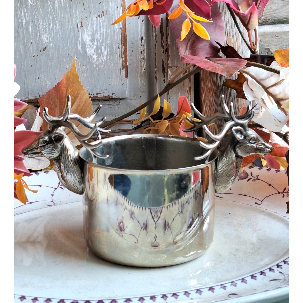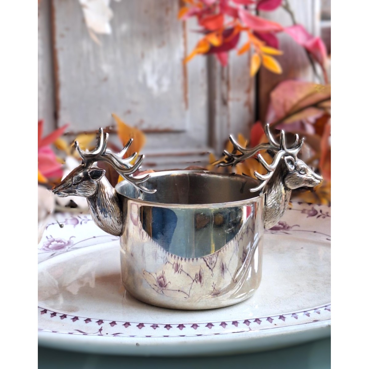 Se fuld størrelse En flot sølvplet skål med kronhjortehoveder og gevir som håndtag....Læs mere