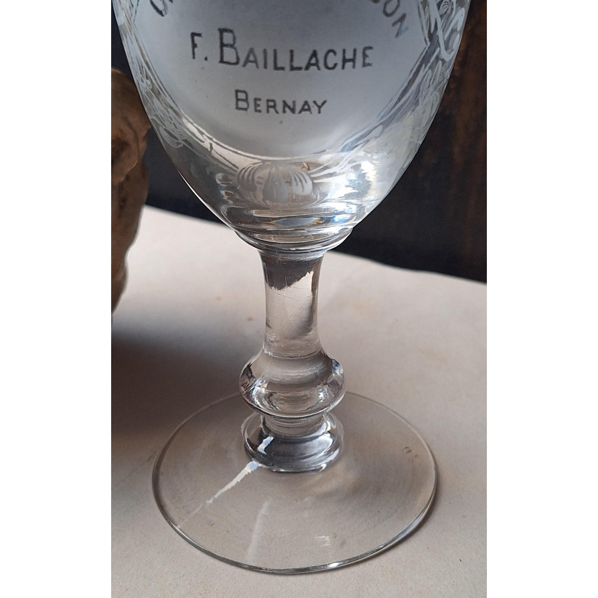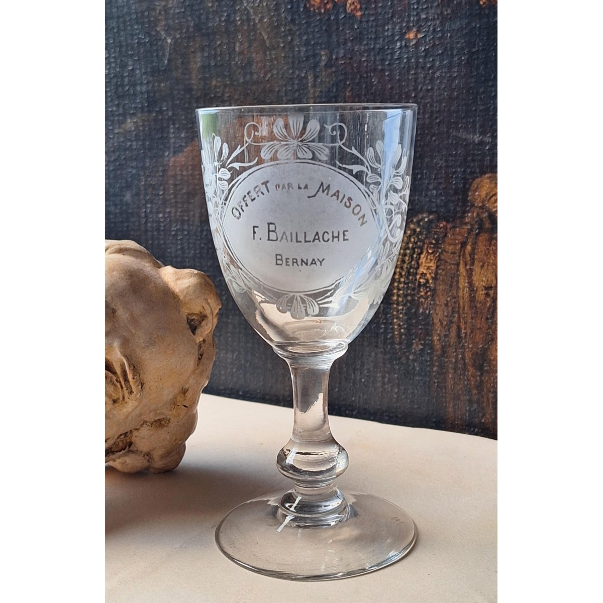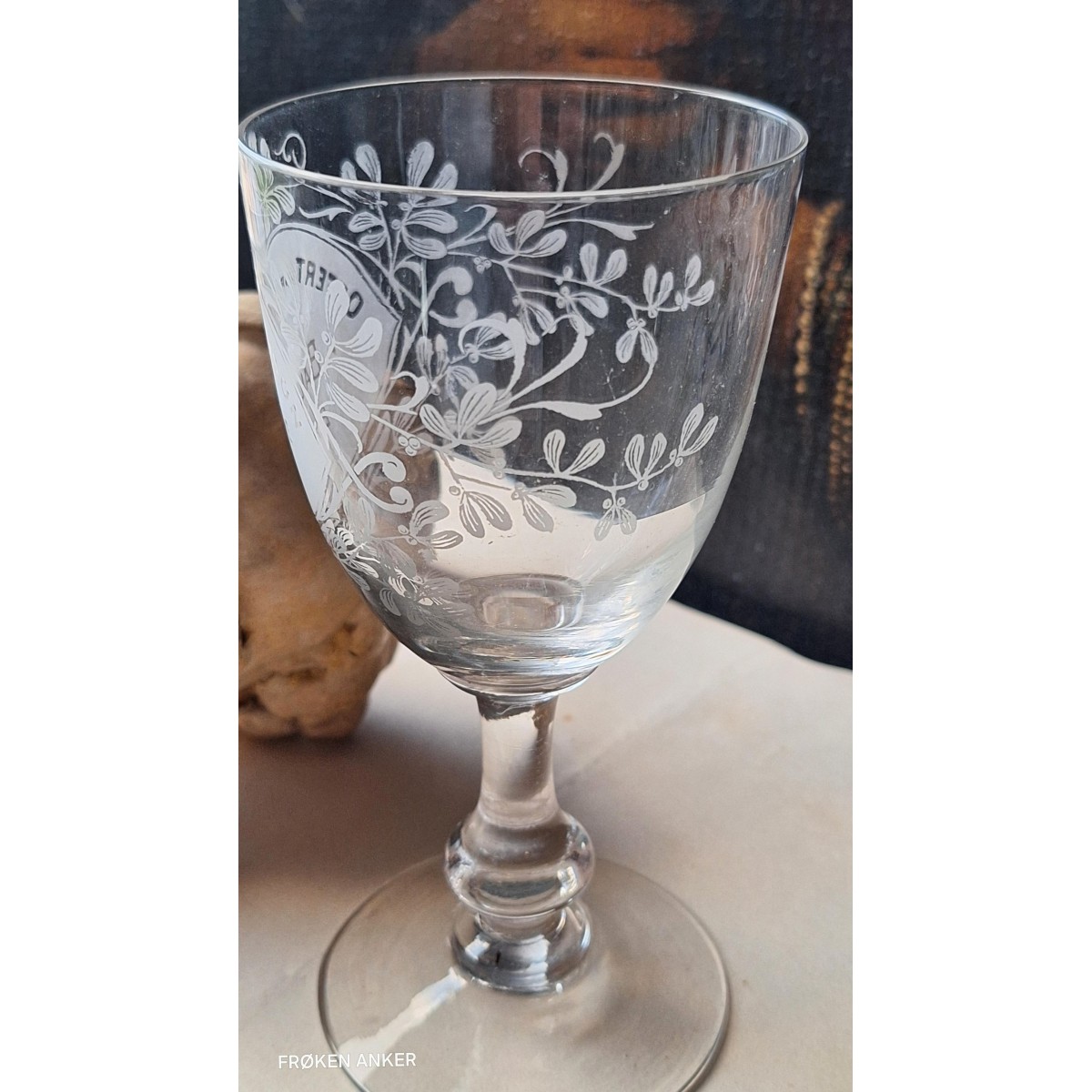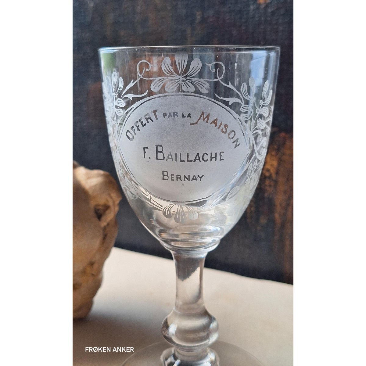Smukt gammelt souvenirglas med indgravering, "Offert par la Maison''. Et smukt glas uden synlig slitage. Brugspatina kan forekomme...se billeder