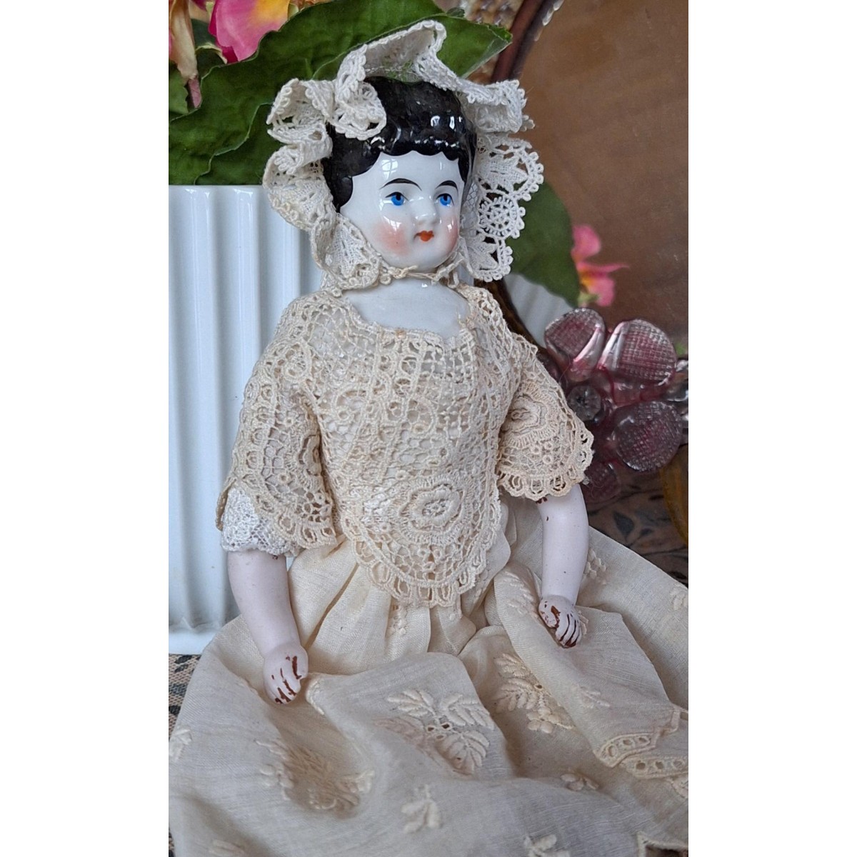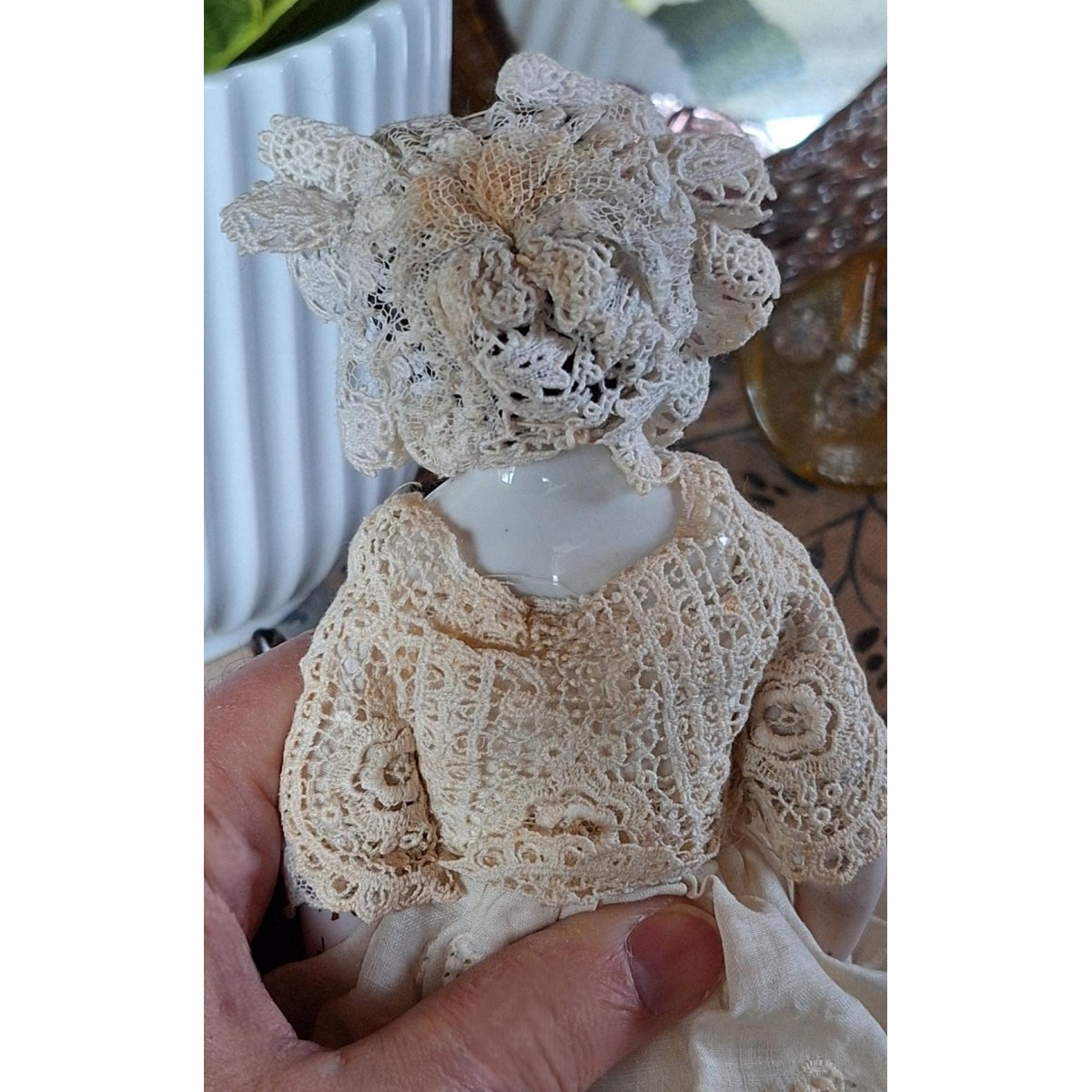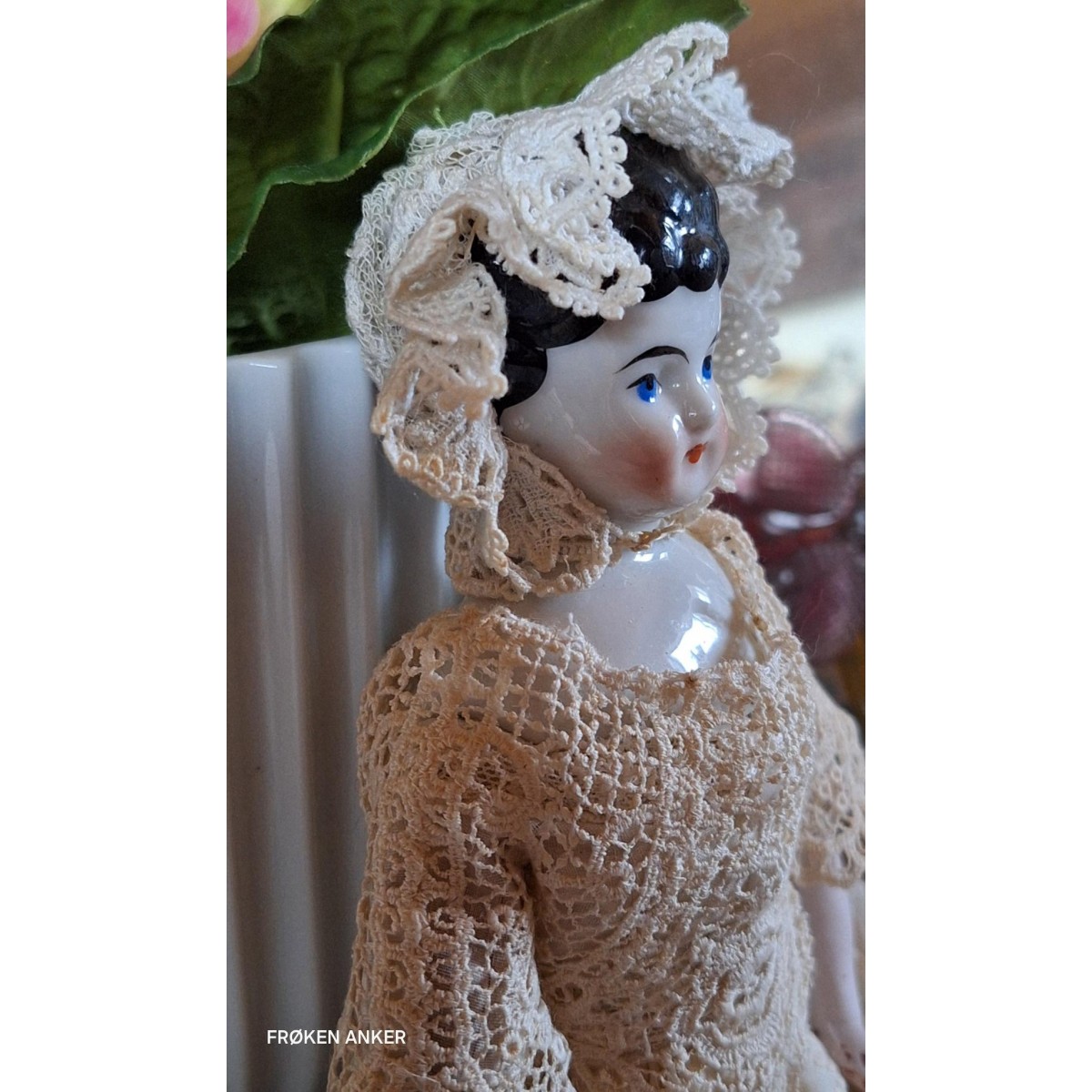 Den antikke dukkehus dukke i stof og porcelæn er så fin med blondekjole, mamelukker og kyse.