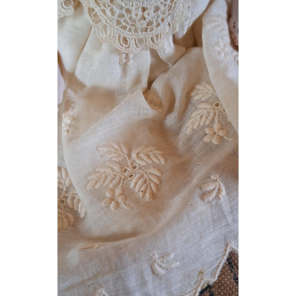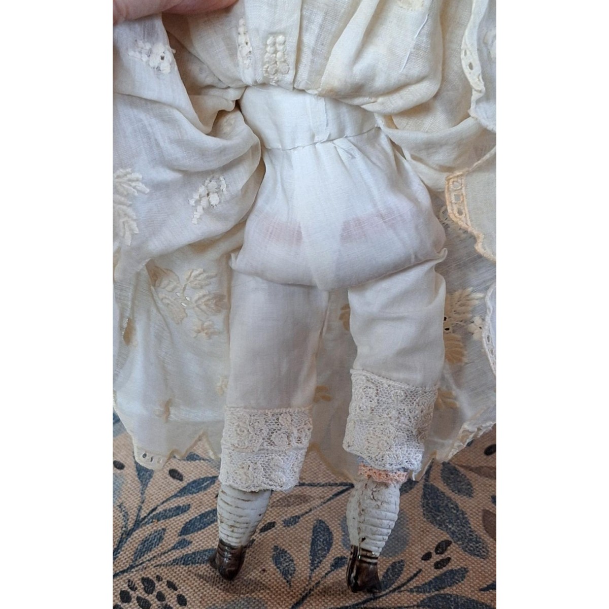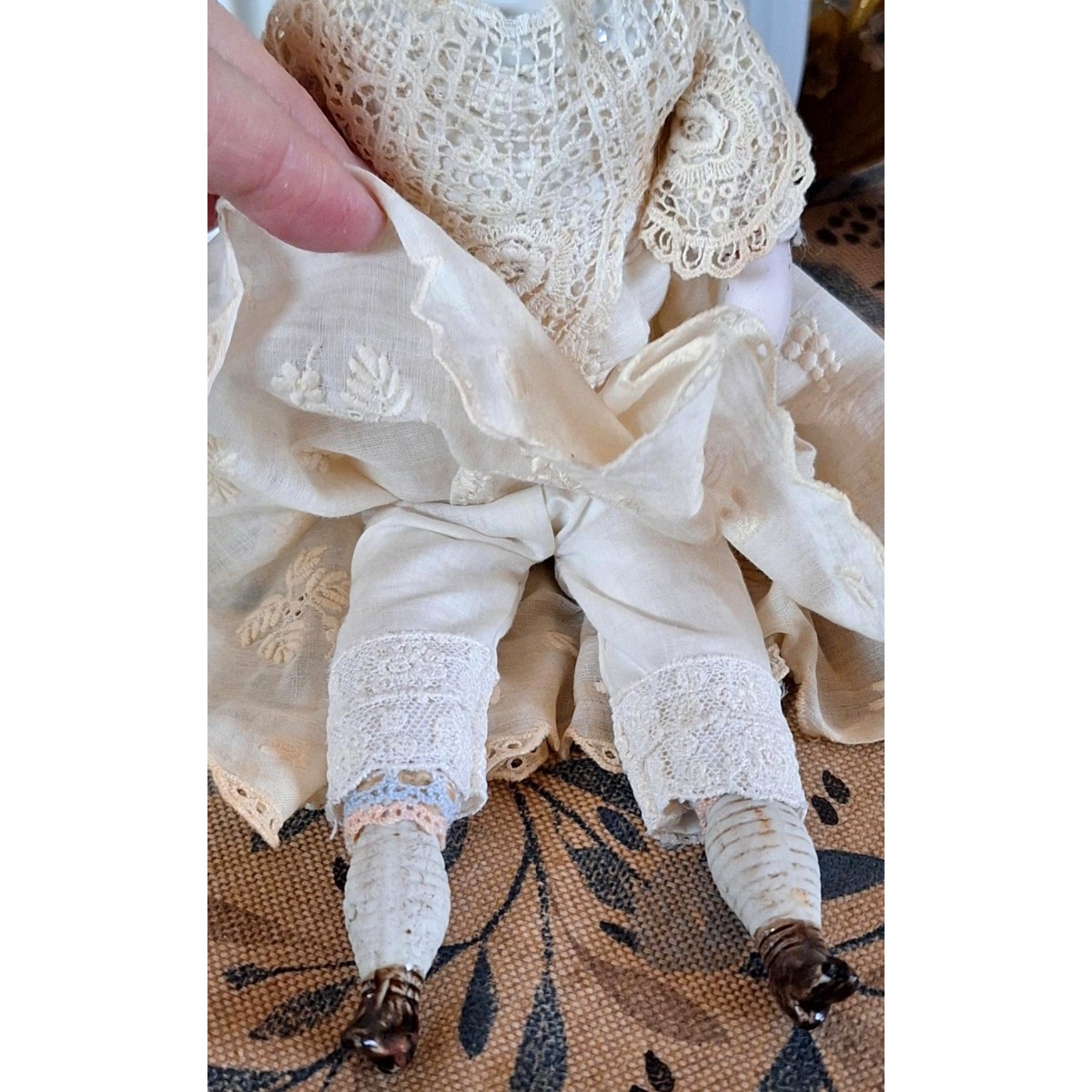 Den antikke dukkehus dukke i stof og porcelæn er så fin med blondekjole, mamelukker og kyse.
