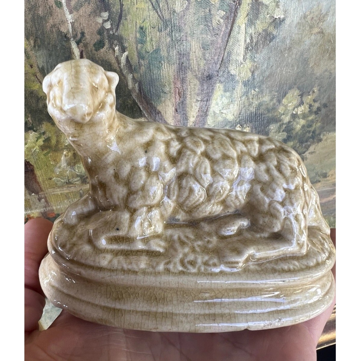 En skøn antik fransk sparebøsse formet som et liggende får. Figuren er i fajance. På bagsiden er møntindkast hullet. Under bunden er et mikrochip ...SE BILLEDER...Flot og velholdt, taget alderen i betragtning