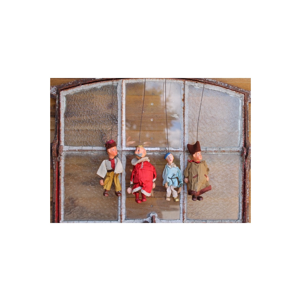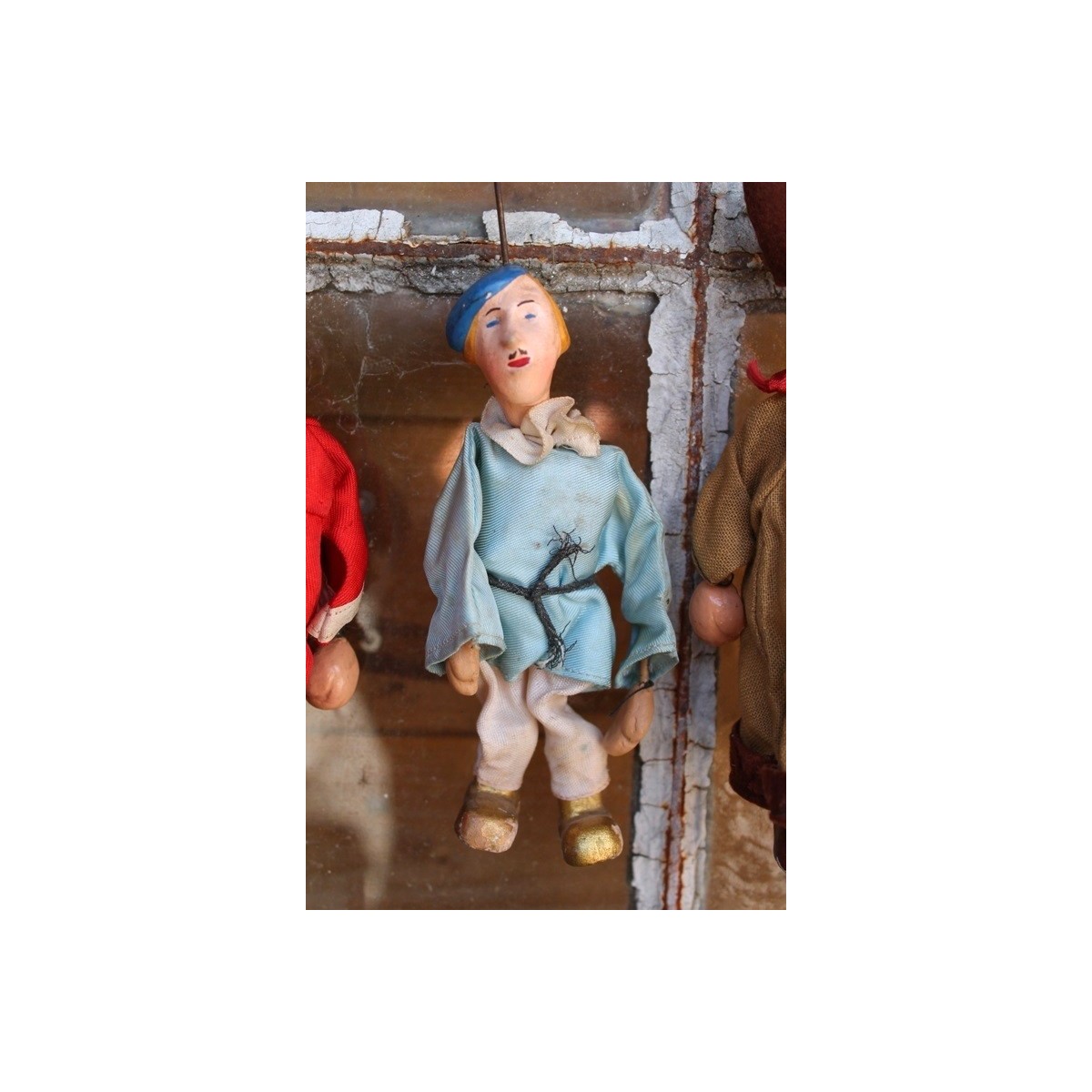 De er meget dekorative, de fine gamle franske marionetdukker. De kommer fra et gammelt dukketeater. Der forekommer patina og lidt slitage.