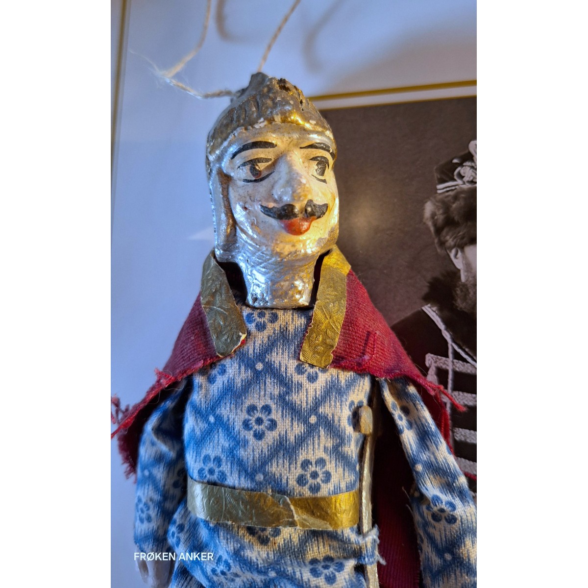 Den gamle marionetdukke er i malet gips, og er håndmalet, og unik. Dukken er håndlavet. Bemærk det fine sværd i bæltet, og hjelmen. Der er huller i hænderne til snore. Der forekommer brugsspor og patina, da den er købt brugt.....Se billeder.