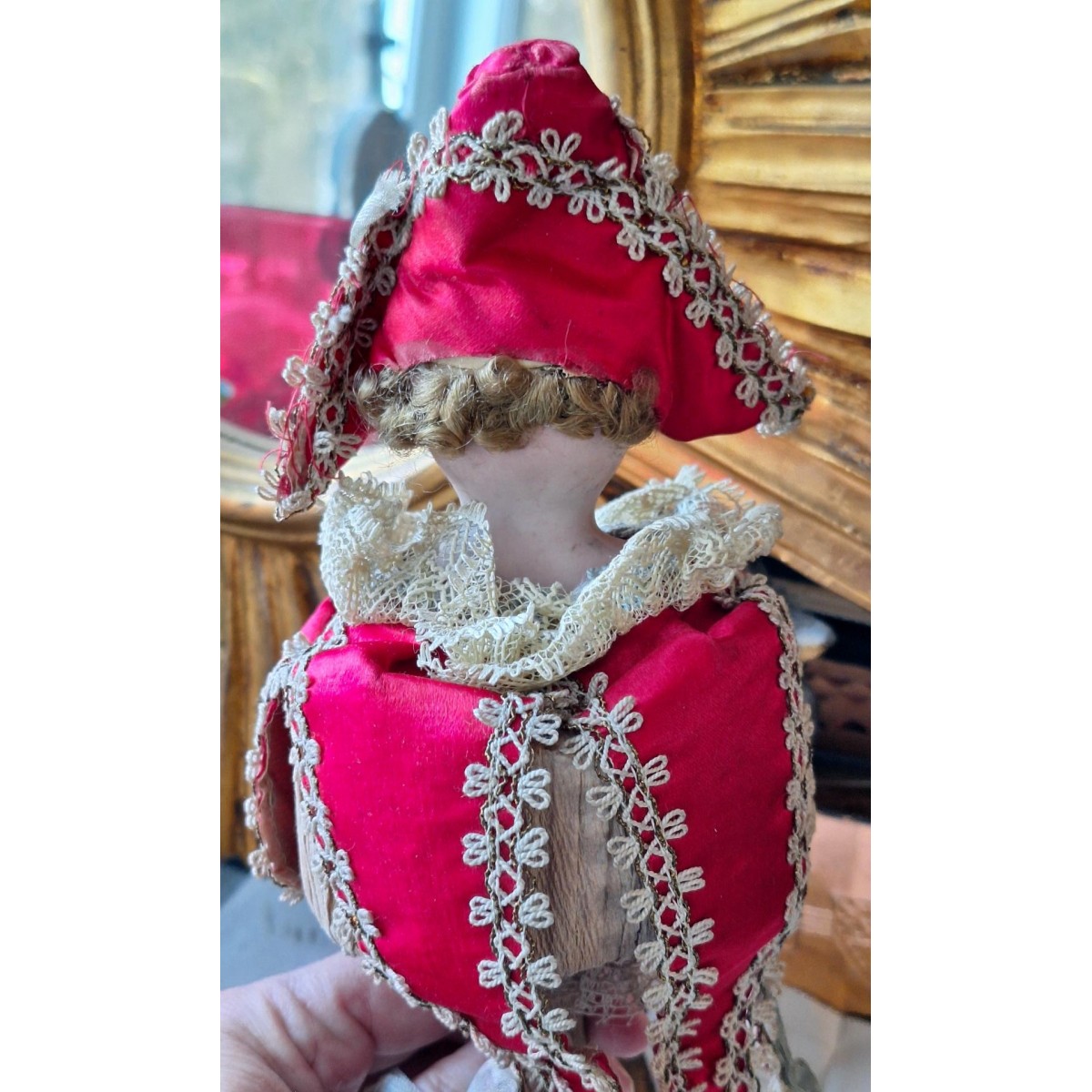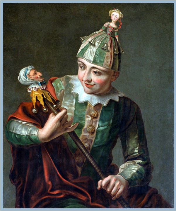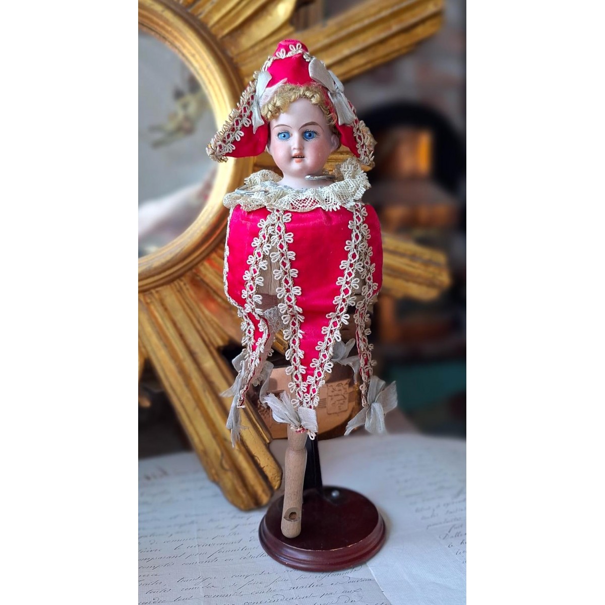 I det 18. og 19. århundrede var marotten udbredt rundt i Europa. Denne marotte er fra 1800-tallet. Dukken er med glasøjne og hår. Tøjet er håndlavet, og har slitage rundt omkring. Der hænger små sløjfer i kjortlens spidser, og i hatten - se billeder. I bunden af pinden er en fløjte, som også virker. Der forekommer aldersbetinget slitage.