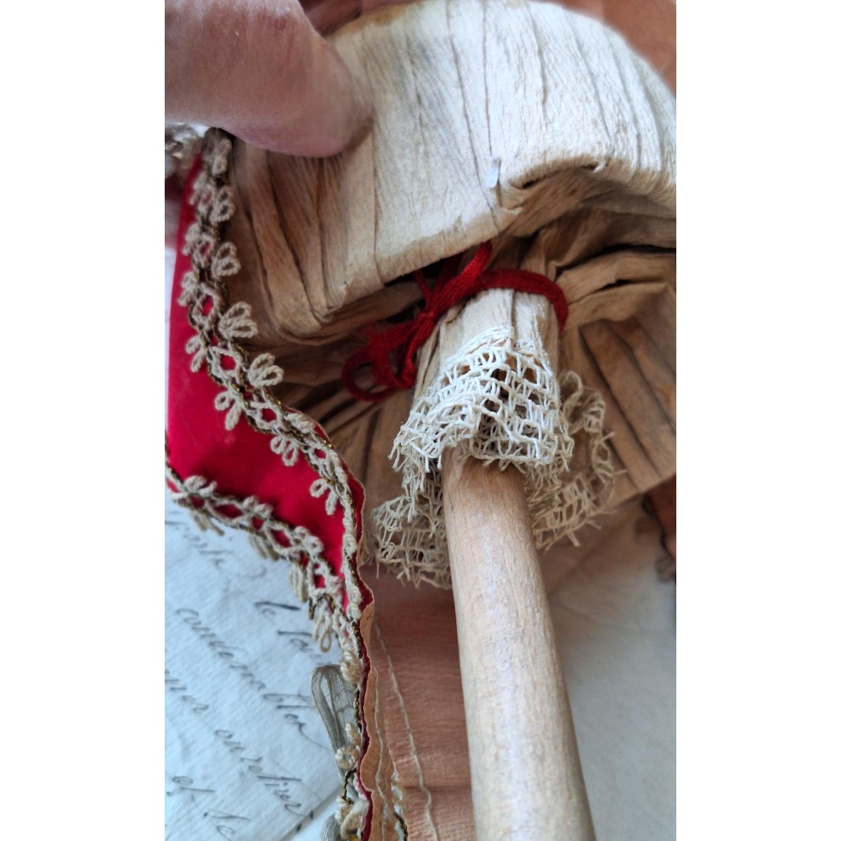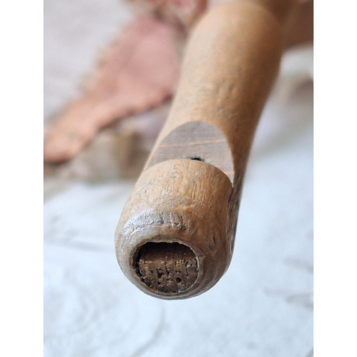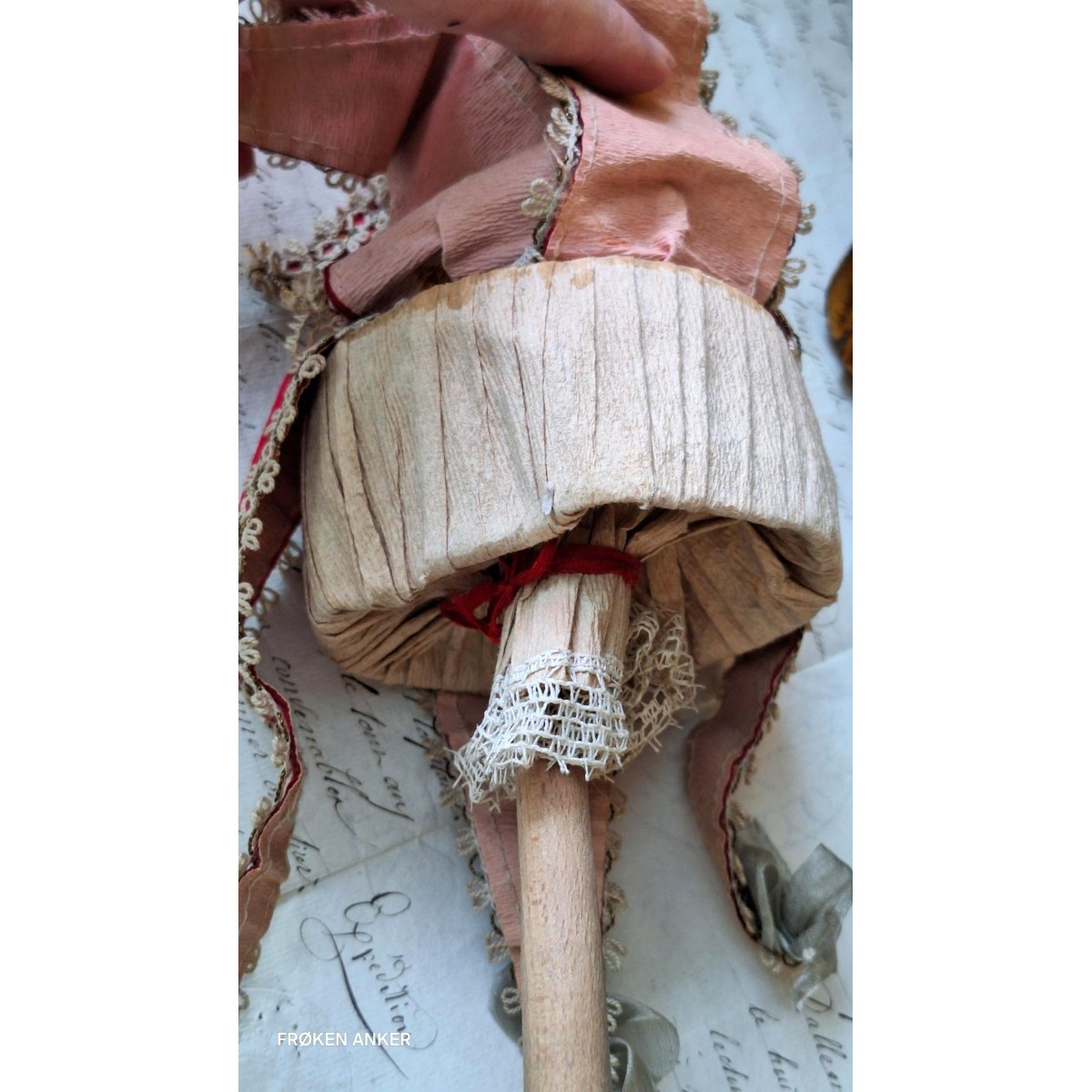 I det 18. og 19. århundrede var marotten udbredt rundt i Europa. Denne marotte er fra 1800-tallet. Dukken er med glasøjne og hår. Tøjet er håndlavet, og har slitage rundt omkring. Der hænger små sløjfer i kjortlens spidser, og i hatten - se billeder. I bunden af pinden er en fløjte, som også virker. Der forekommer aldersbetinget slitage.