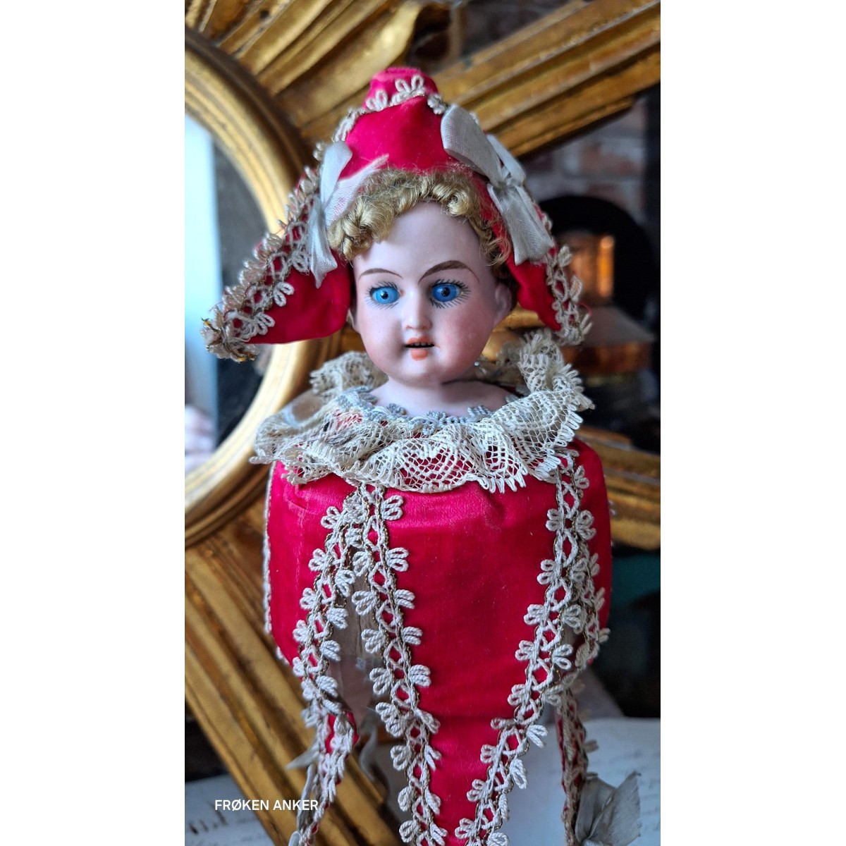 Se fuld størrelse I det 18. og 19. århundrede var marotten udbredt rundt i Europa. Denne franske marotte er fra 1800-tallet. Dukken er med glasøjne og mohairhår.... læs mere