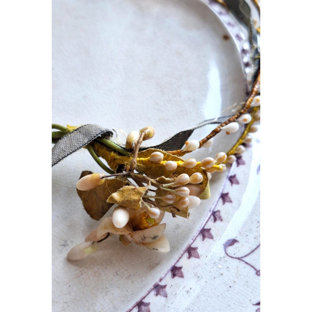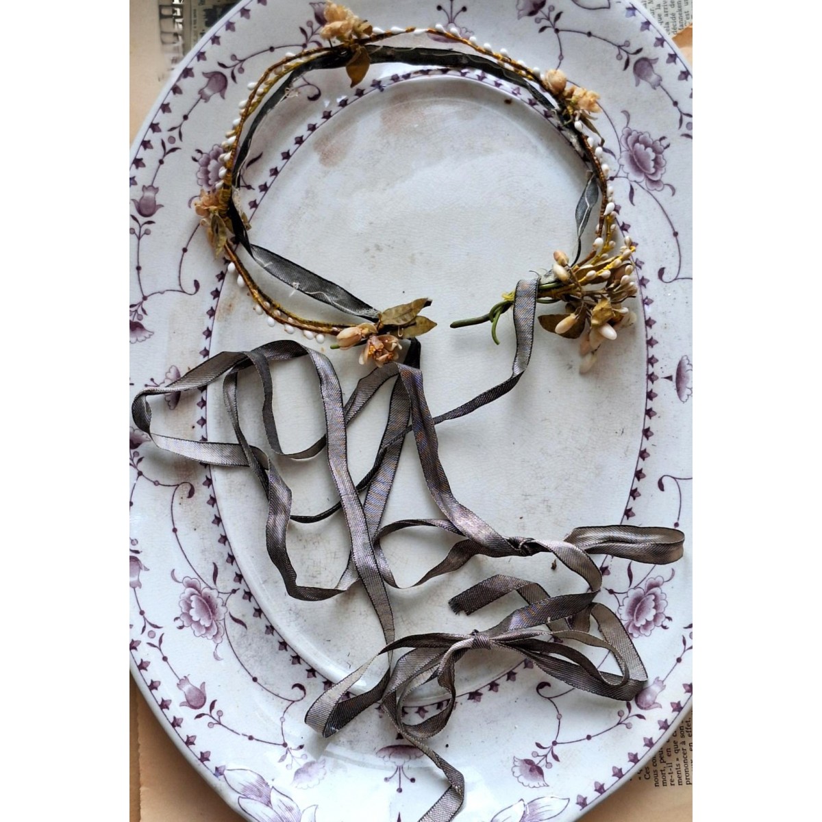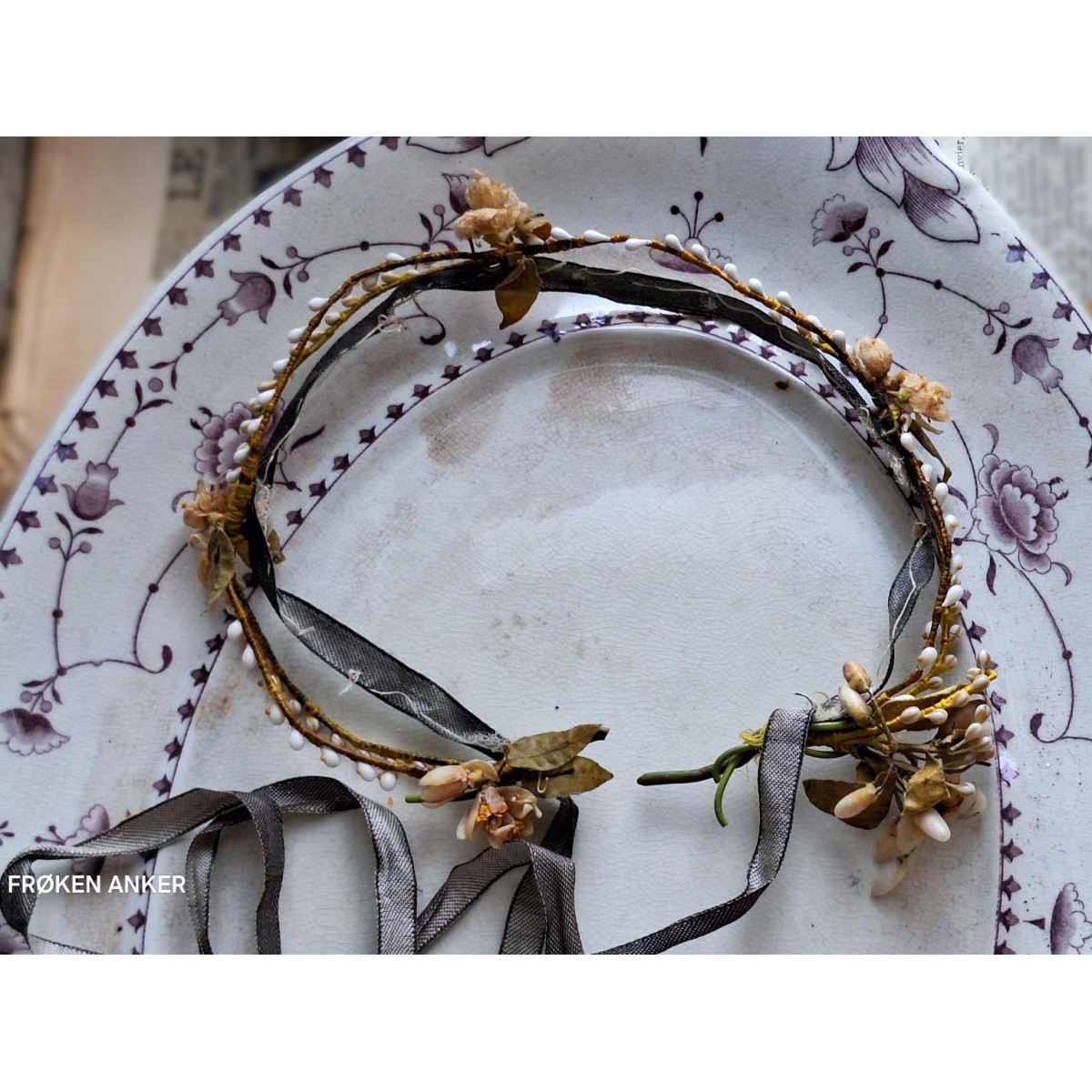 En smuk, antik fransk brudekrans med voksknopper og blomster. Brudekronen har et over 60 cm bånd, der kunne bindes om hovedet, eller flettes i håret. Enkelte af de sarte blomster har aldersbetinget brugsspor. Meget smuk og dekorativ...SE BILLEDER