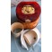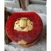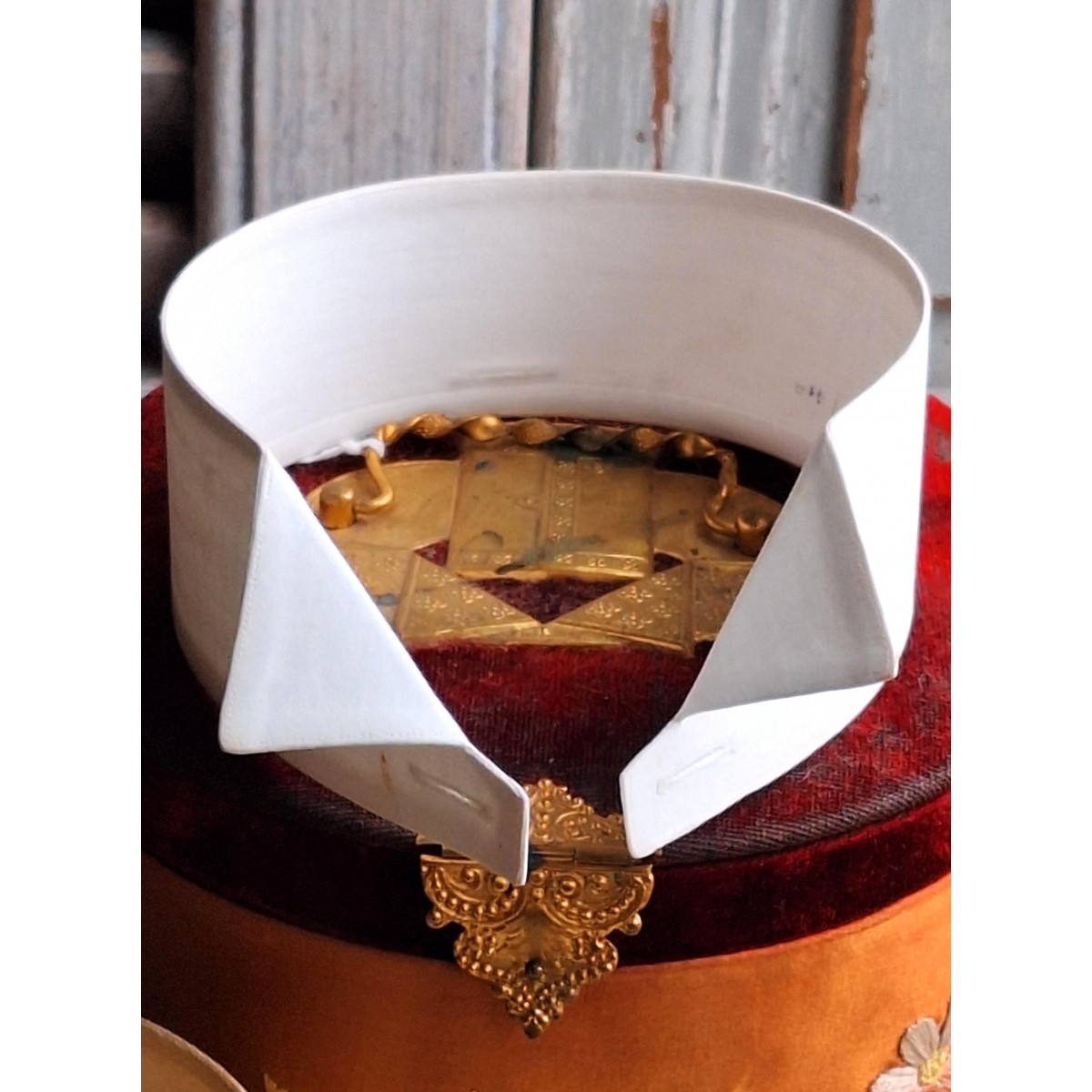 Smuk gammel håndlavet stofæske, der var til de hvide, stivede kraver og manchetter. Æsken er i rød velour, med et broderet silke-lignende stykke. På låget er et smukt emblem med krave og håndtag. Og en dekoreret lås. Der medfølger 1 krave og 2 manchetter. Manchetterne har to forskellige manchetknapper.