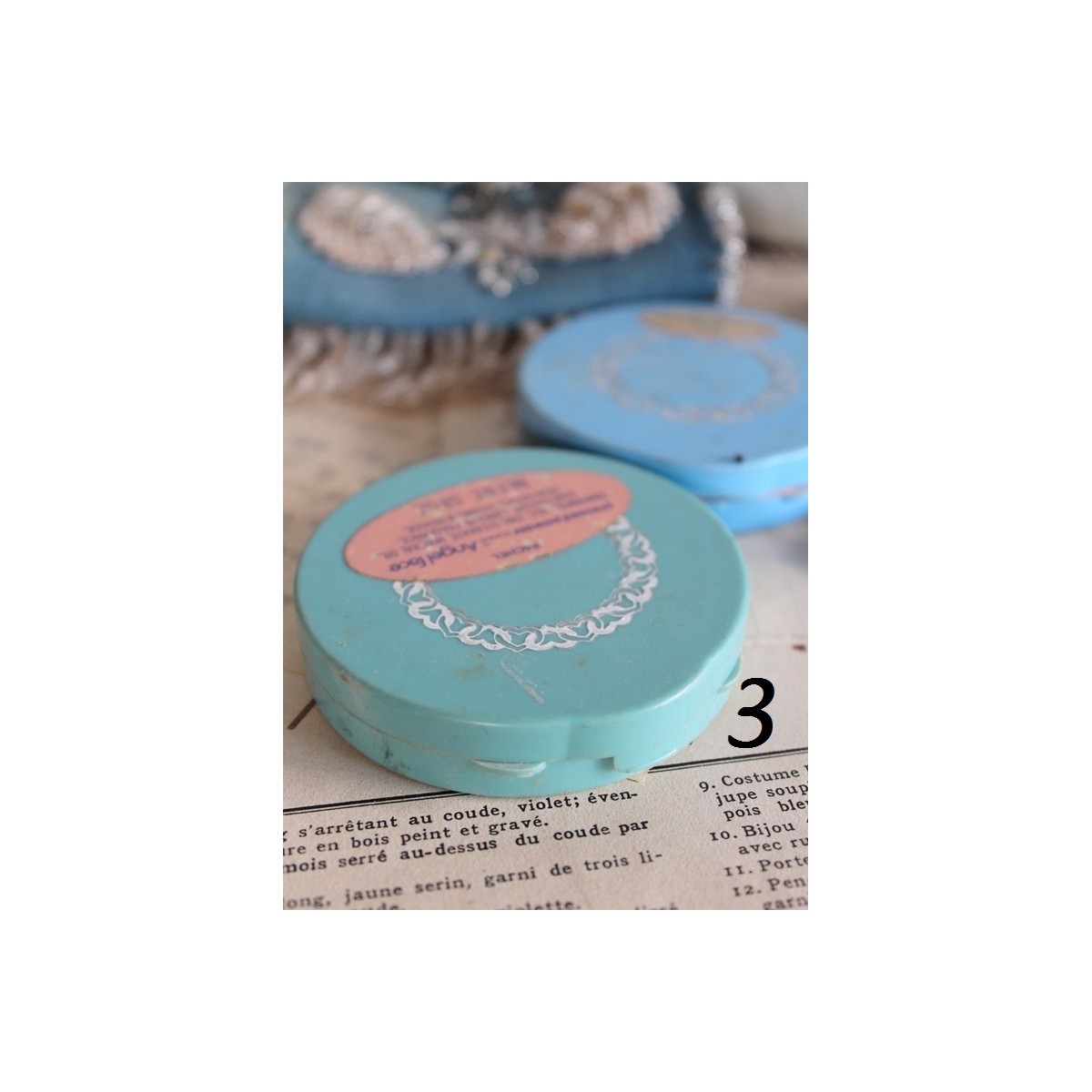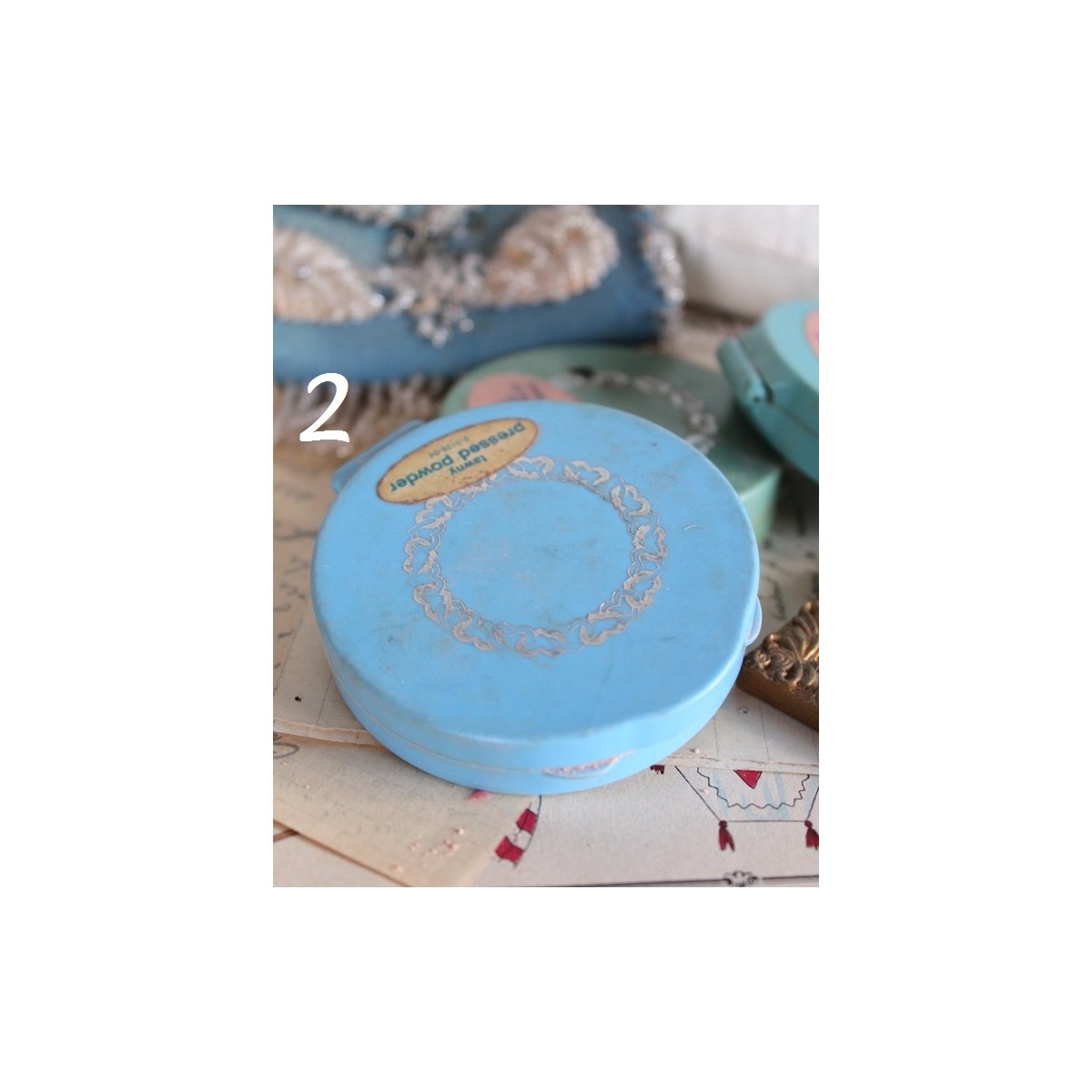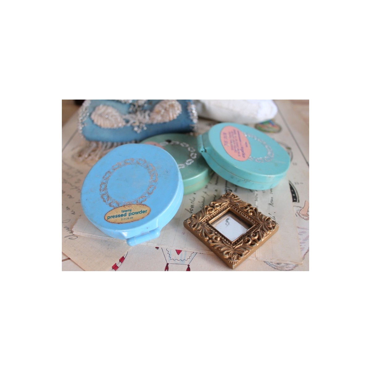 De gamle pudderæske er inkl. lidt pudder og spejl. En også med en gammel pudderkvast
