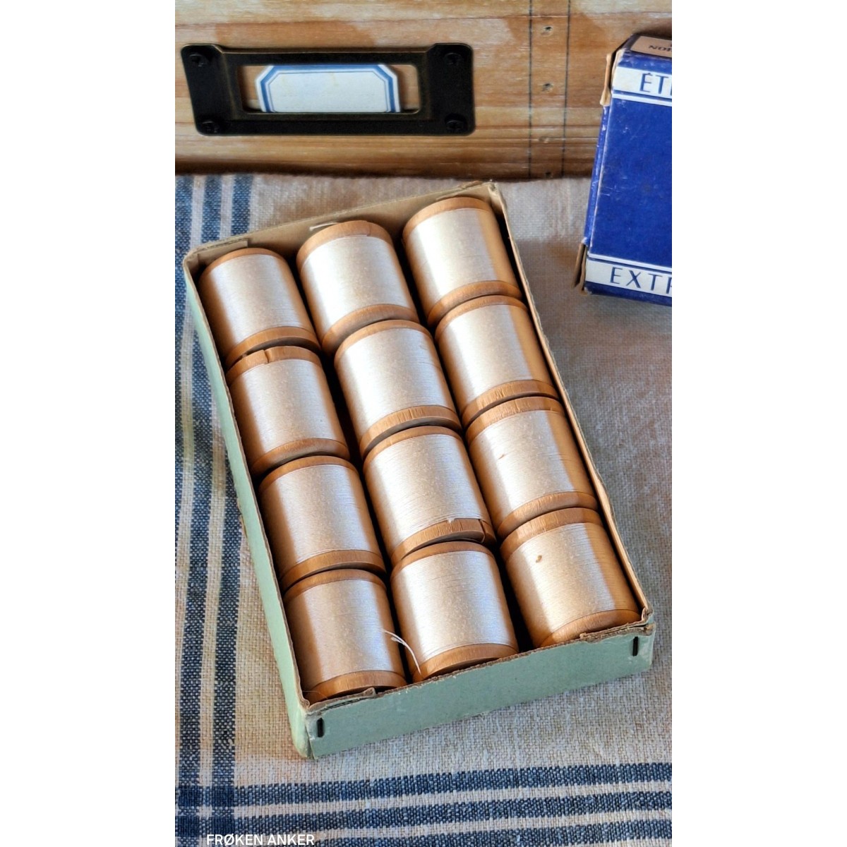 De 12 ruller sytråd stammer fra en gammel butik. De er på små trisser i træ, ligger i en lille æske. De har aldrig været brugt. Rigtig fine som dekoration.