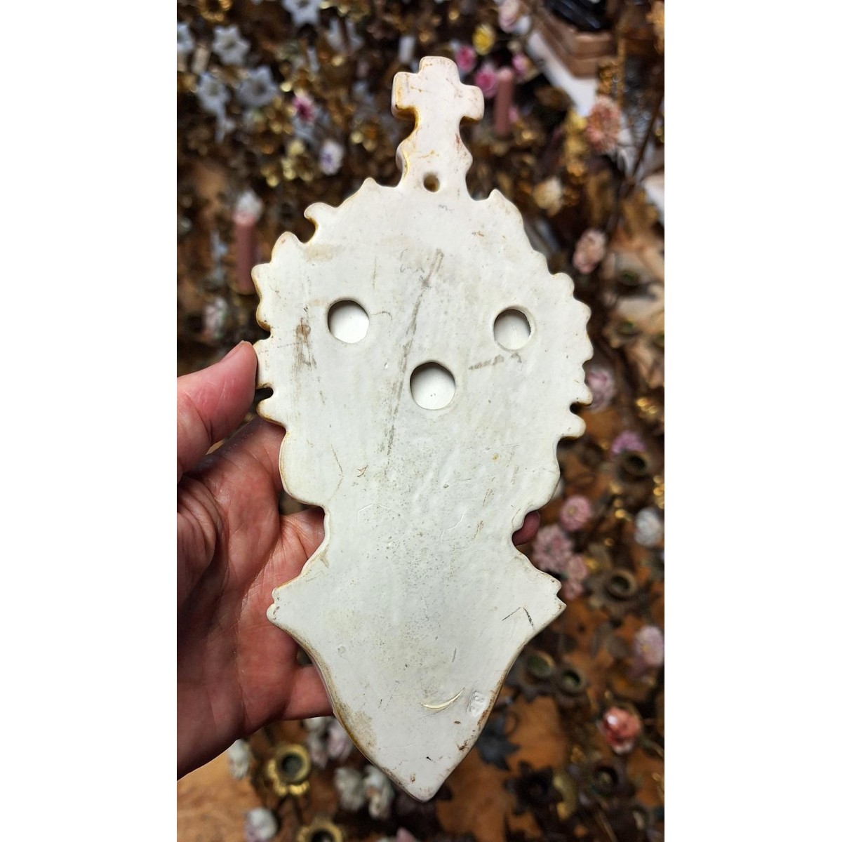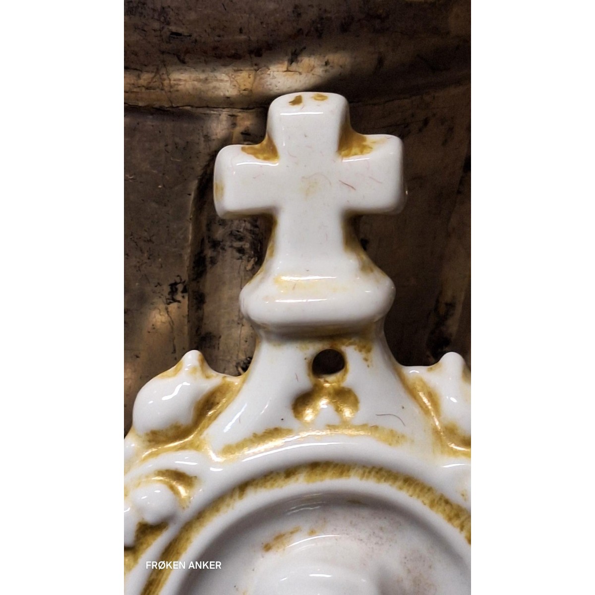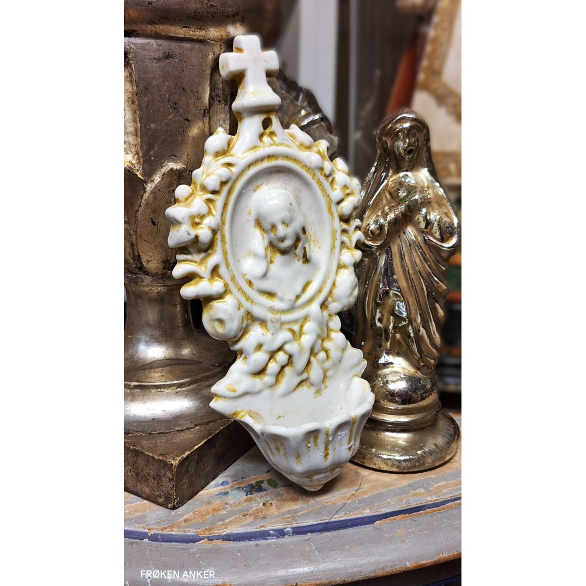 Meget flot 1800-tals vievandskar i kraftigt porcelæn. Jomfru Maria er motivet. Der er guld-skygger. Det er meget flot, og anderledes. Der forekommer let patina..SE BILLEDER