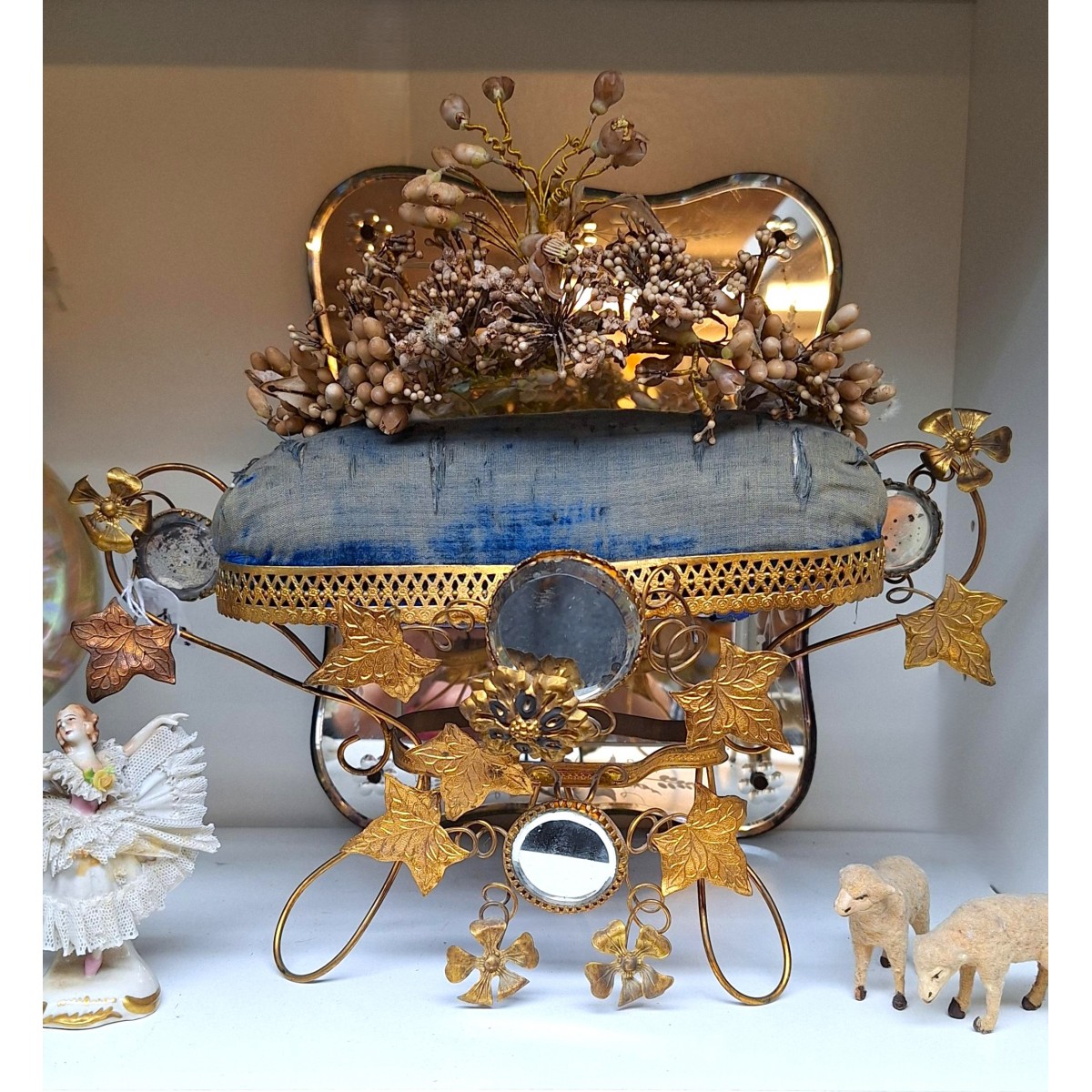 De antikke brudestole er fra franske brudeglober. Denne er sjælden, nemlig blå velour, der med årene er blevet slidt - se billeder. Puden sidder fast på en stol i forgyldt metal, med blomster, blade og spejle. Bagpå er den lettere skæv, med det hele kan reguleres med benene. En fin, original og dekorativ genstand. Brugsspor forekommer.