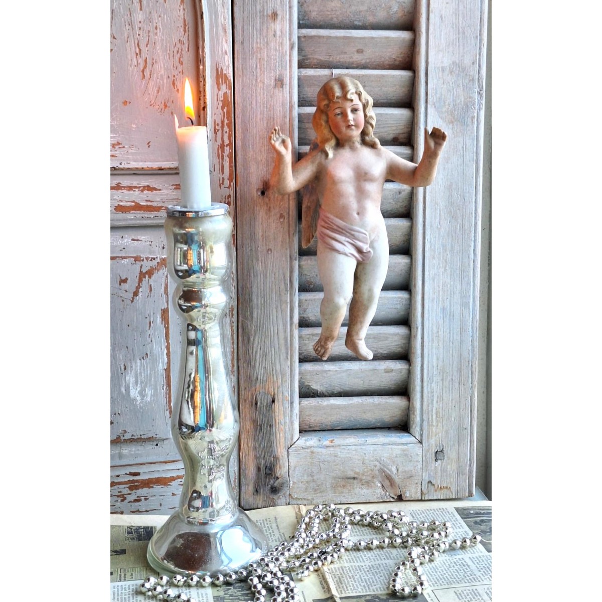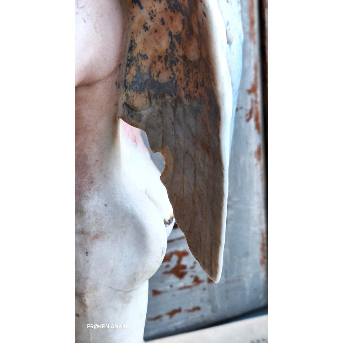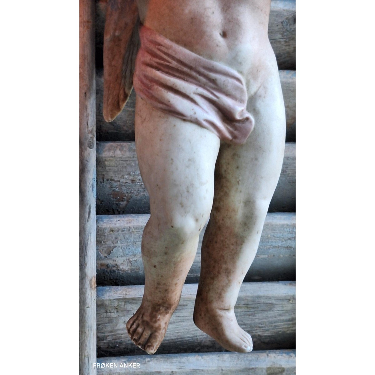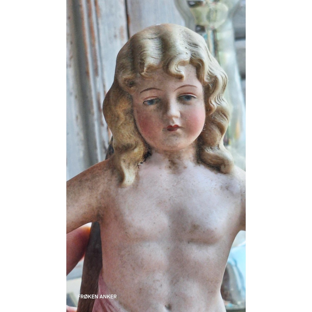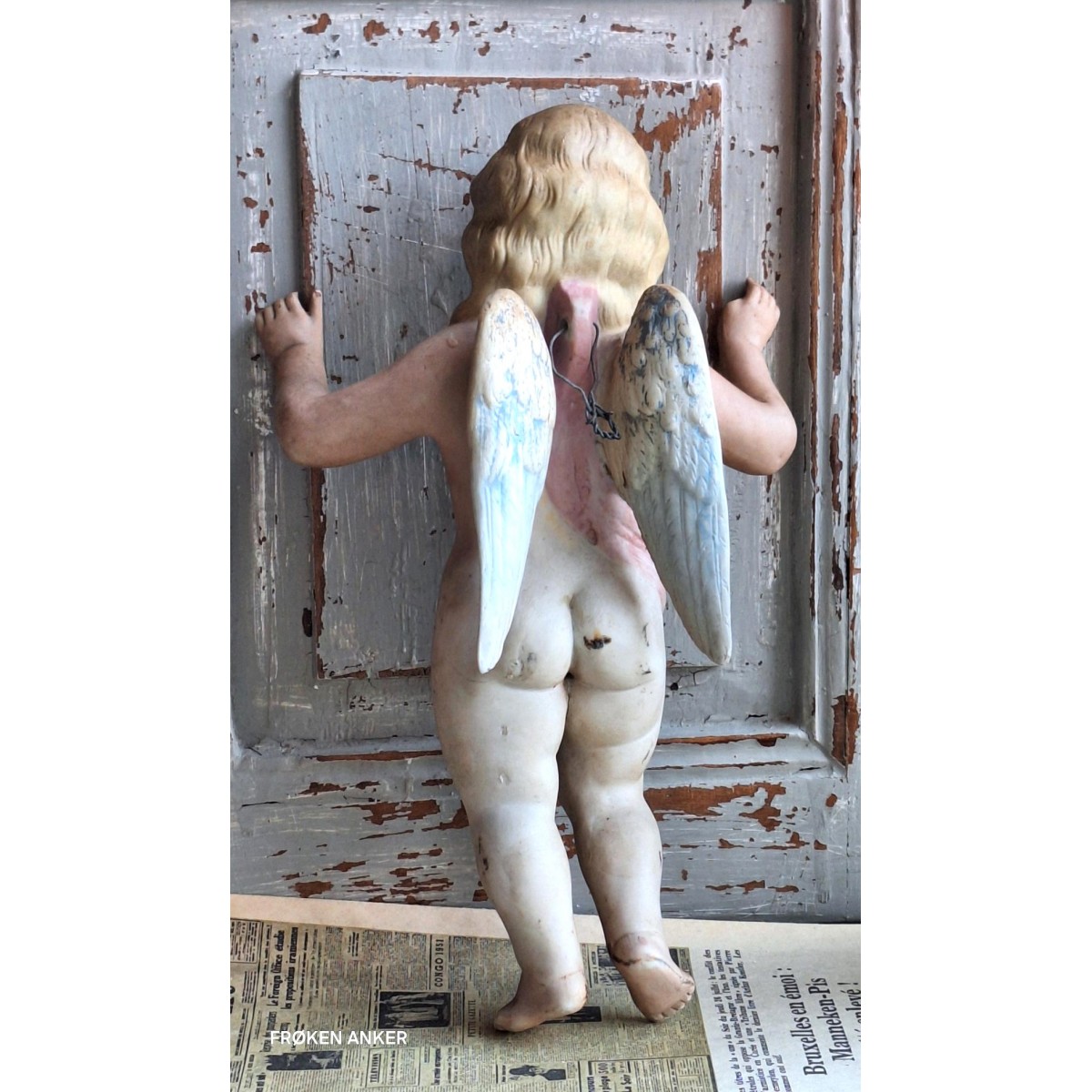 Gammel engel i bisquit, uglaseret porcelæn. Englen er fra 1800-tallet. Blev oprindeligt brugt til at pynte på fx. juletræet. Og til at beskytte de nyfødte, ved at hænge den over vuggen. Englen har en wire bagpå, så den kan hænge.