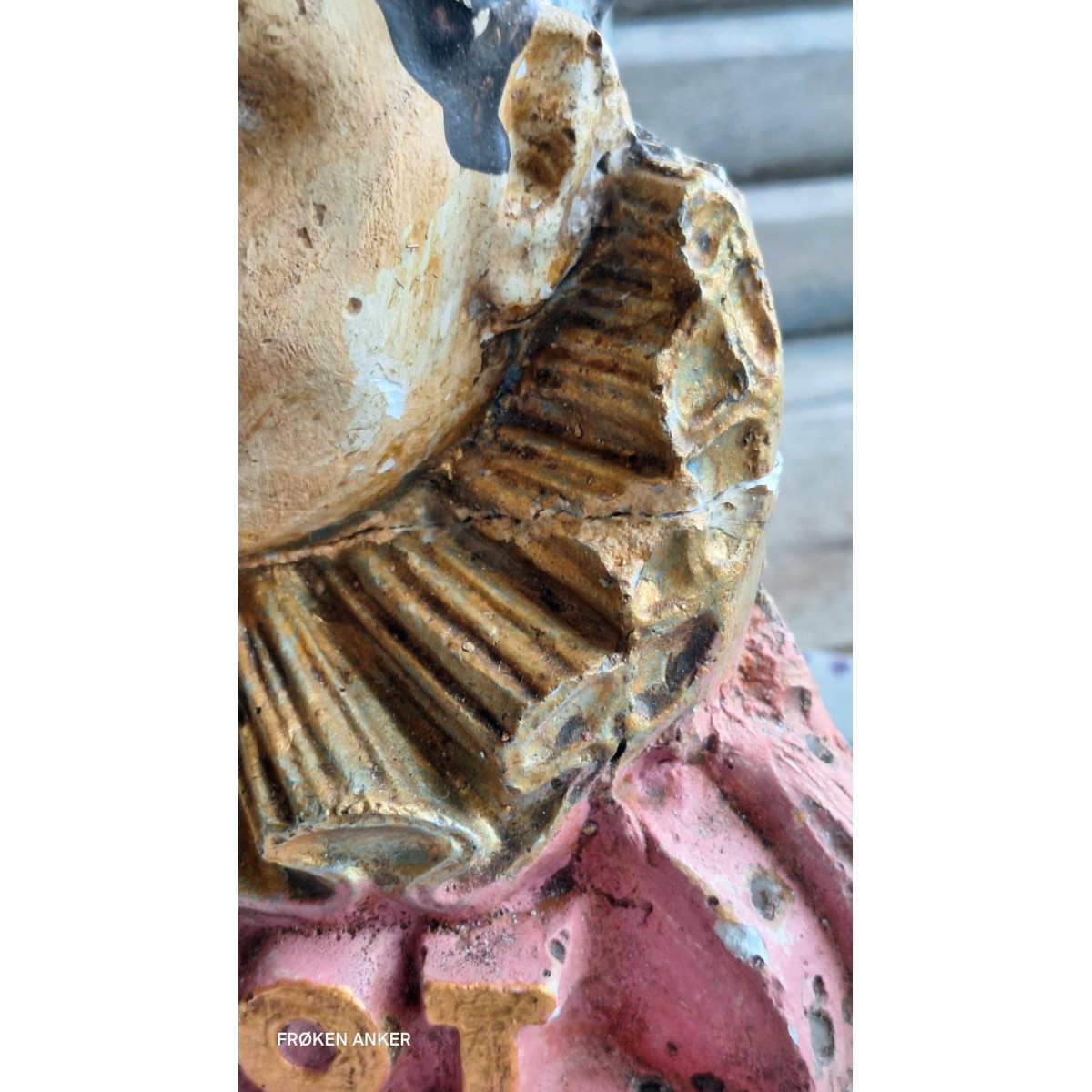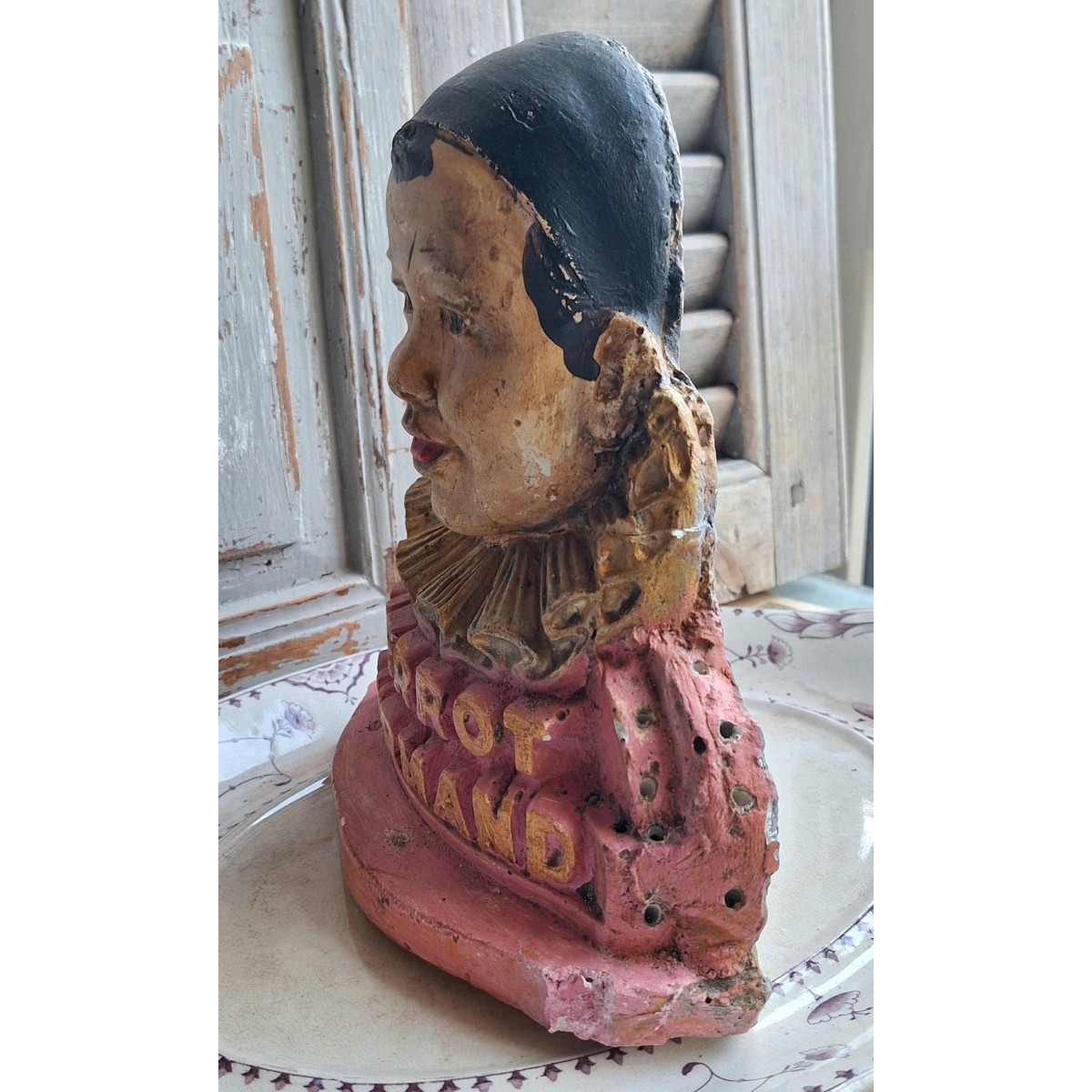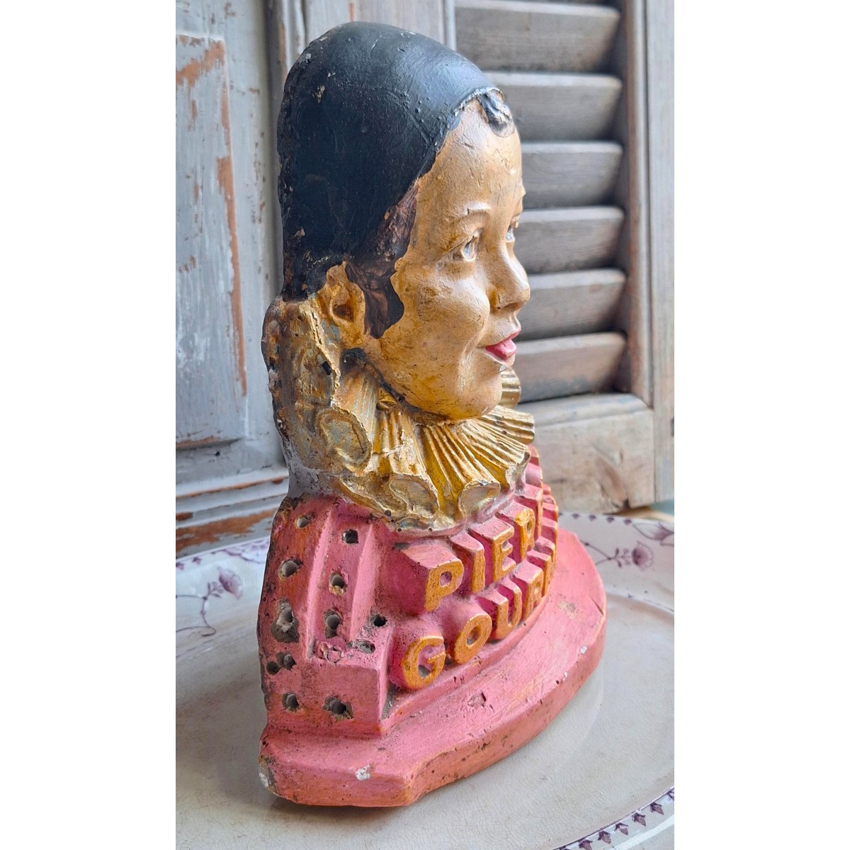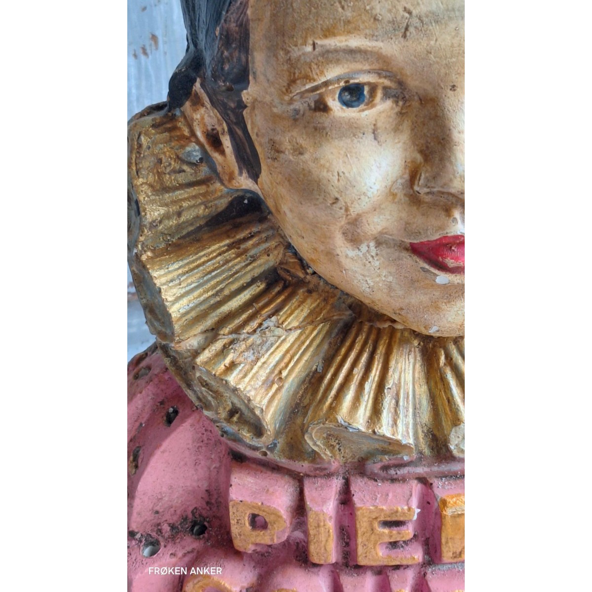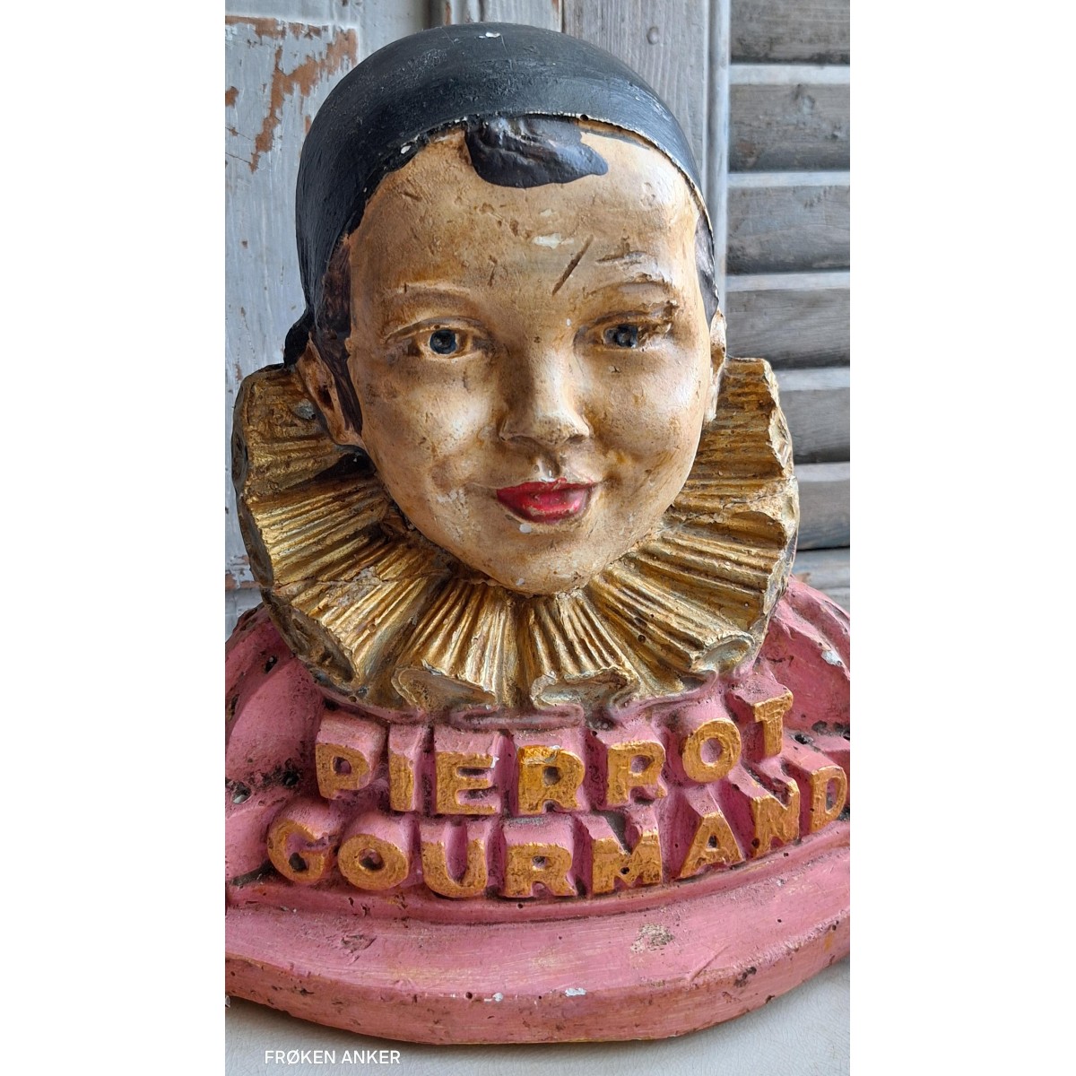 Har du en sød tand? Den gamle Pjerrot-buste har! Display'et har været til at stille slikkepinde i. Den er flot i en bogreol, mellem bøger mm. Pjerrot er i malet gips. Figuren er gammel, og har brugsrelateret patina og slitage. Den er på et tidspunkt blevet repareret. PRISEN ER SAT DEREFTER!