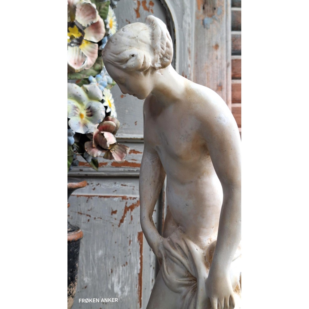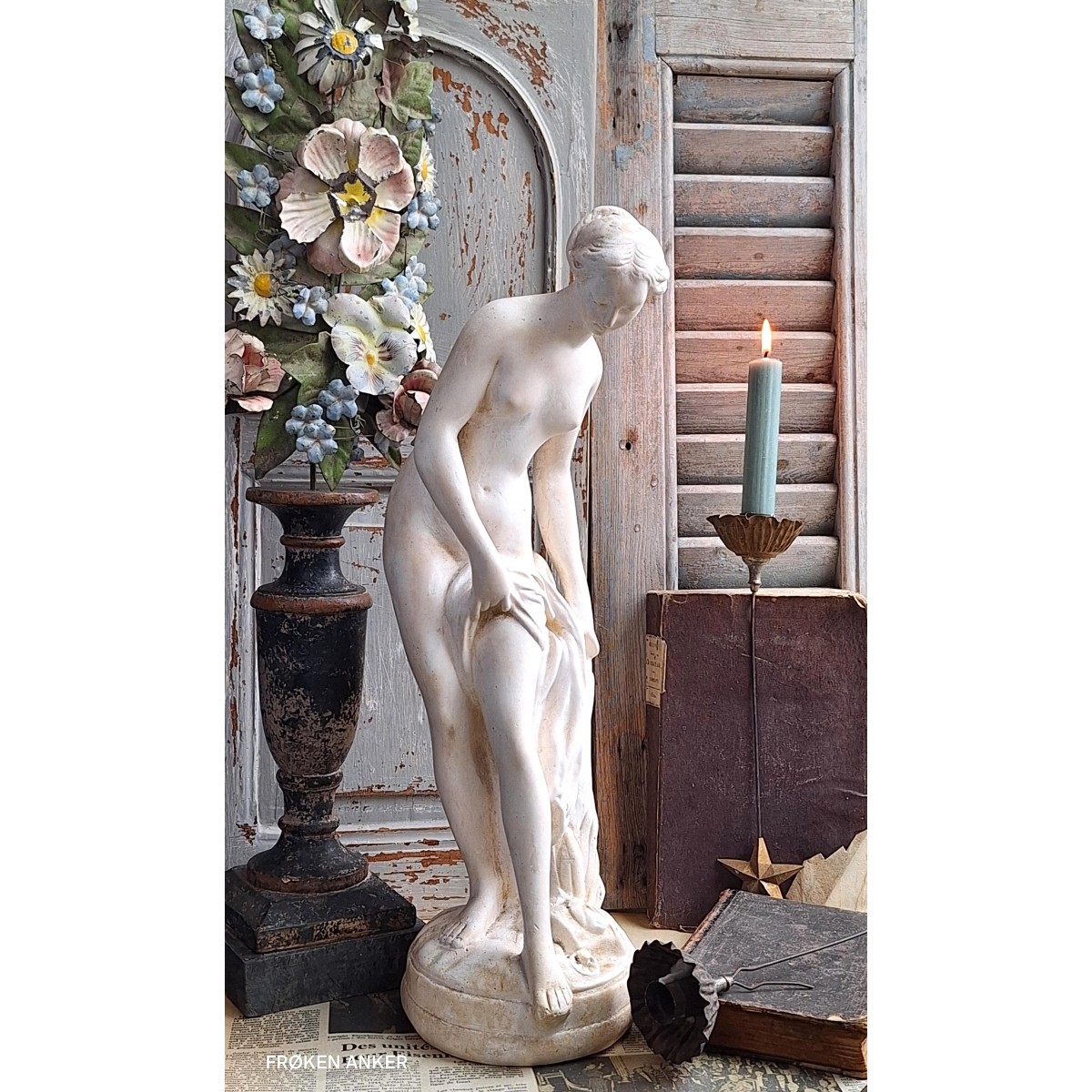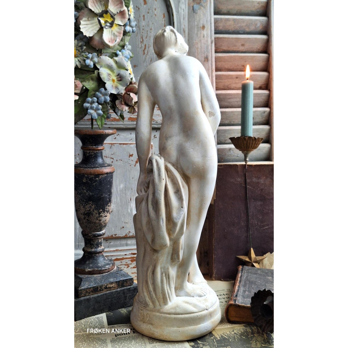 En meget dekorativ figur af en nøgen kvinde. Figuren er i gipslignende materiale. Den har aldersbetinget patina, og lidt overflade slitage...SE BILLEDER..