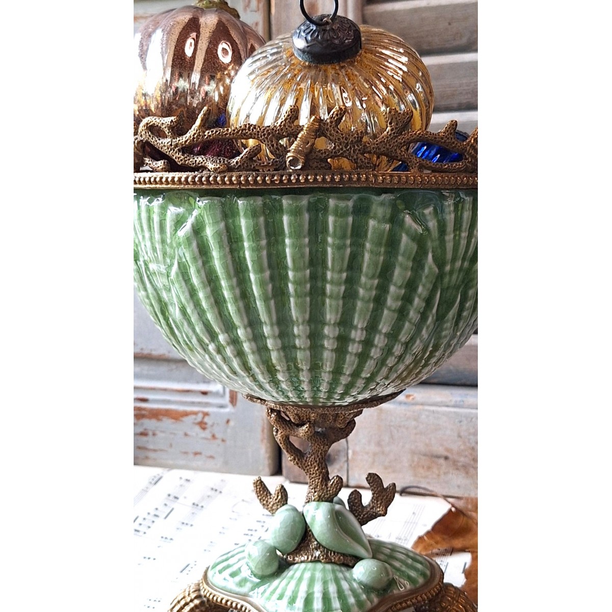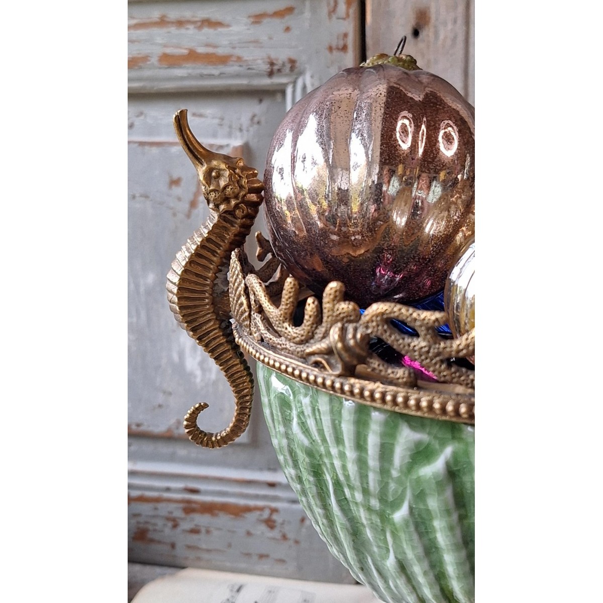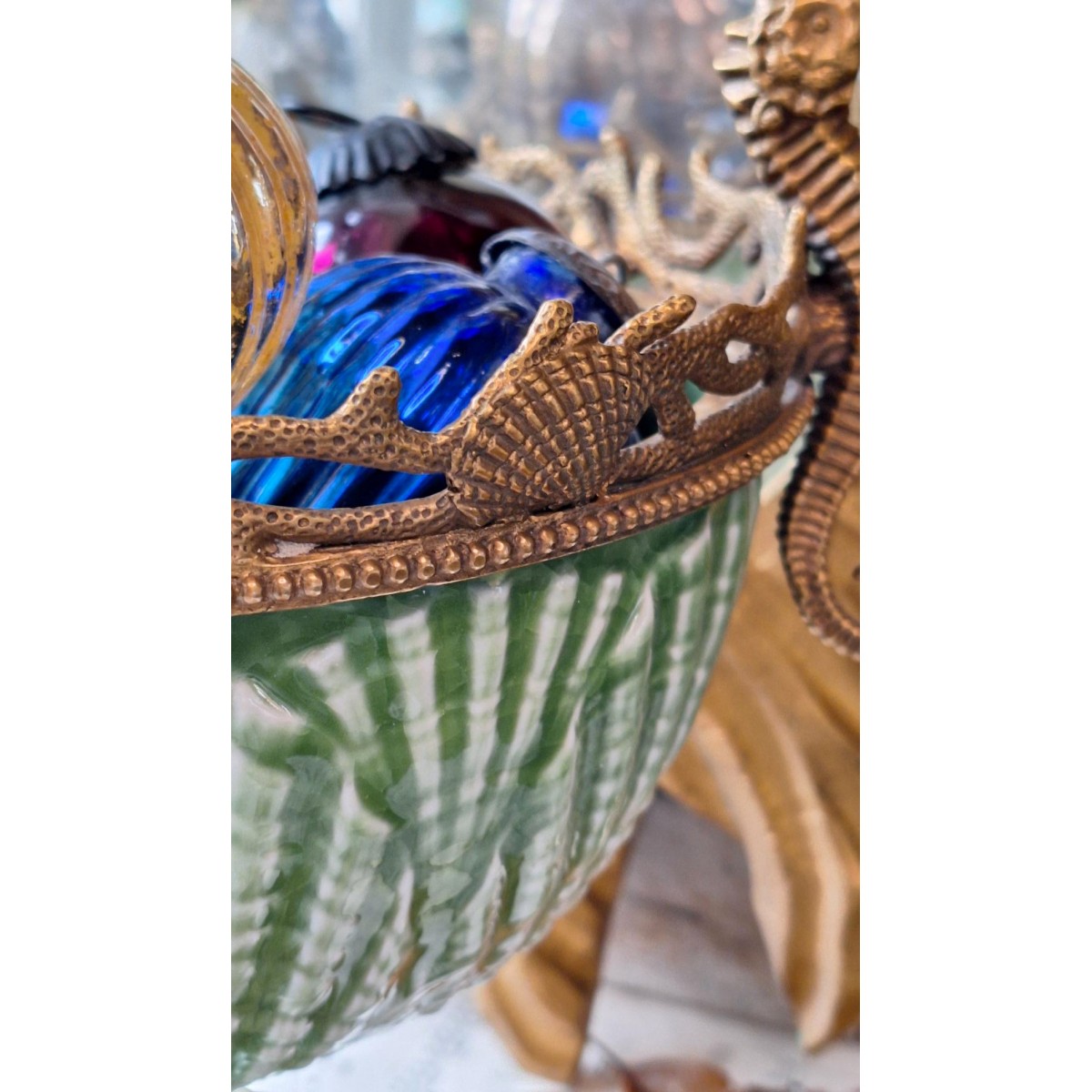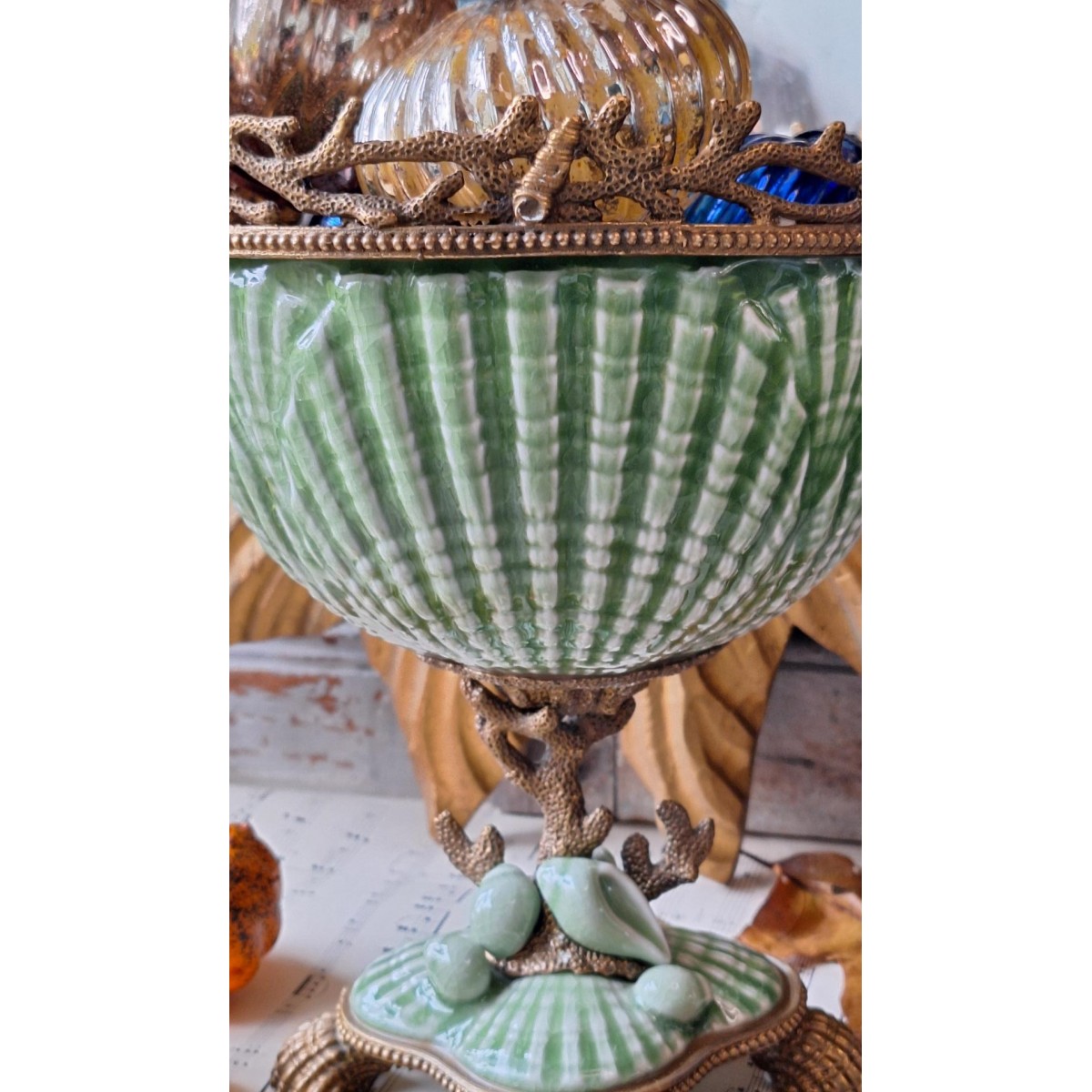 En meget flot, stor, og speciel, håndlavet muslingeskål i porcelæn og søheste i bronze. Skålen står på koraller i bronze, og har muslinge fødder....Læs mere
