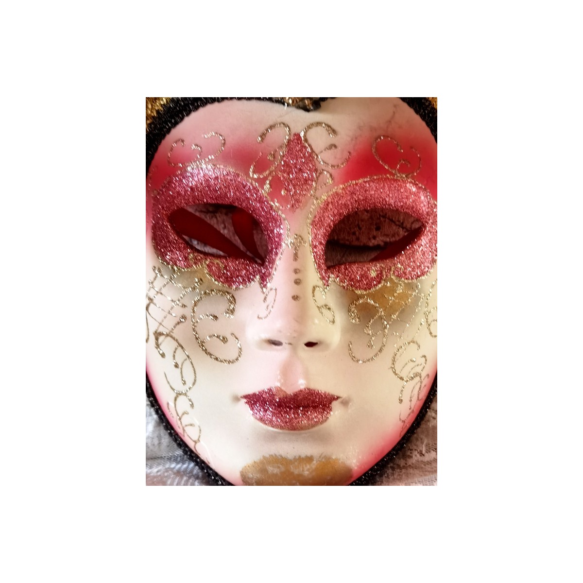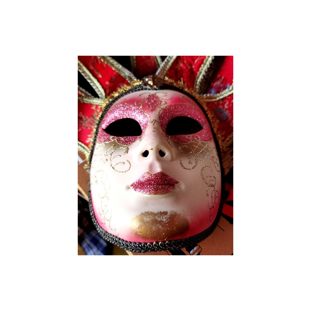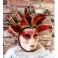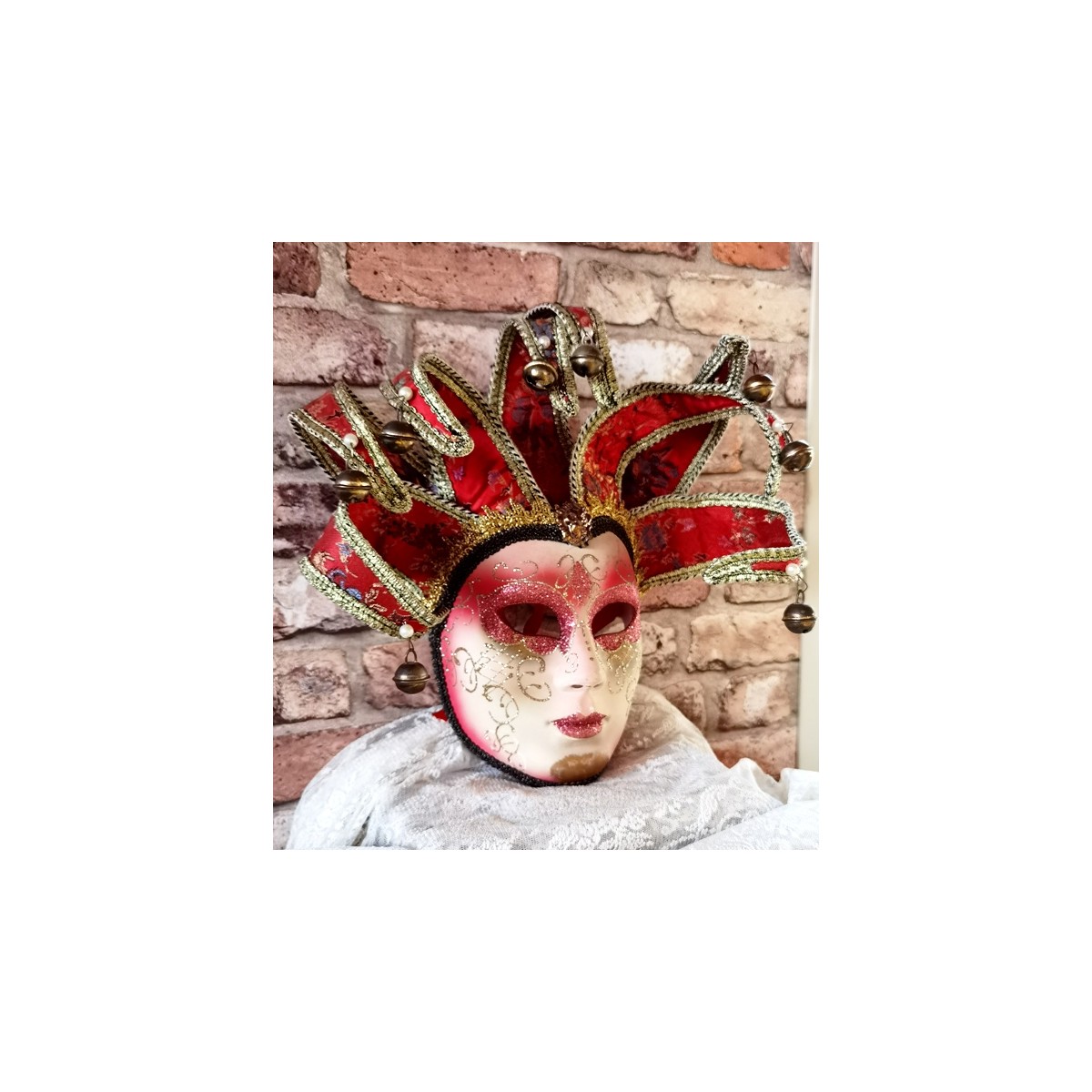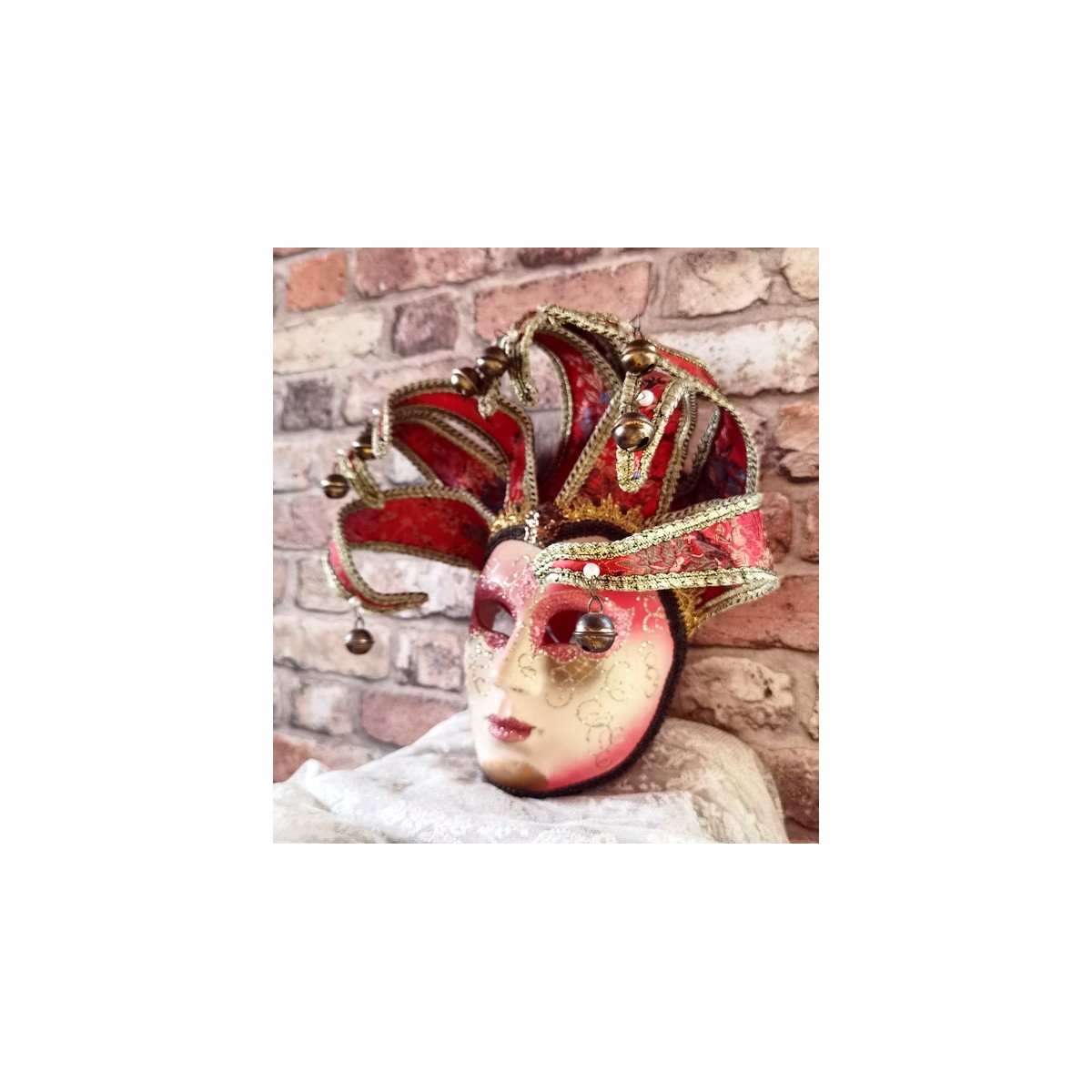 En eventyrlig smuk italiensk maske i papmaché lignende materiale. Masken er dekoreret med små perler og bjælder. I panden er en gylden 'broche'. Meget smuk og imponerende. Let patina forekommer.