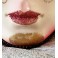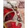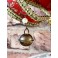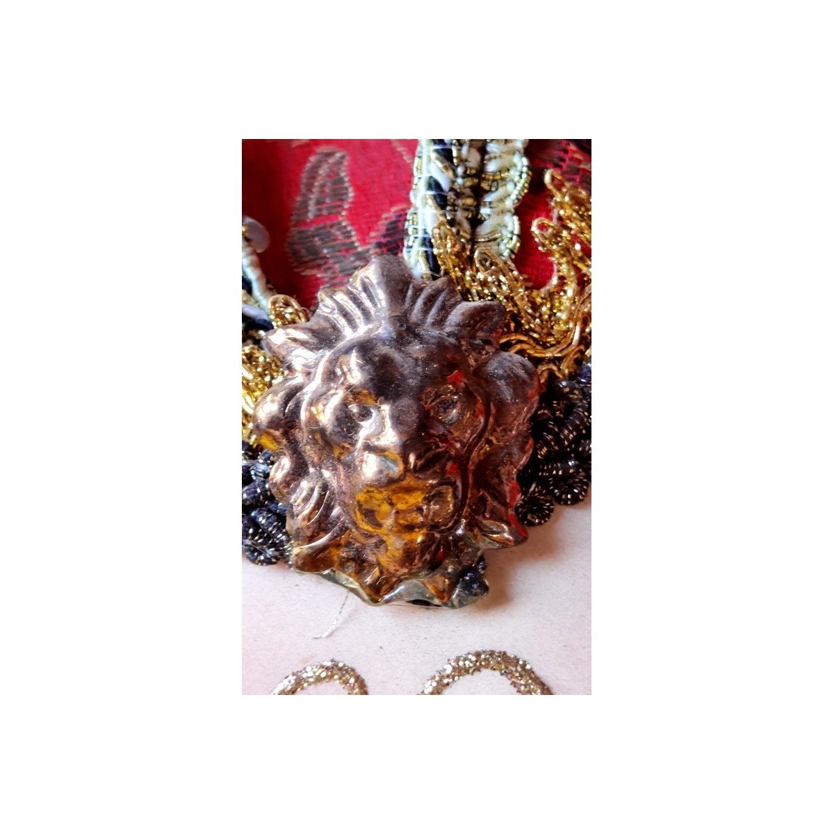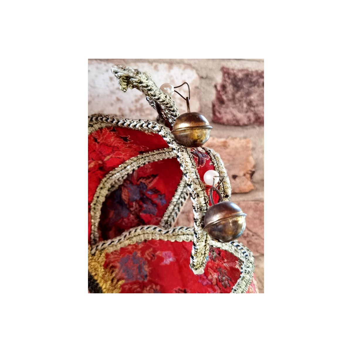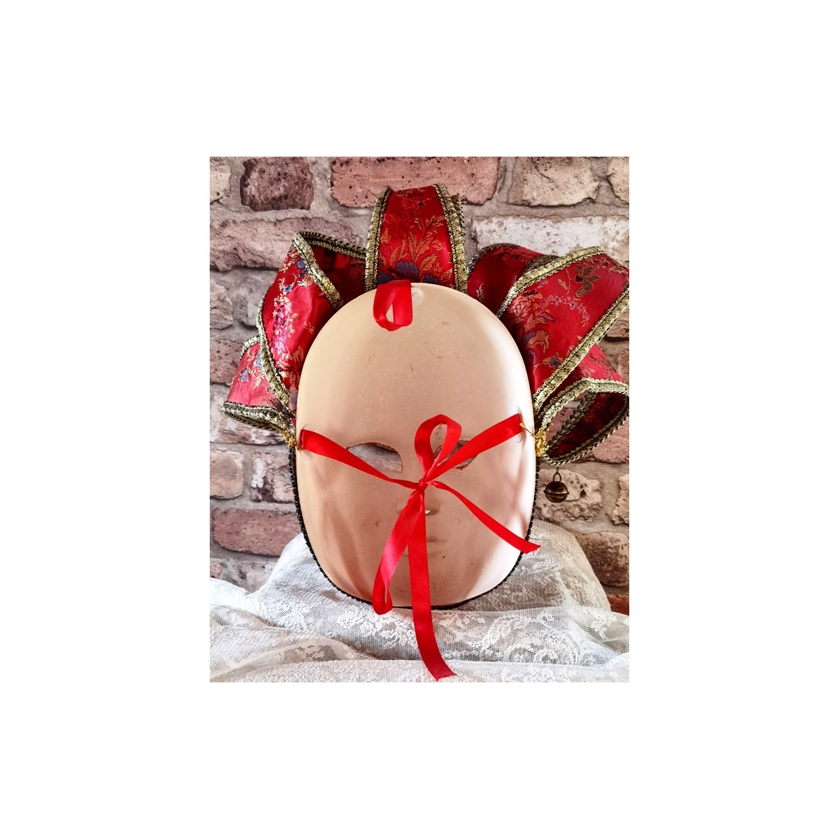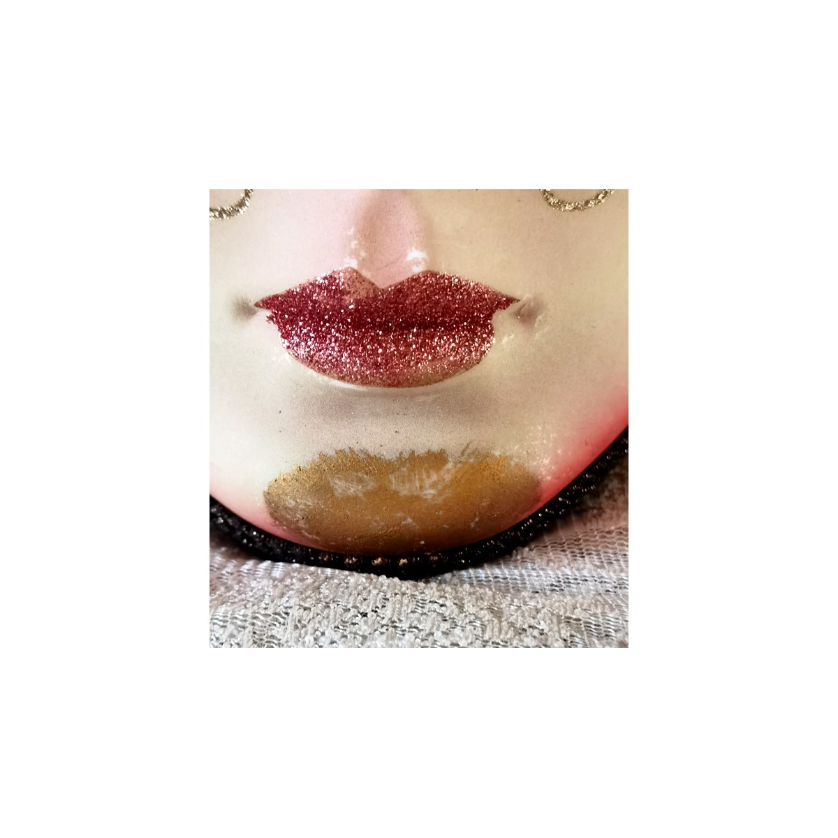 En eventyrlig smuk italiensk maske i papmaché lignende materiale. Masken er dekoreret med små perler og bjælder. I panden er en gylden 'broche'. Meget smuk og imponerende. Let patina forekommer.