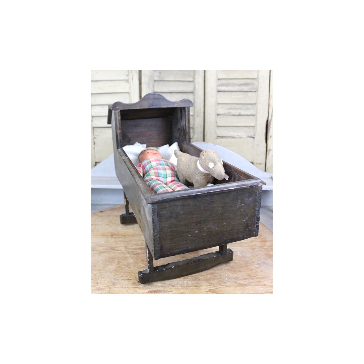 Den gamle dukkevugge er charmerende på sin egen primitive måde. Vuggen er ok til dekoration. Men ingen garanti til et barns leg. Brugsspor forekommer.