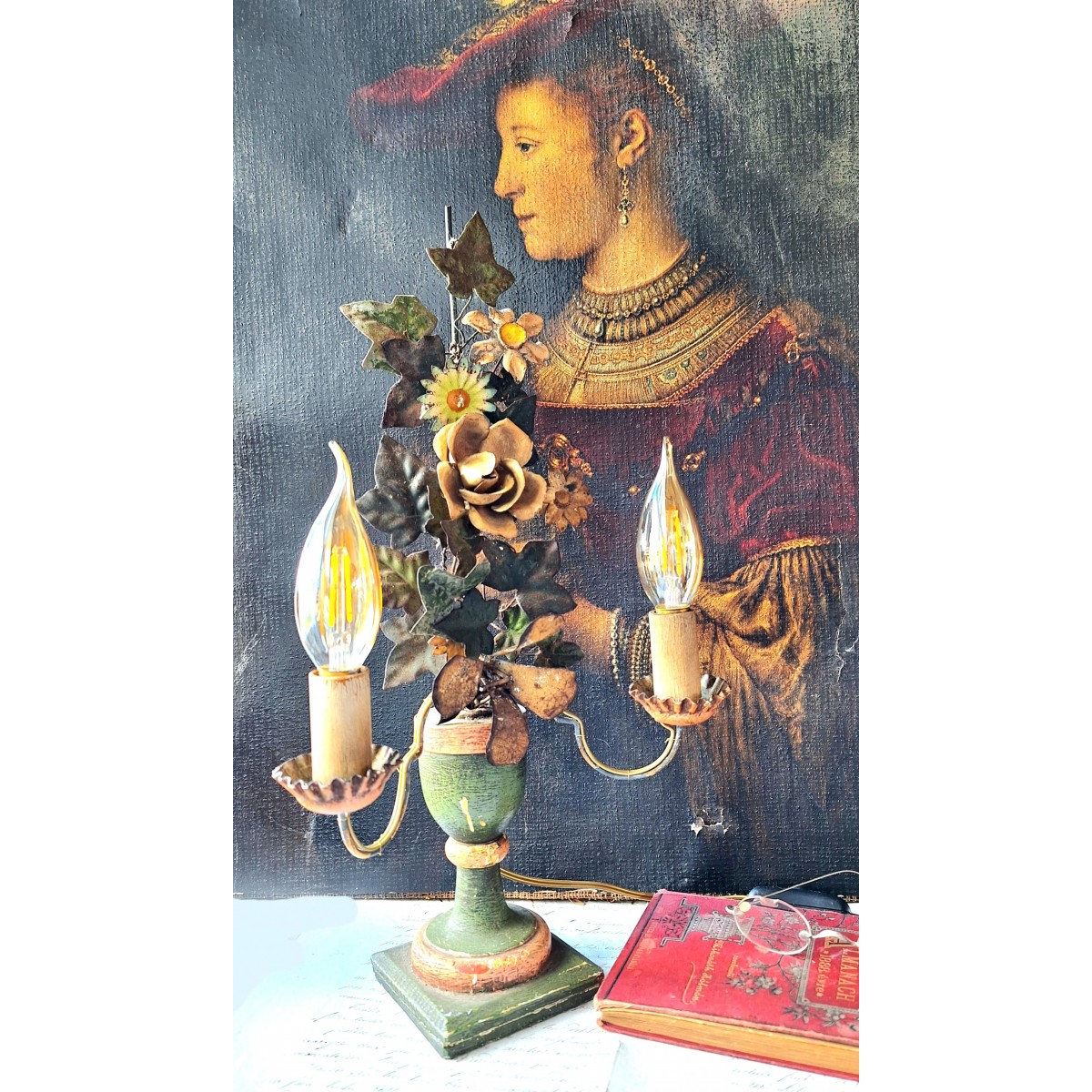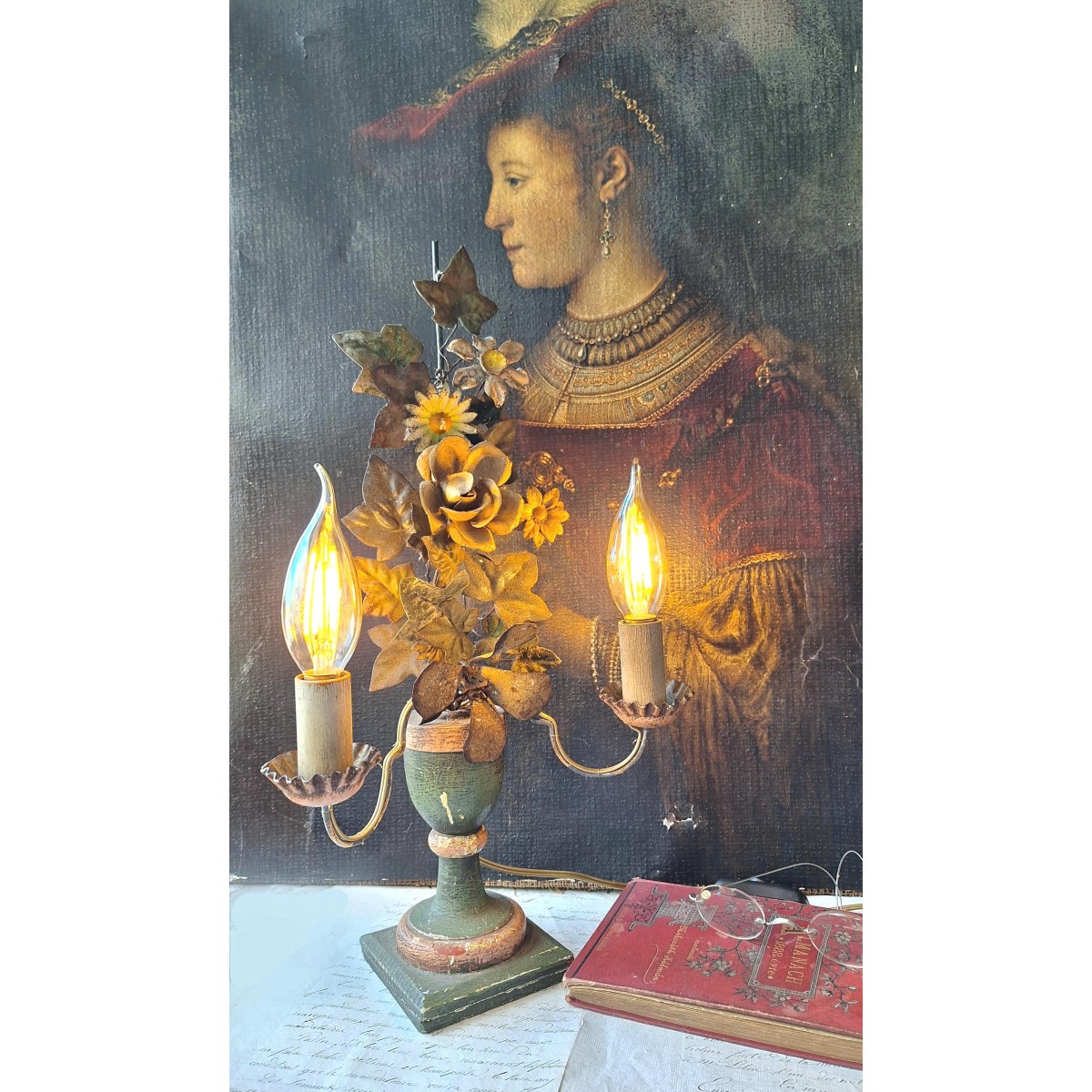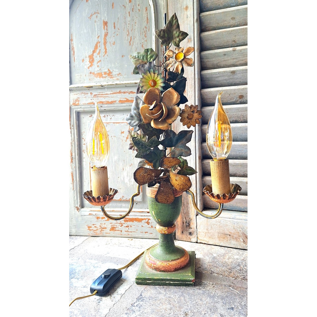 Se fuld størrelse Antik Italiensk Træ Vase Bord Lampe med Metal Blomster [L43cm]