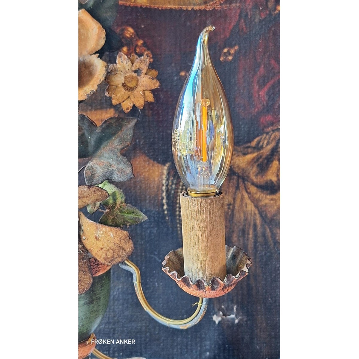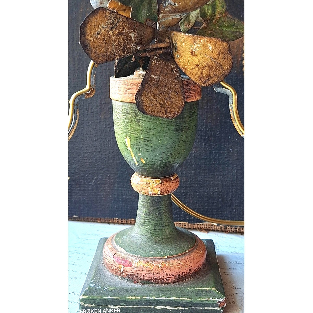 Antik italiensk træ vase bord lampe med metalblomster/blade. Vasen har en original grøn belægning. Lampen har to metal-arme, med hver en E14/lille fatning pære. Efter mere end 100 år er intet helt perfekt. Aldersbetinget brugsspor forekommer...SE BILLEDER..Ledning, stik og afbryder er ny-monteret, da lamper fra markeder oftest har fået det klippet af.