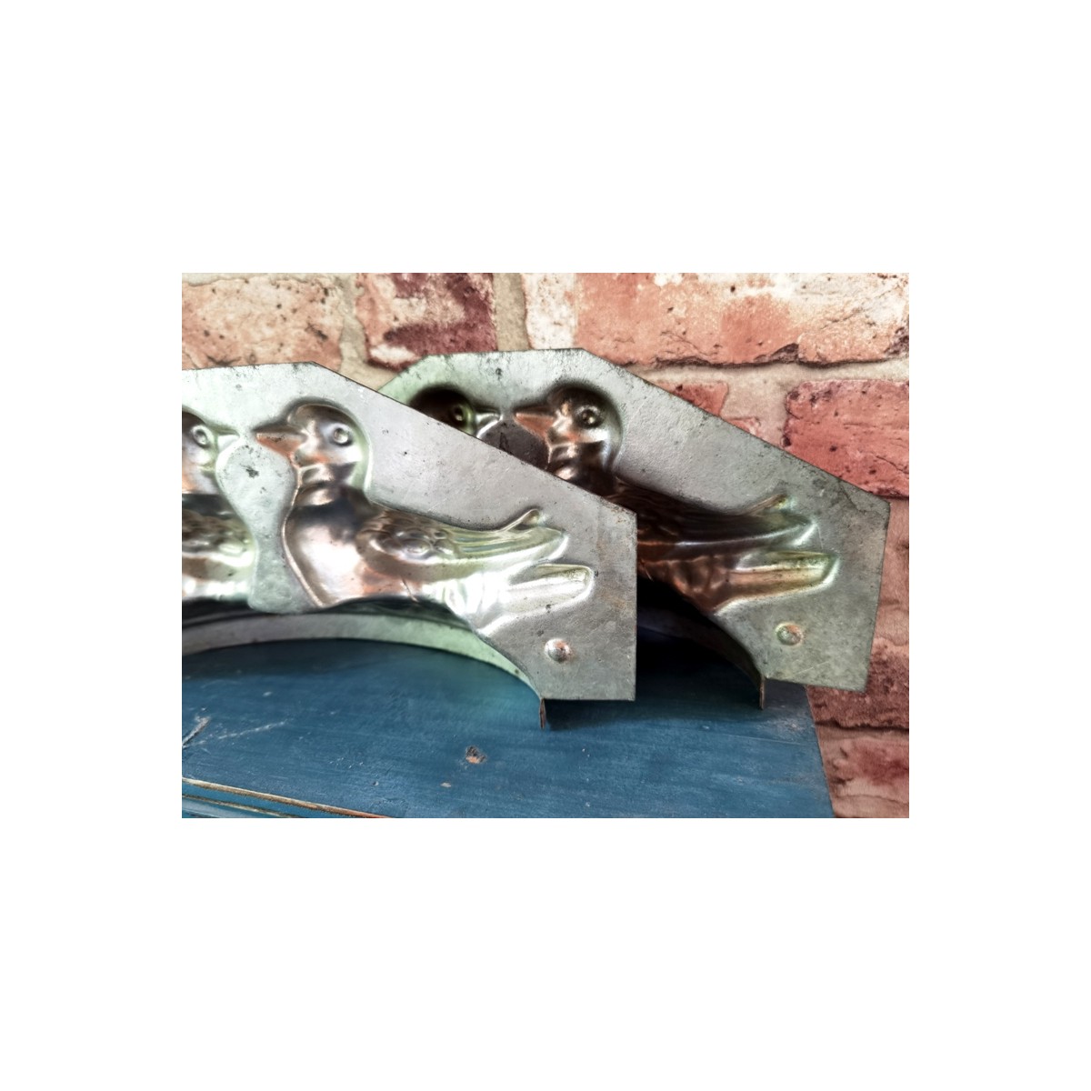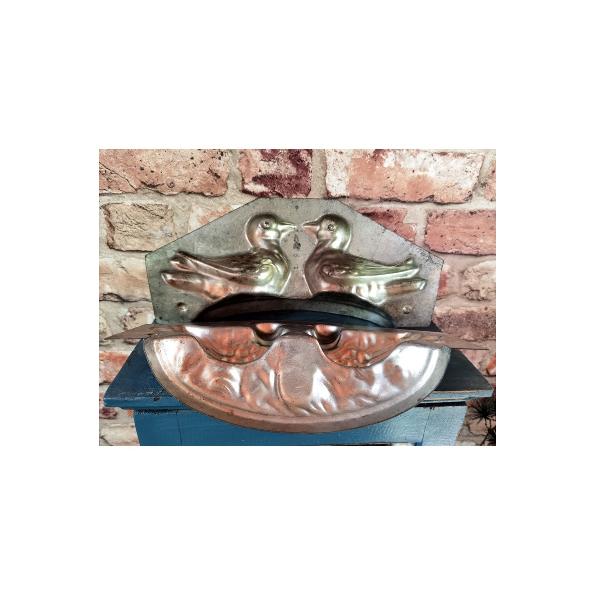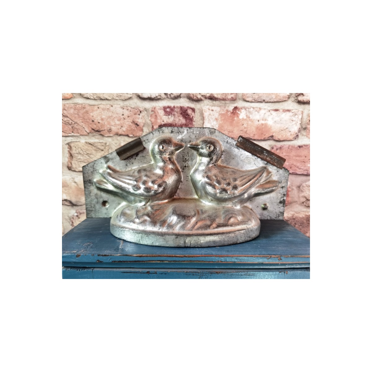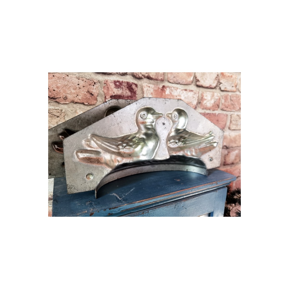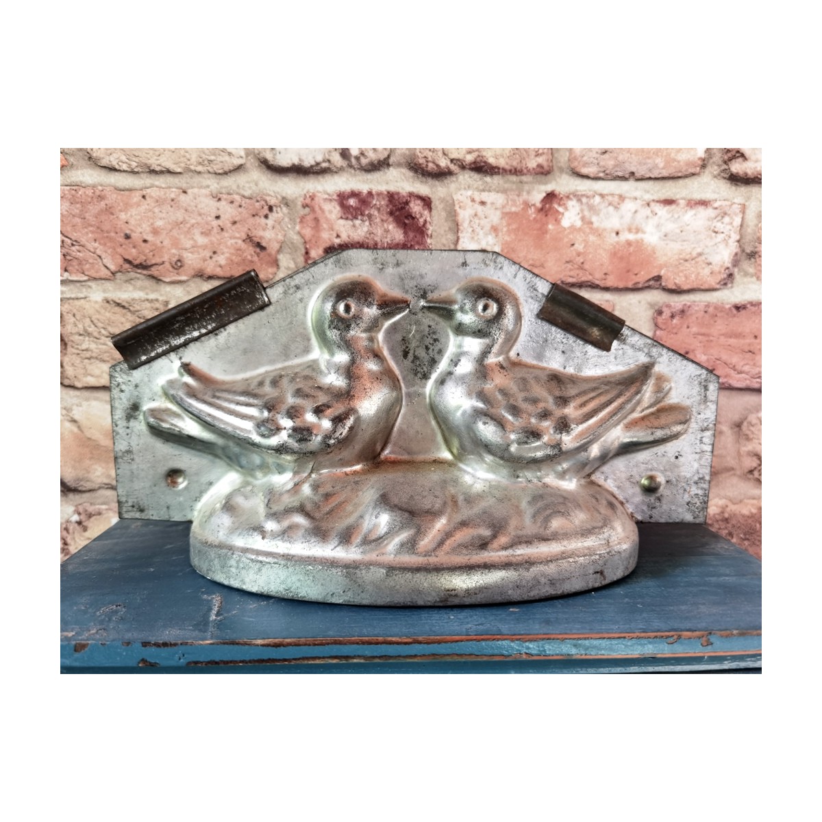 En stor og gammel dobbelt chokoladeform med et par juleduer. Duerne (lovebirds) i fx chokolade vil også pynte på en bryllupskage. Let patina forekommer...se billeder