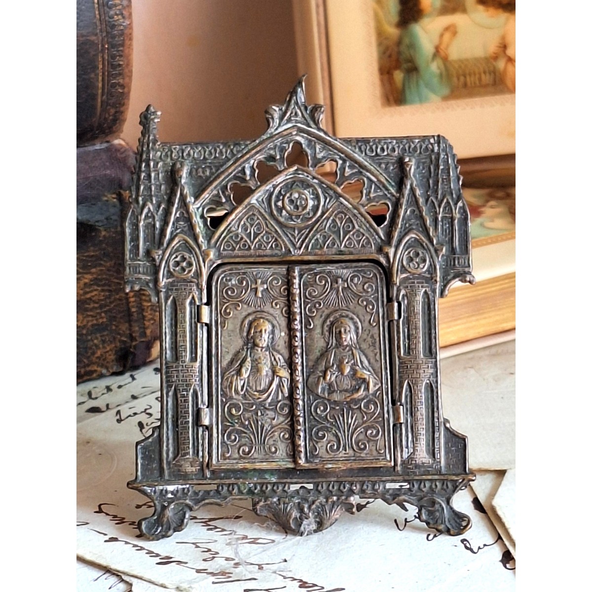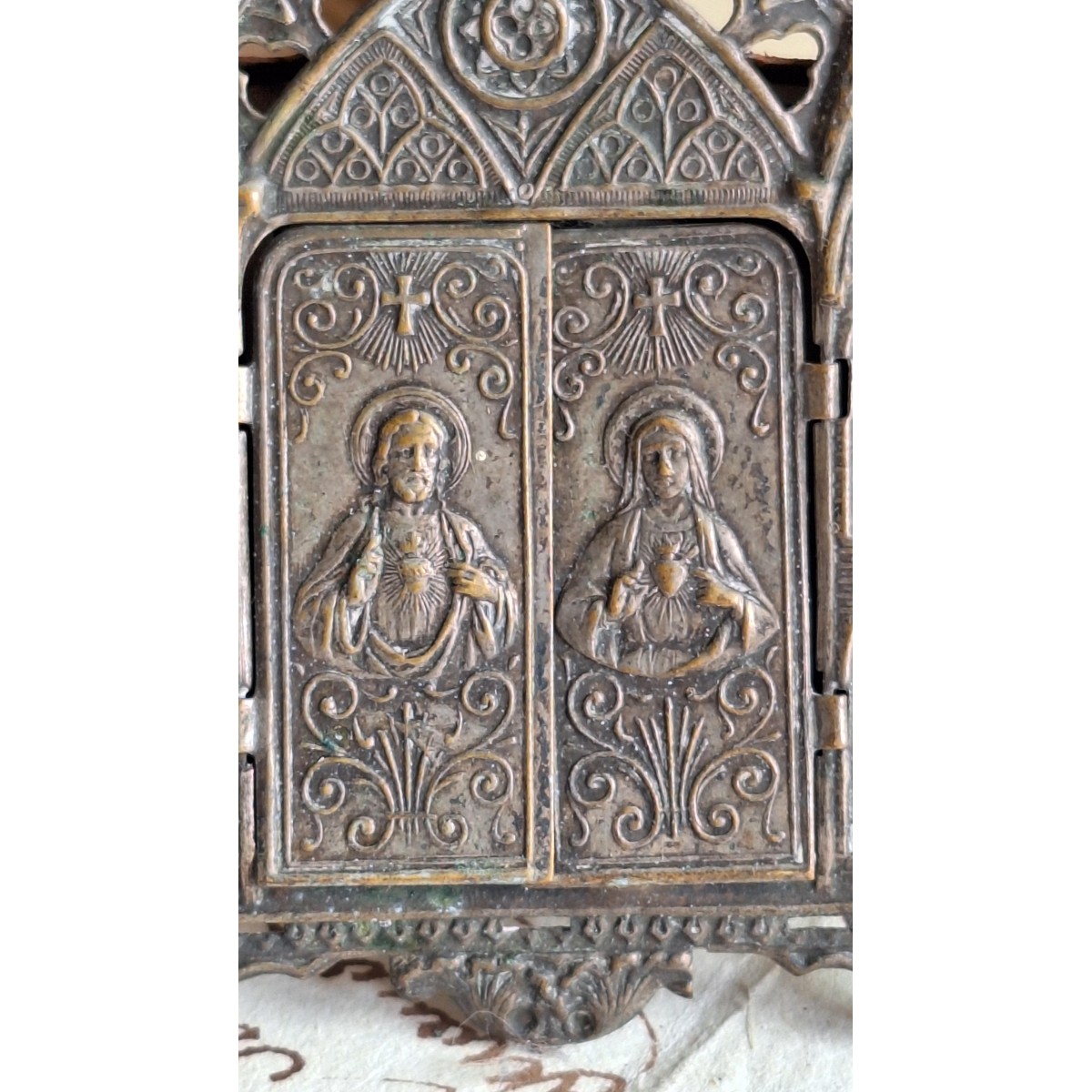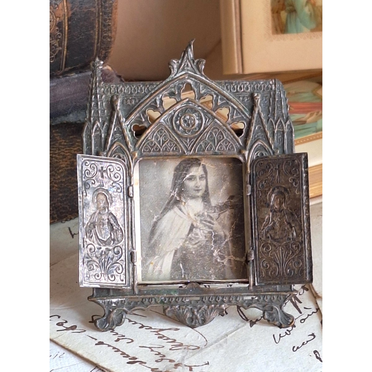 Det gamle rejsealter/ikon, er i forsølvet metal. De to låger er dekoreret med Jesus og Maria. Inden i er et billede af Skt. Therese. Det er fra omkring sidst 1800/først 1900-tallet. Brugsspor og patina forekommer...SE BILLEDER..