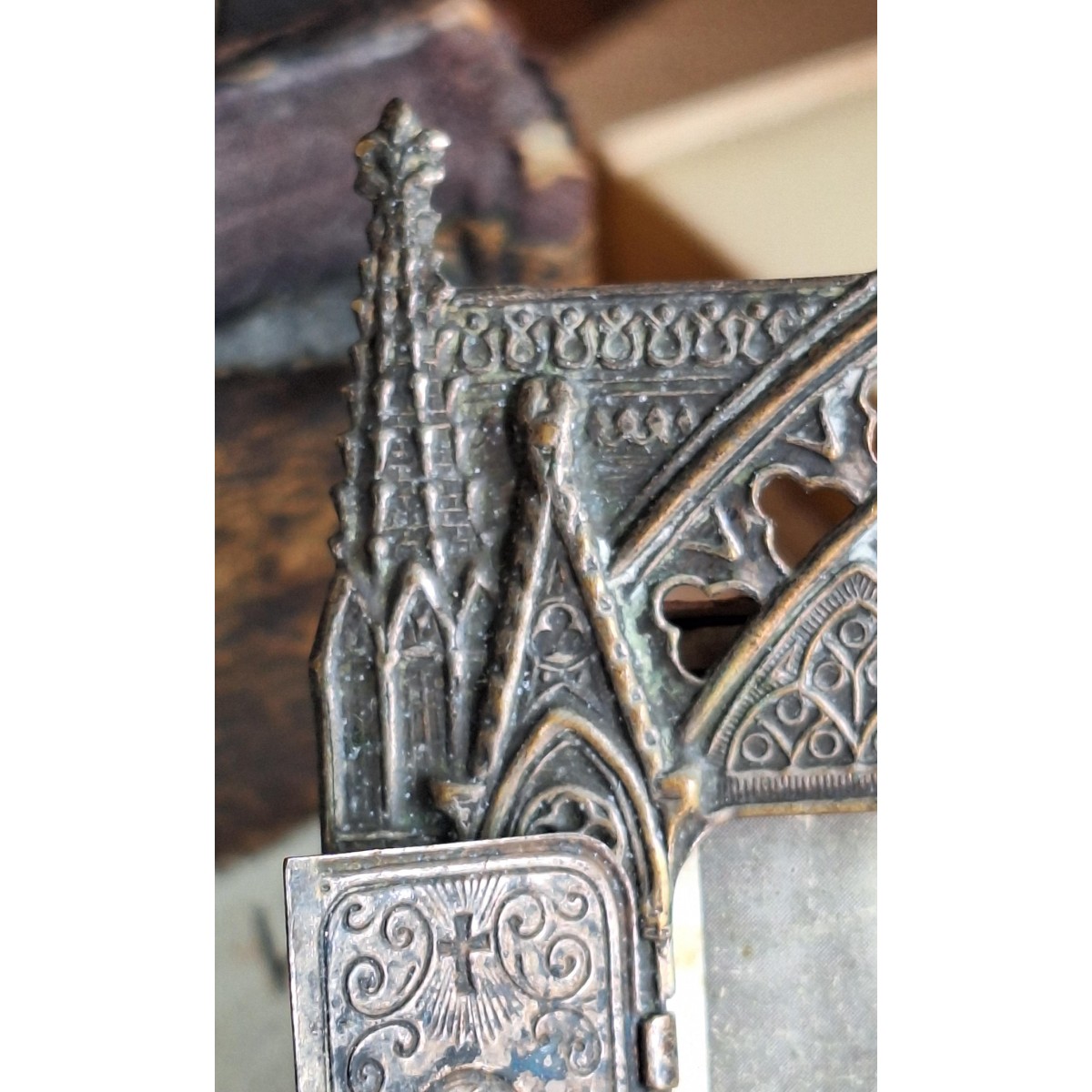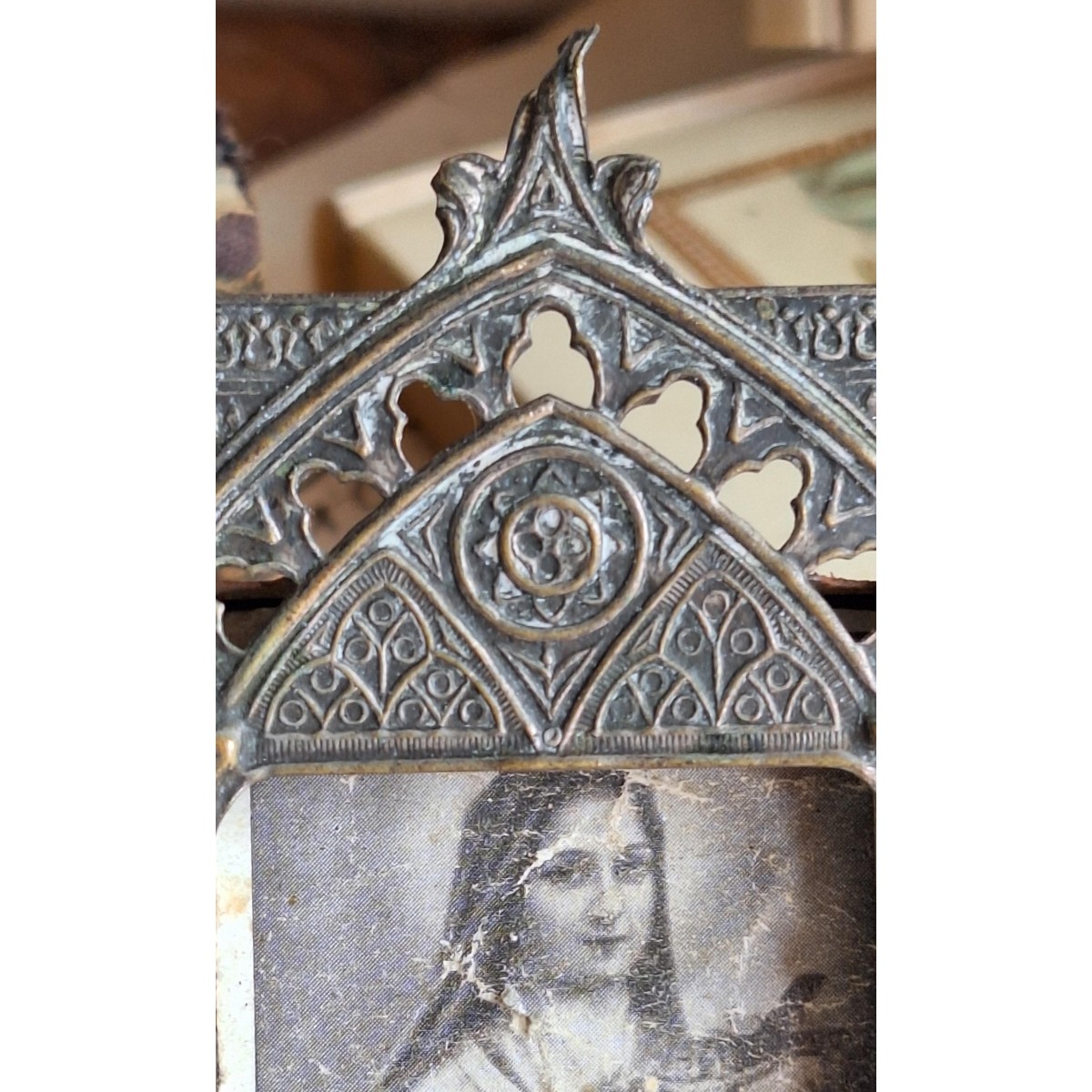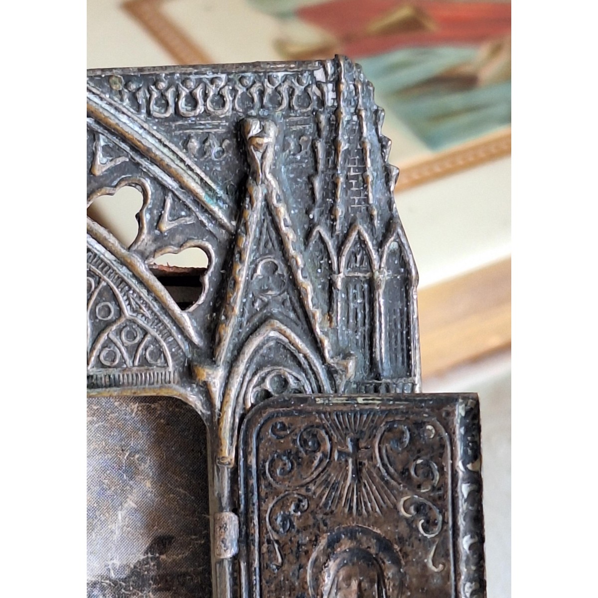 Det gamle rejsealter/ikon, er i forsølvet metal. De to låger er dekoreret med Jesus og Maria. Inden i er et billede af Skt. Therese. Det er fra omkring sidst 1800/først 1900-tallet. Brugsspor og patina forekommer...SE BILLEDER..