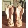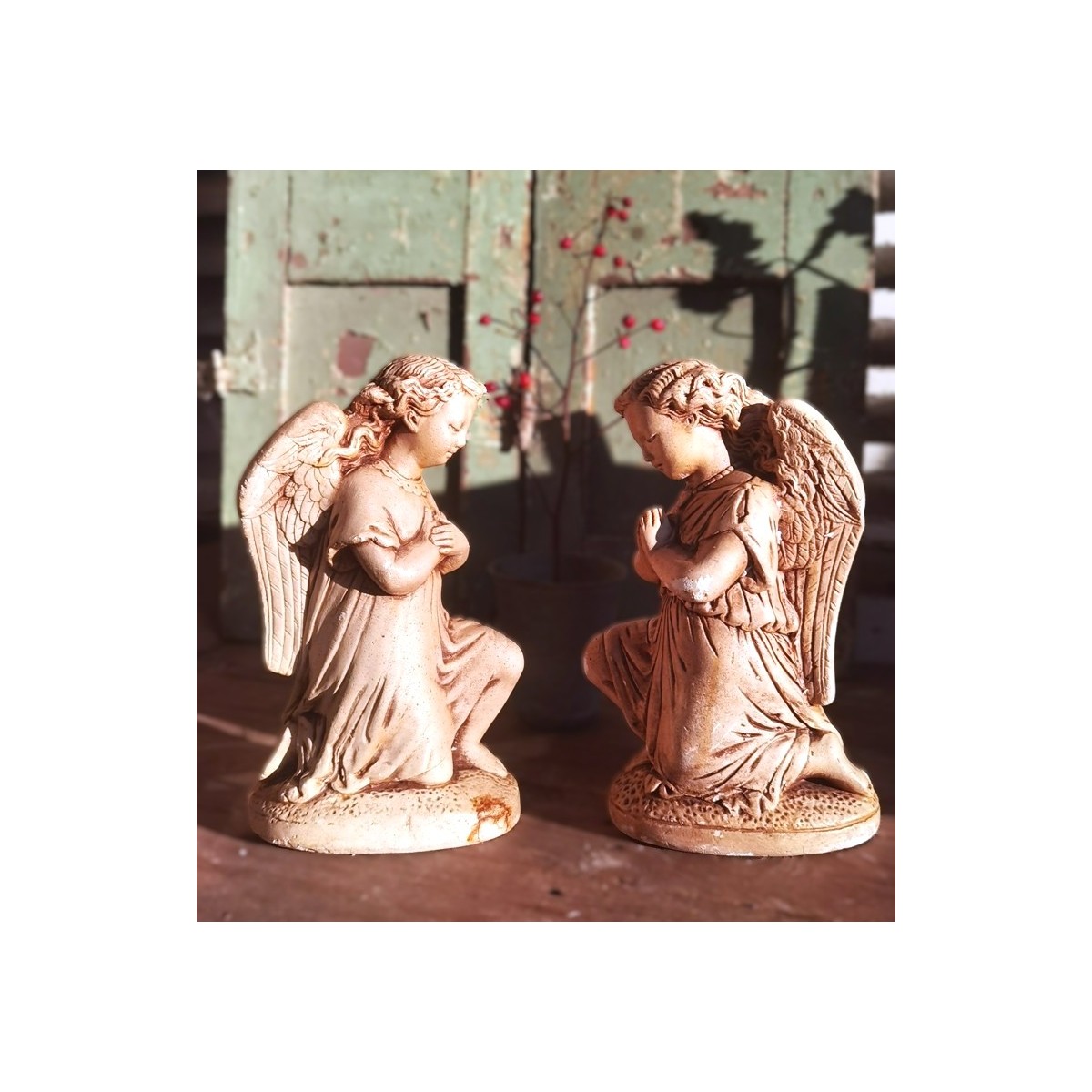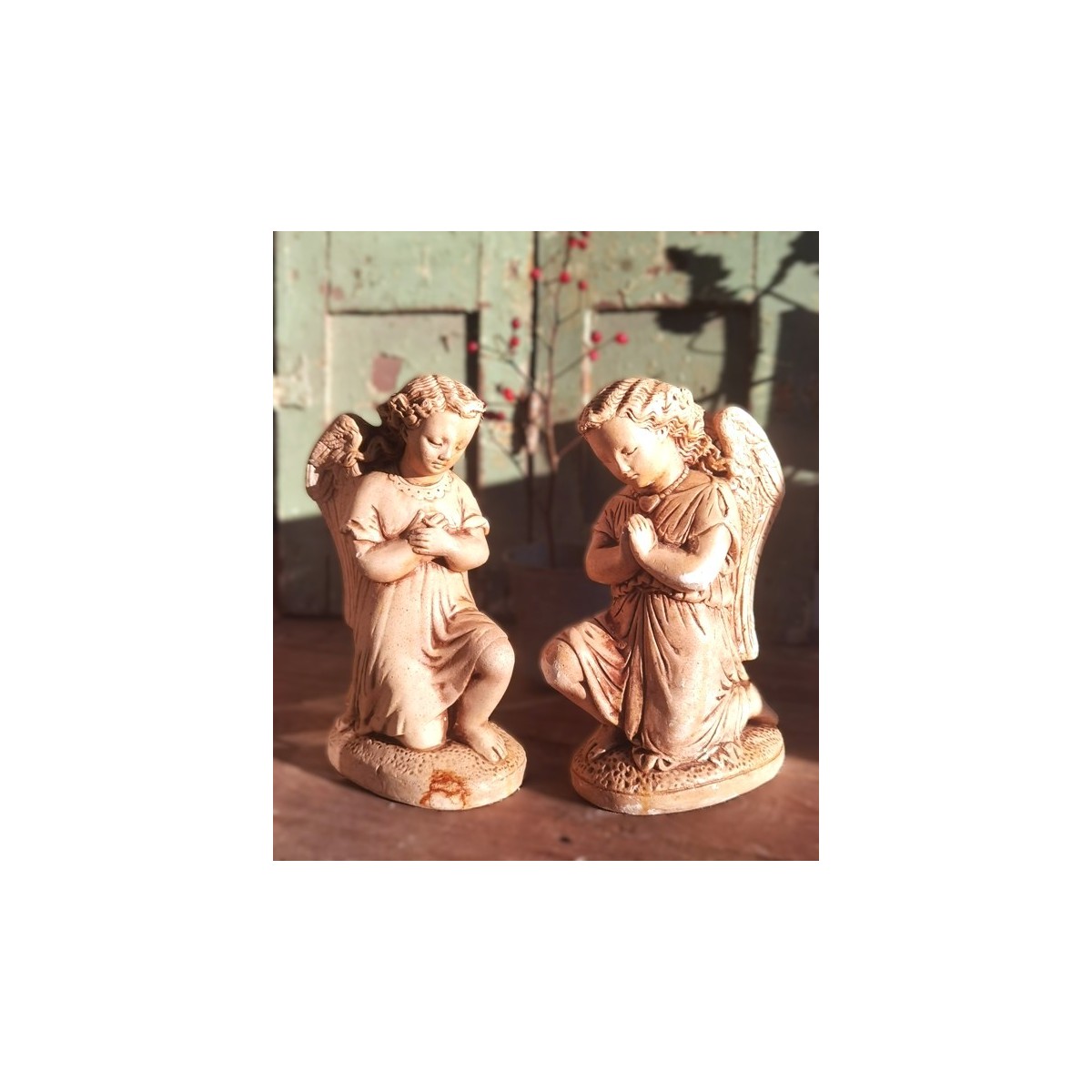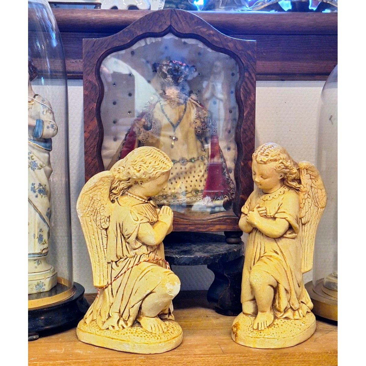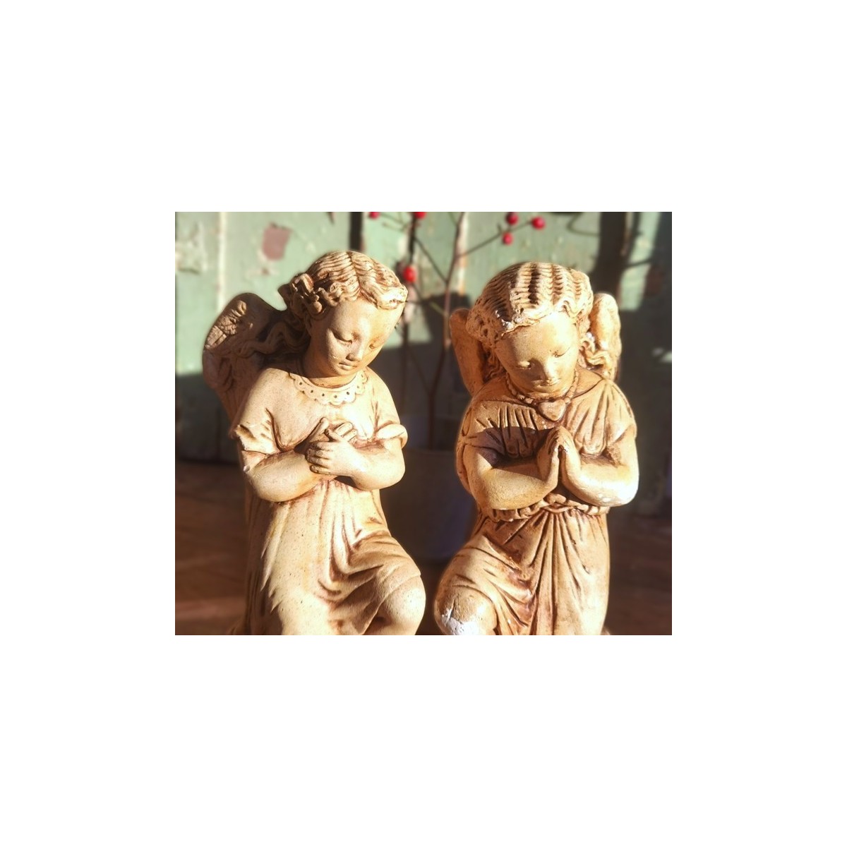 2 antikke engle, der er lavet omkring 1900. Meget udtryksfulde i fremstillingen. Ofte er de bedende engle fra gamle krybbespil. Englene har brugspatina. Og der er slitage i overfladen. Bl.a. på den ene engels knæ, er der slitage i overfladen...SE BILLEDER