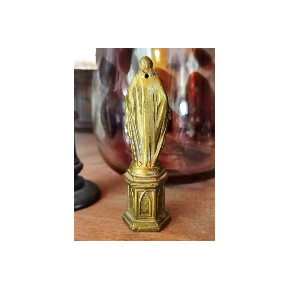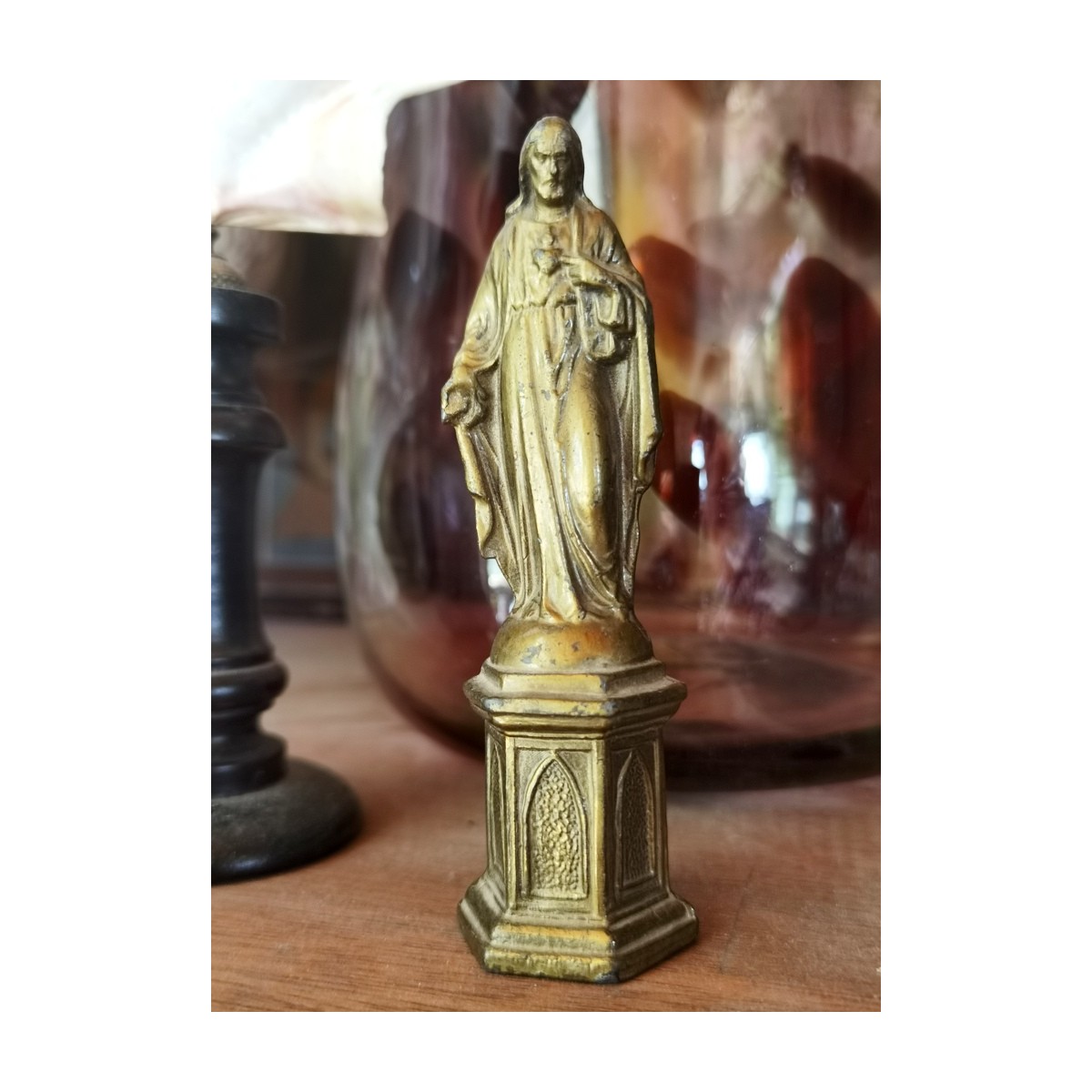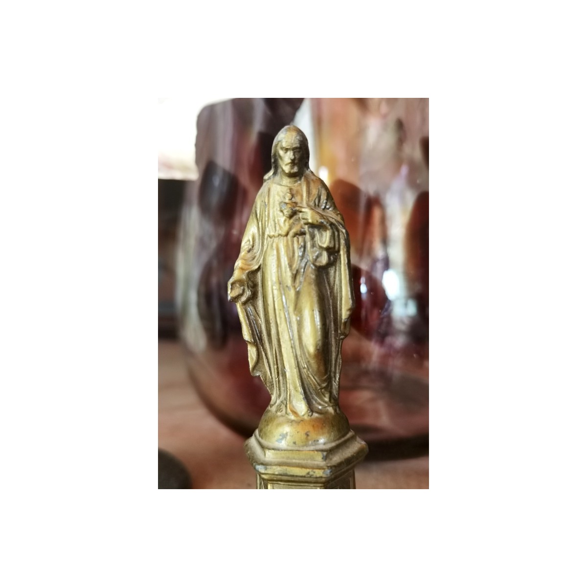 Meget detaljeret gammel Jesus-figur i gyldent metal. Jesus står på en sokkel, og peger på sit hjerte. Figuren har et lille hul på bagsiden. Patina forekommer...SE BILLEDER