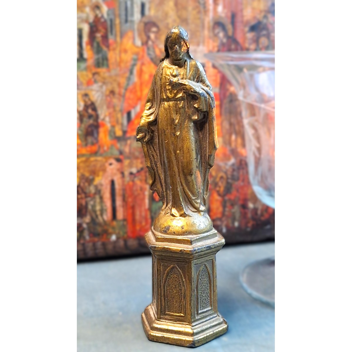 Se fuld størrelse Meget detaljeret gammel Jesus-figur i gyldent metal. Jesus står på en sokkel...Læs mere