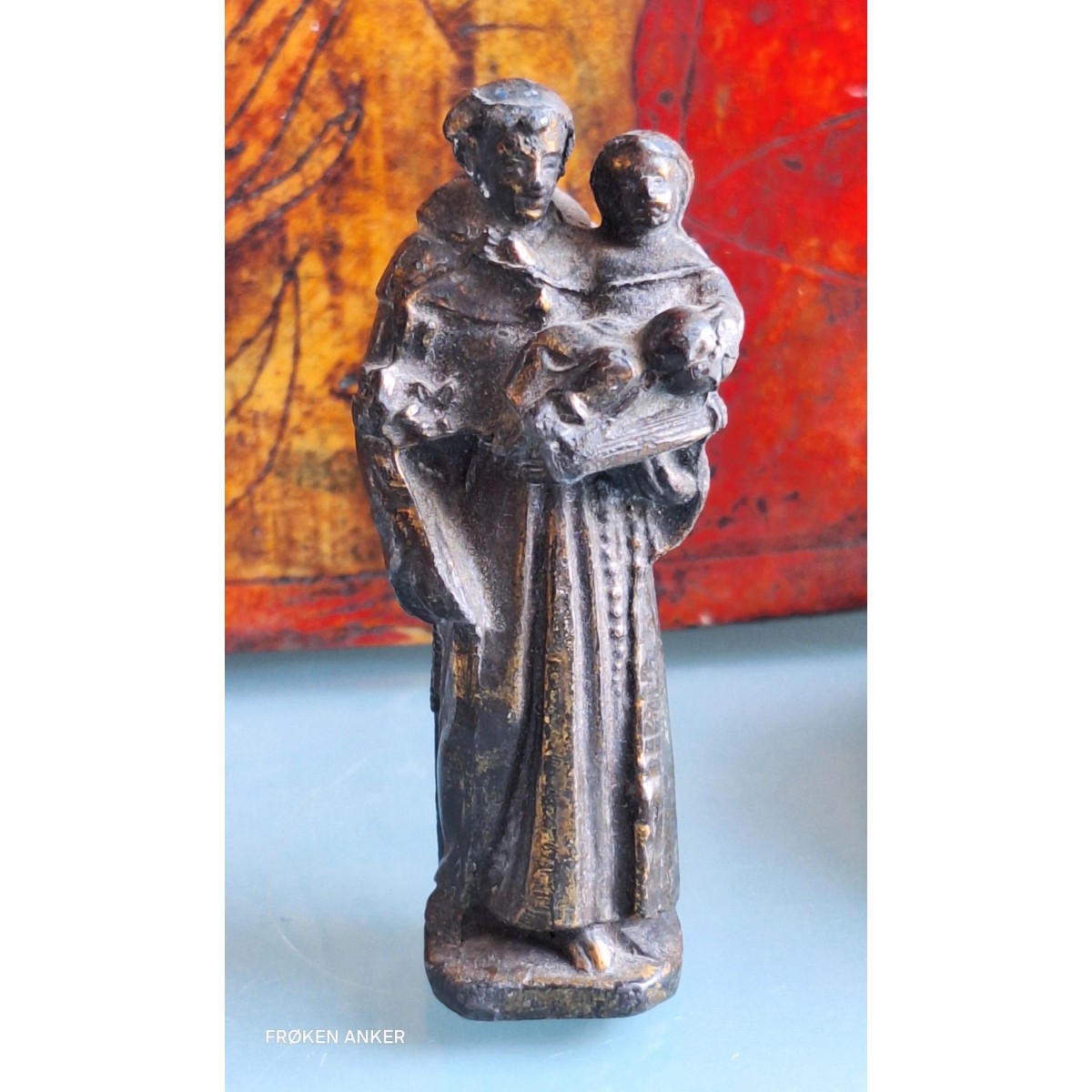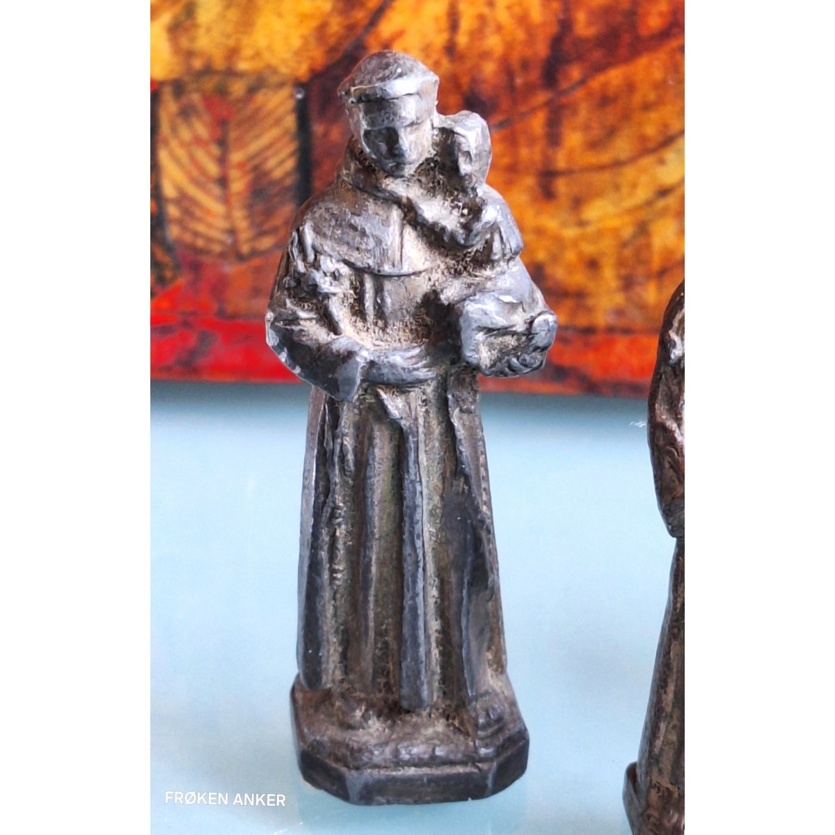 Gammel metalfigur, der ofte blev brugt som lommealter, til at tage med på rejsen. Nogle har dem også til at ligge i deres taske eller pung. Der forekommer brugsslitage, for ofte bliver der gnedet lidt på figuren under bøn...SE BILLEDER.