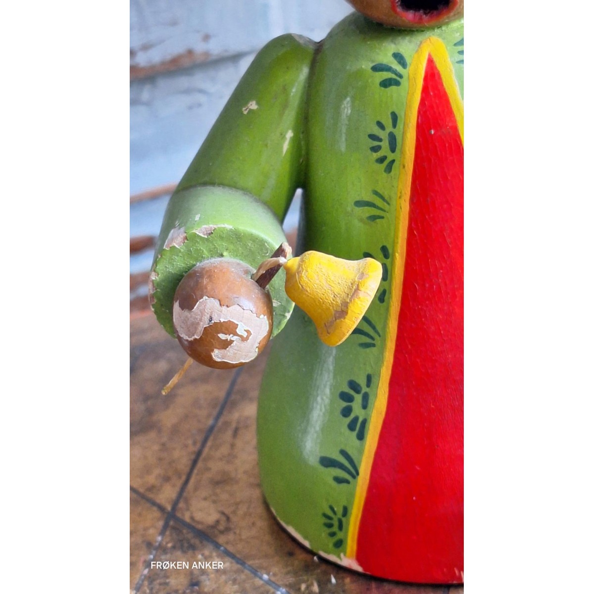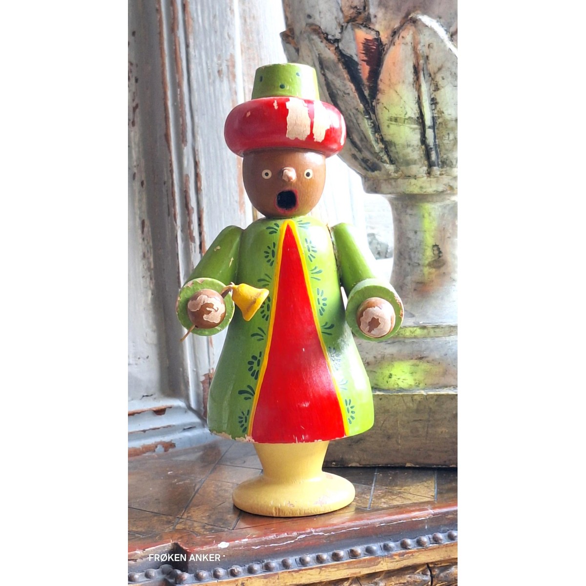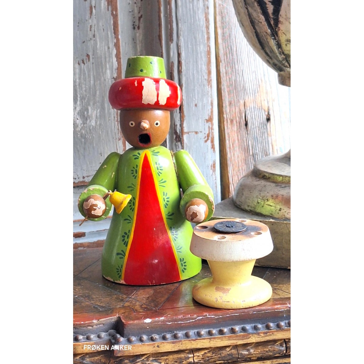 En gammel, og sjælden, håndlavet krybbespils figur/hellig 3 konger i malet træ. Figuren er fra Erzgebirge, og kan også bruges til røgelse. Der forekommer brugspatina...SE BILLEDER, der er en del af beskrivelsen.