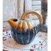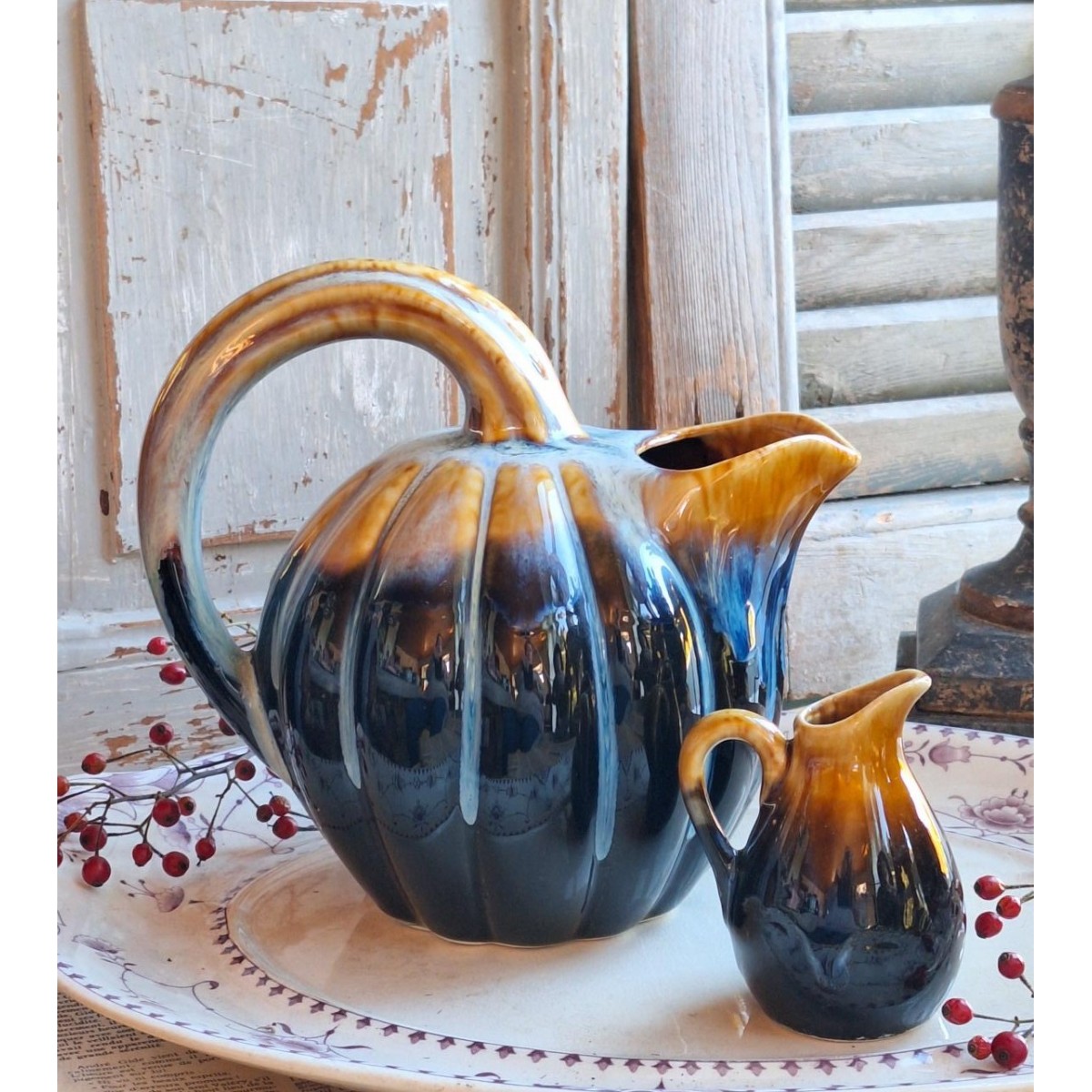 En flot fransk (vin)kande fra 1960'erne, udformet som melon, eller græskar. En meget flot kande, med en meget smuk glasur. Kanden er købt med en mini kande, med den samme glasur. Så de sælges samlet....SE BILLEDER