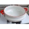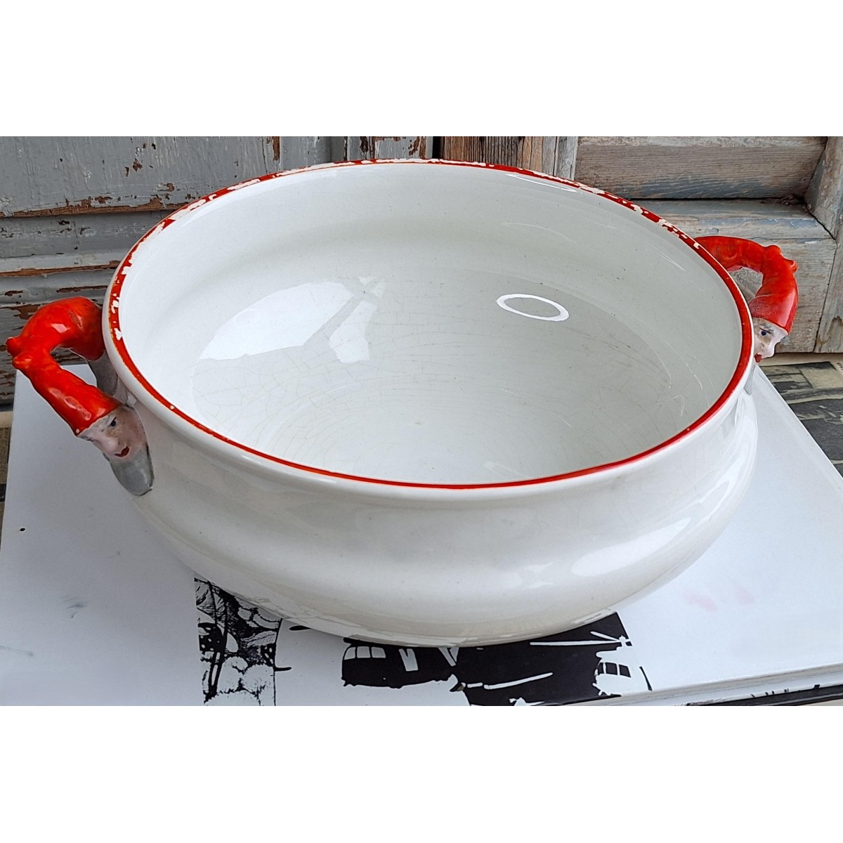 Antikt svensk 'grødfad', fra Göteborgs porslinsfabrik, med liggende 'tomte'/ nisse på låget. På enderne er der to nissehoveder som håndtag. Den er i en god stand. Der er slid på den røde farve på skålen under låget. Aldersbetinget patina forekommer - se billeder.