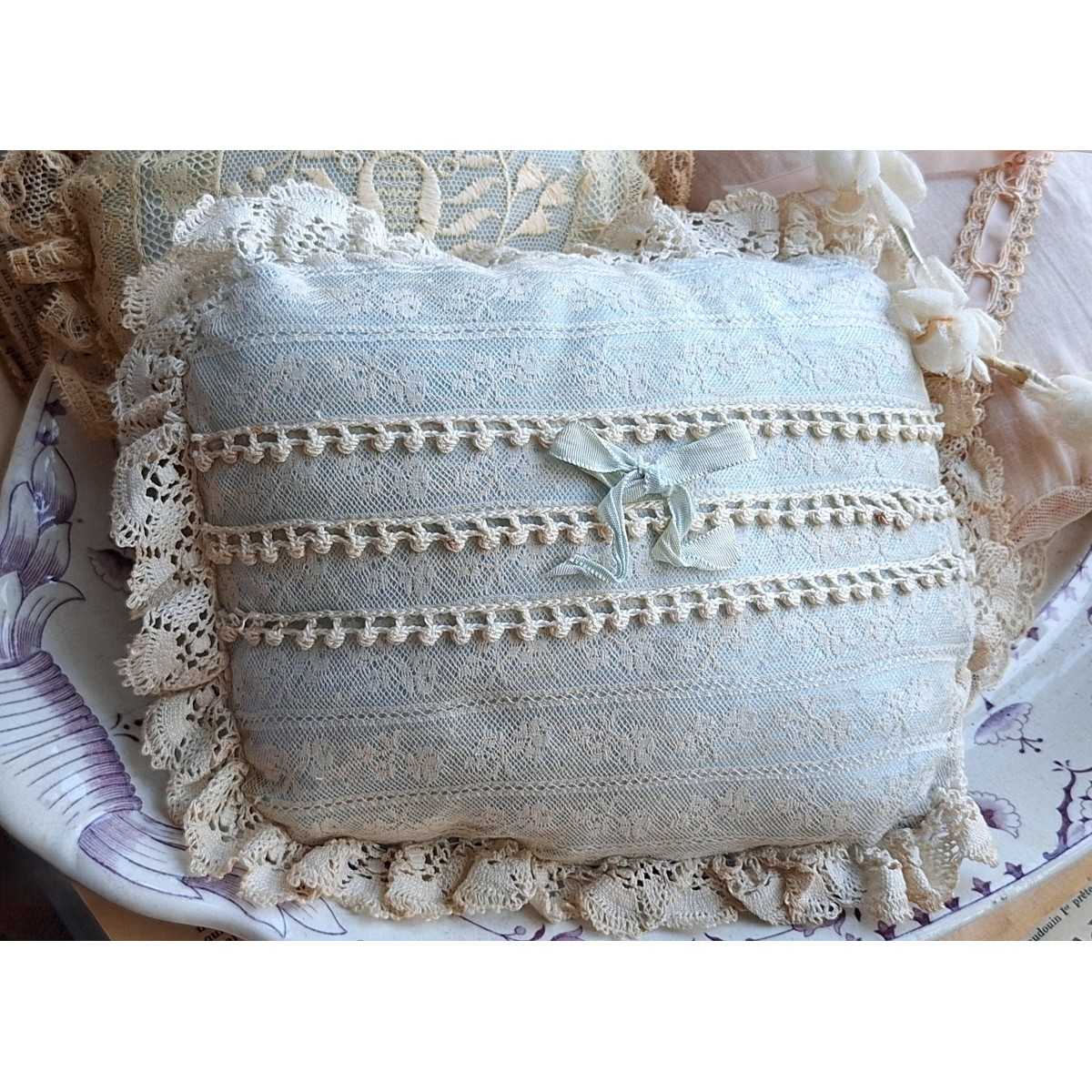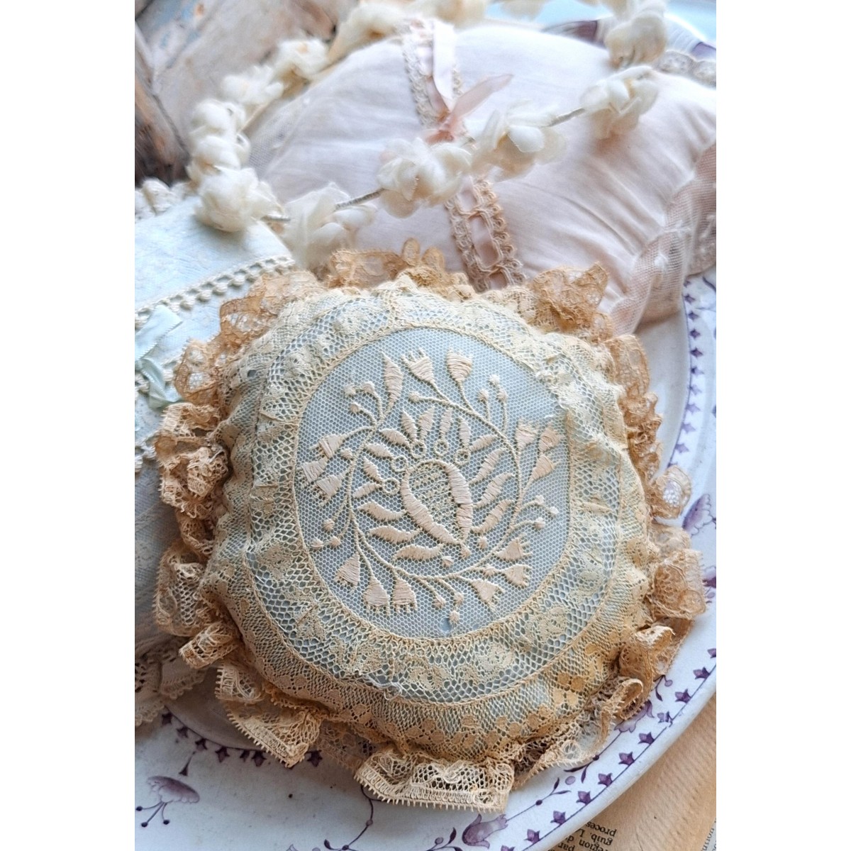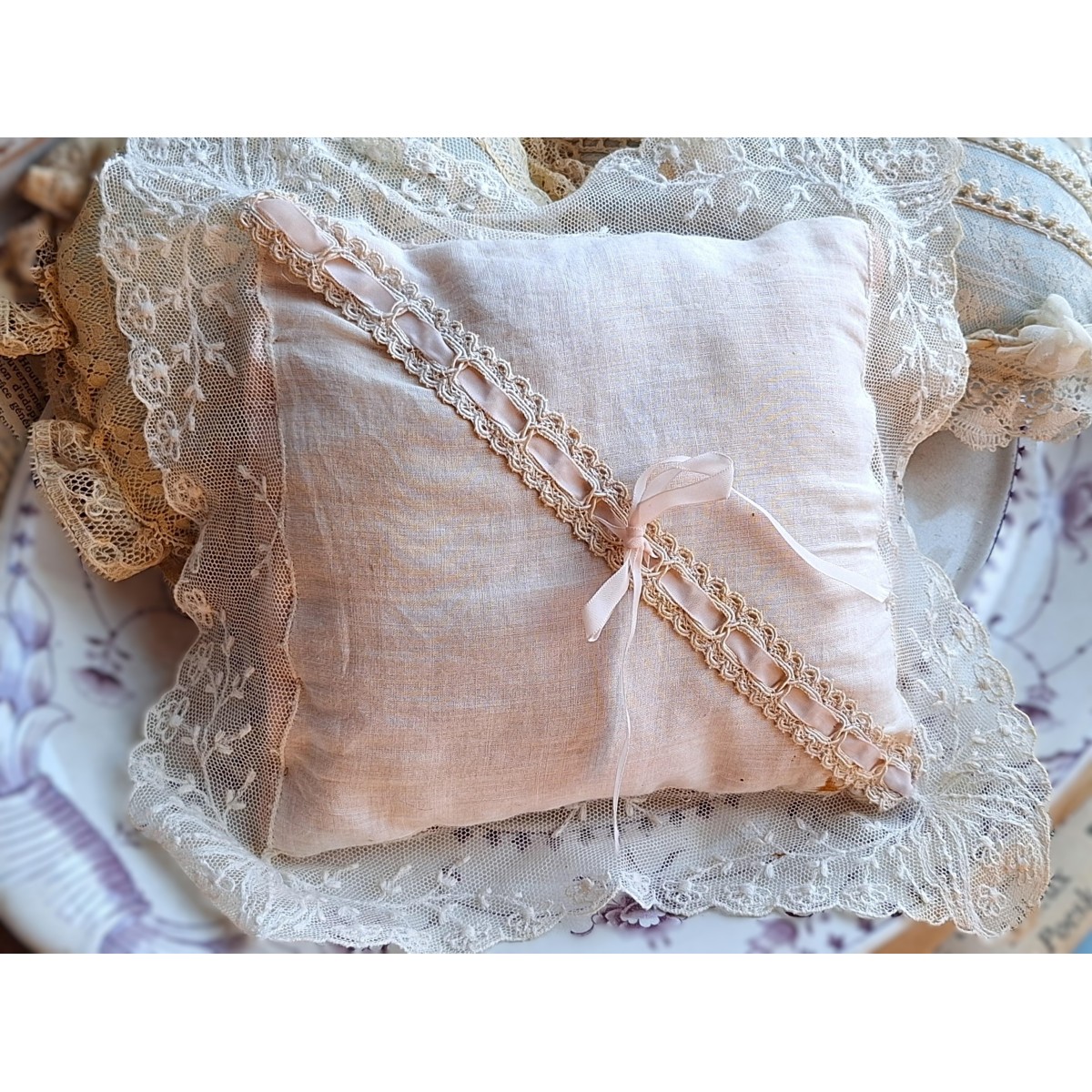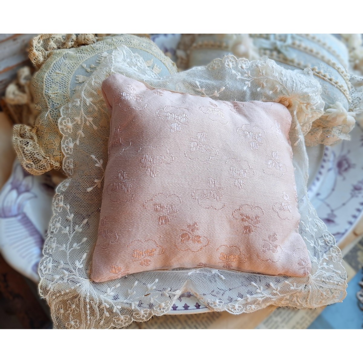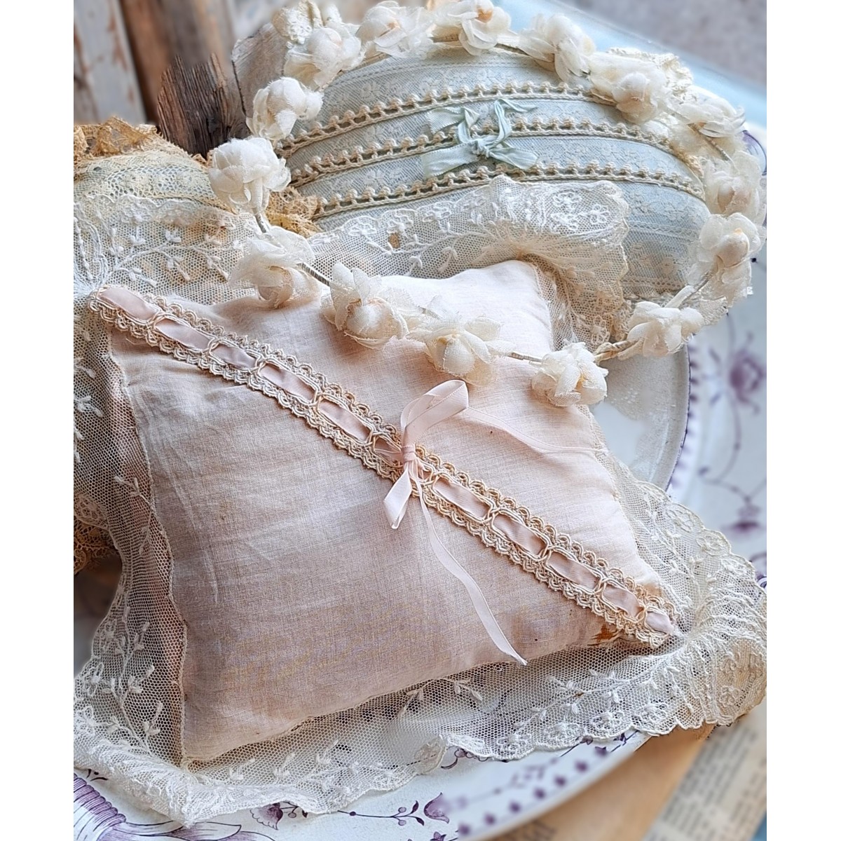 Den fine og meget gamle dekorations-/smykkepude er i originale gamle franske blonder...Læs mere
