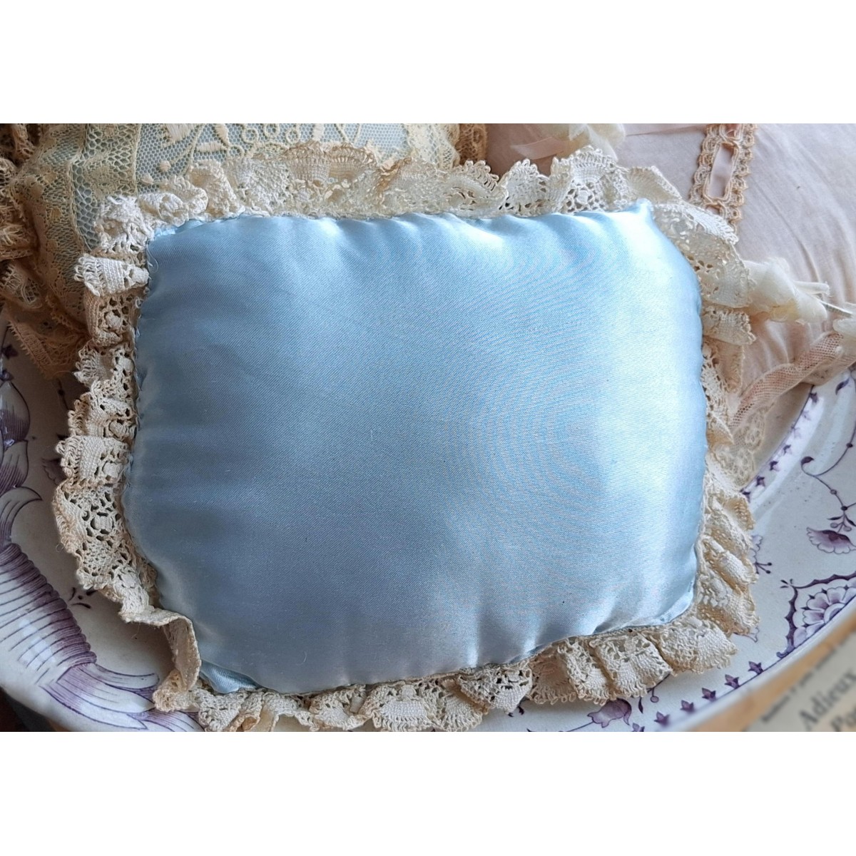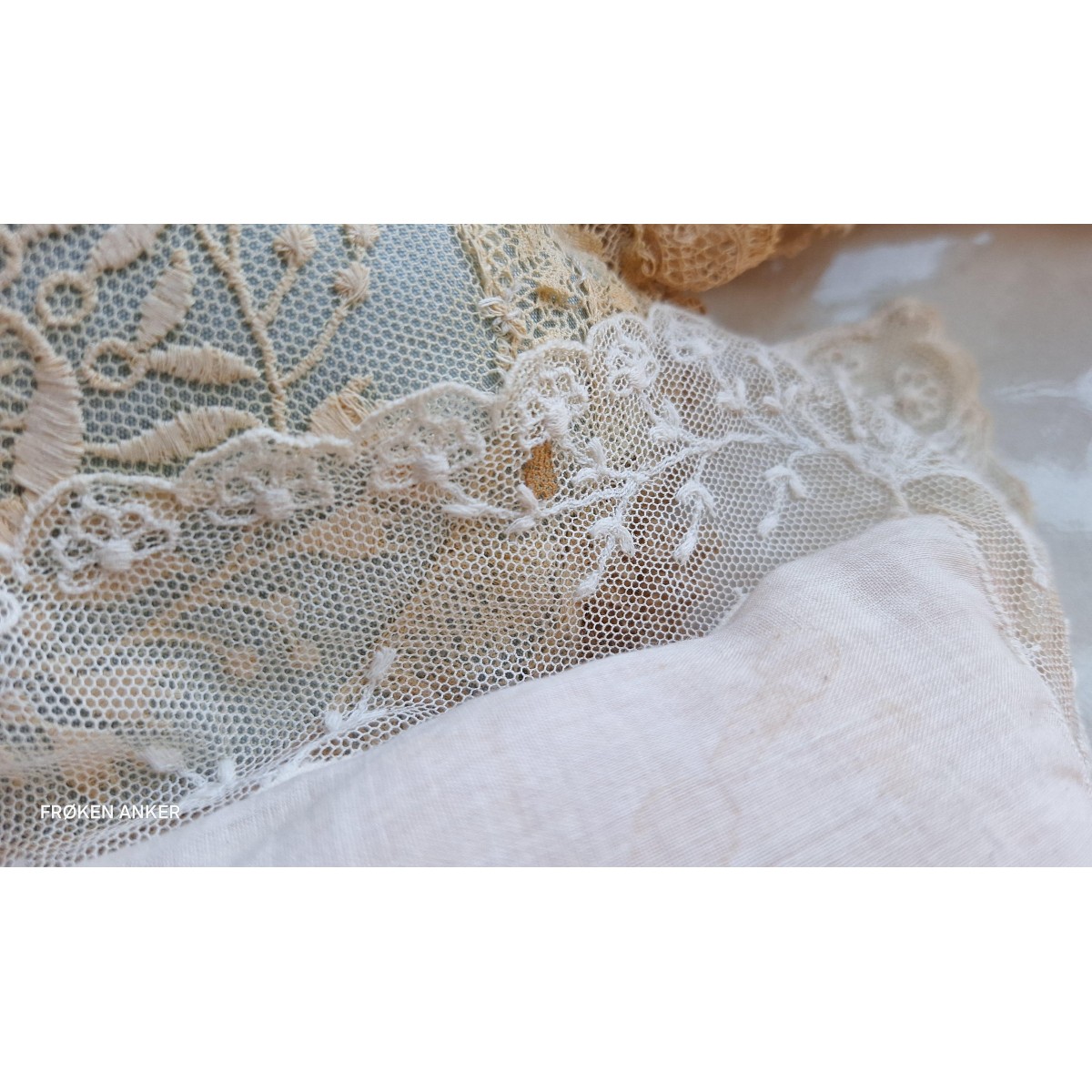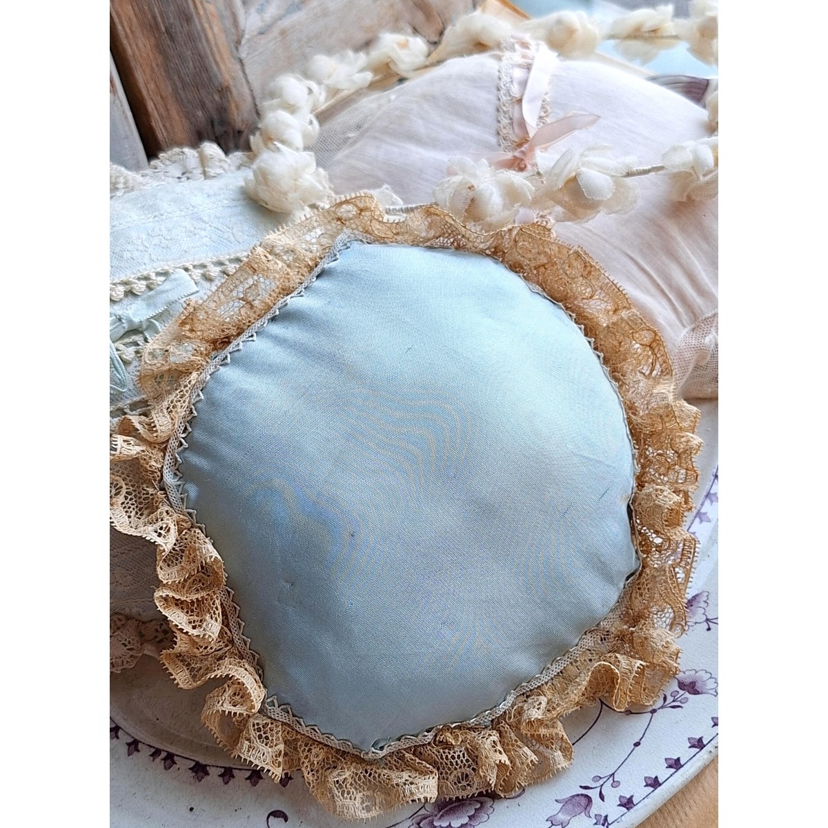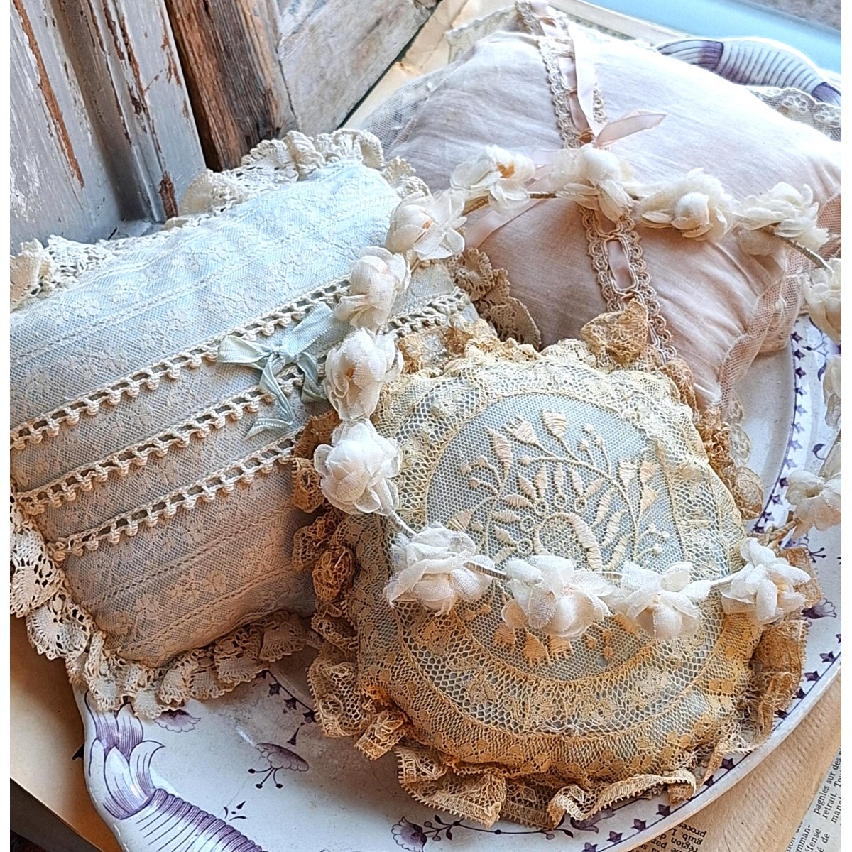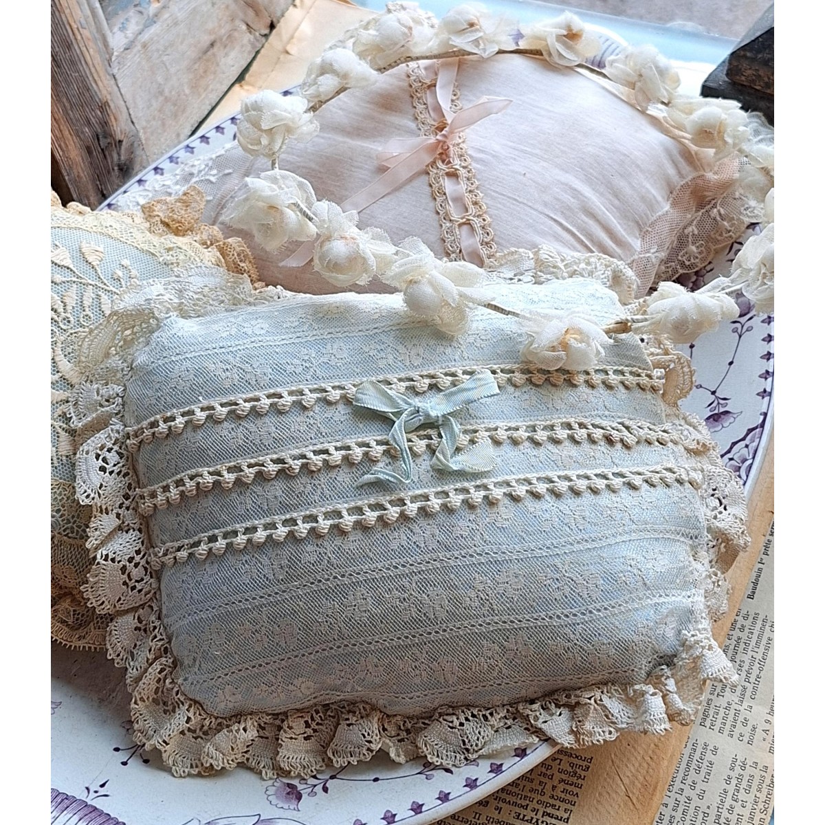 Den fine og meget gamle dekorations-/smykkepude er i originale gamle franske blonder...Læs mere
