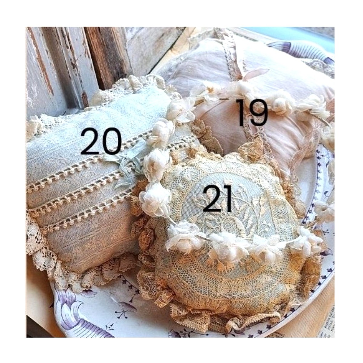 Nr. 19: Lattefarvet pude: 16,5 x 15,5 cm / mål er ex. den brede blonde i kanten