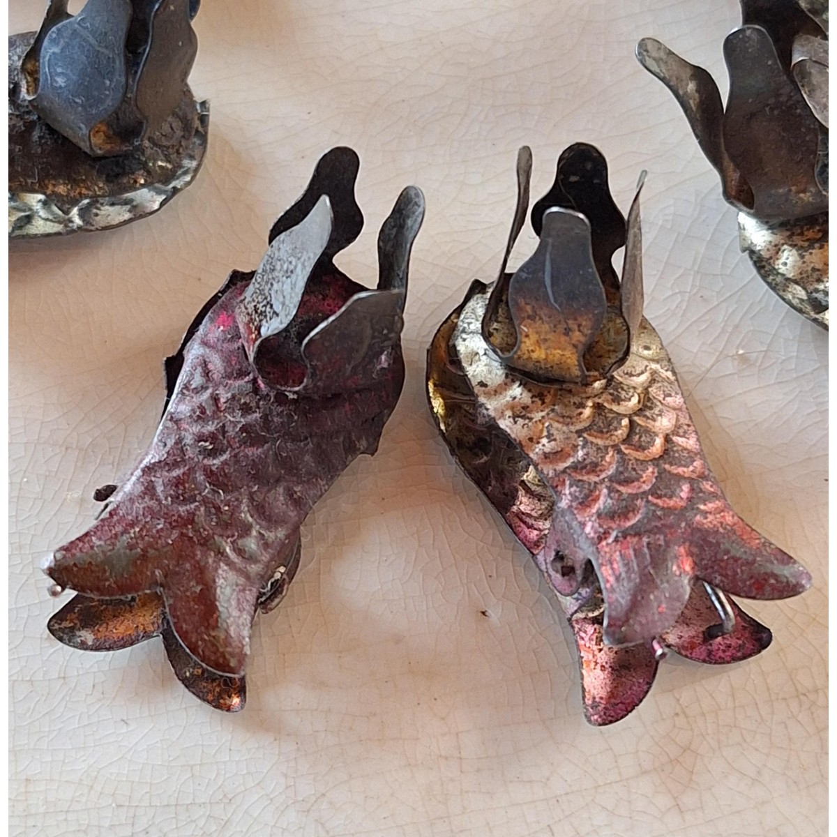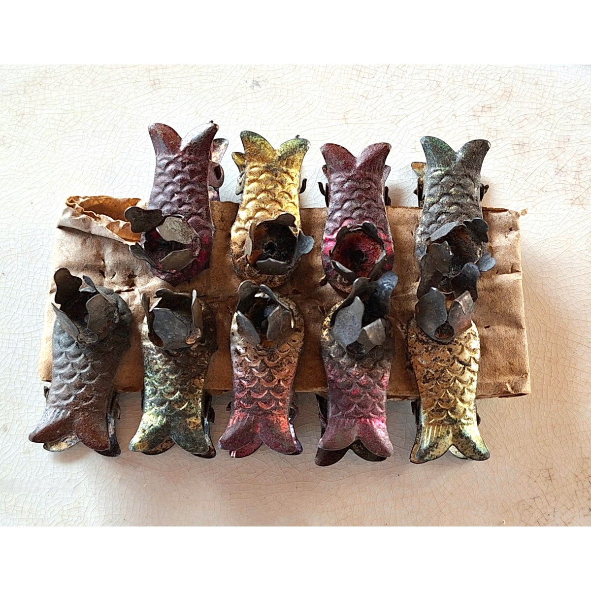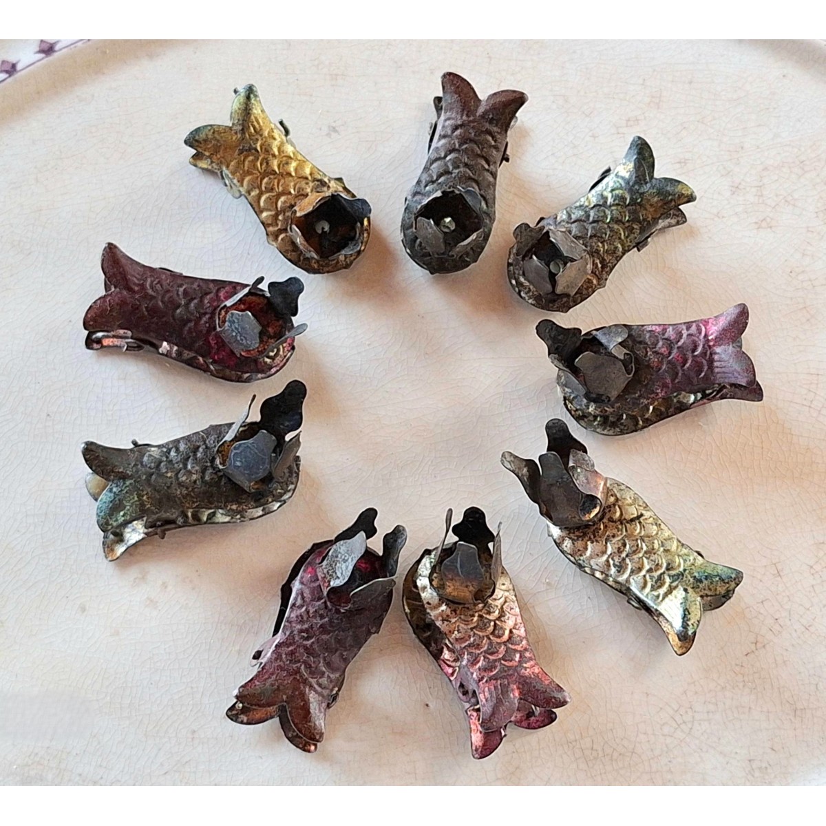 De gamle lysholdere med klips er formet som fisk. De er skønne året rundt. Klipsen er også dekorative på kanten af et fad, eller en fin gammel bog. Klipsene har original patina, og lysrester kan forekomme.