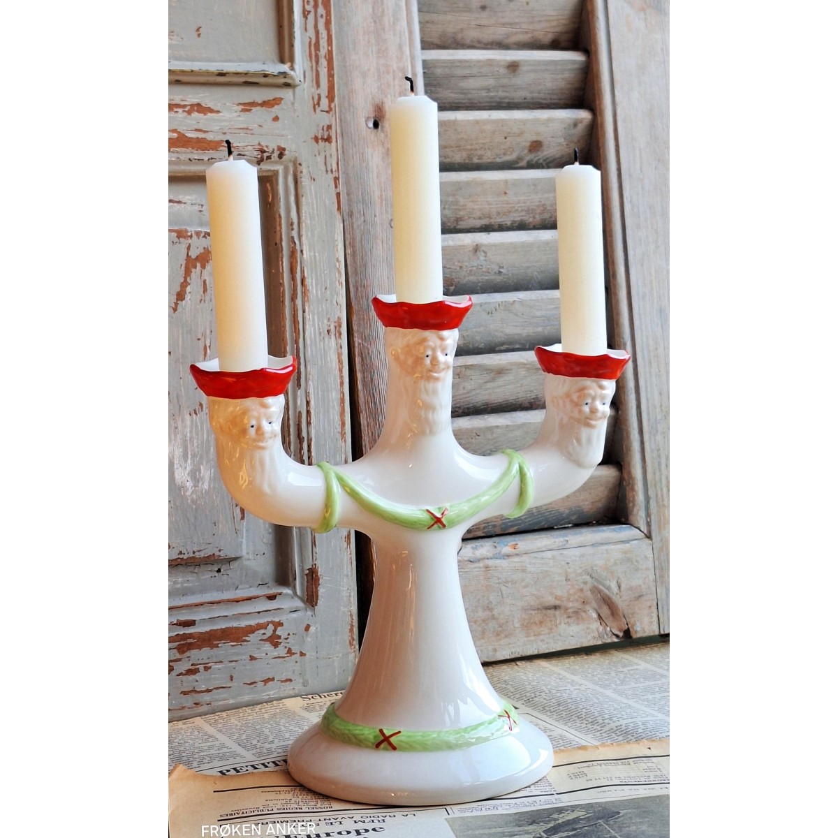 Den gamle svenske lysestage fra Rørstrand med 3 nisseansigter - på begge sider - spreder en hyggelig julestemning. Lysestagen er meget flot og velholdt..SE BILLEDER.