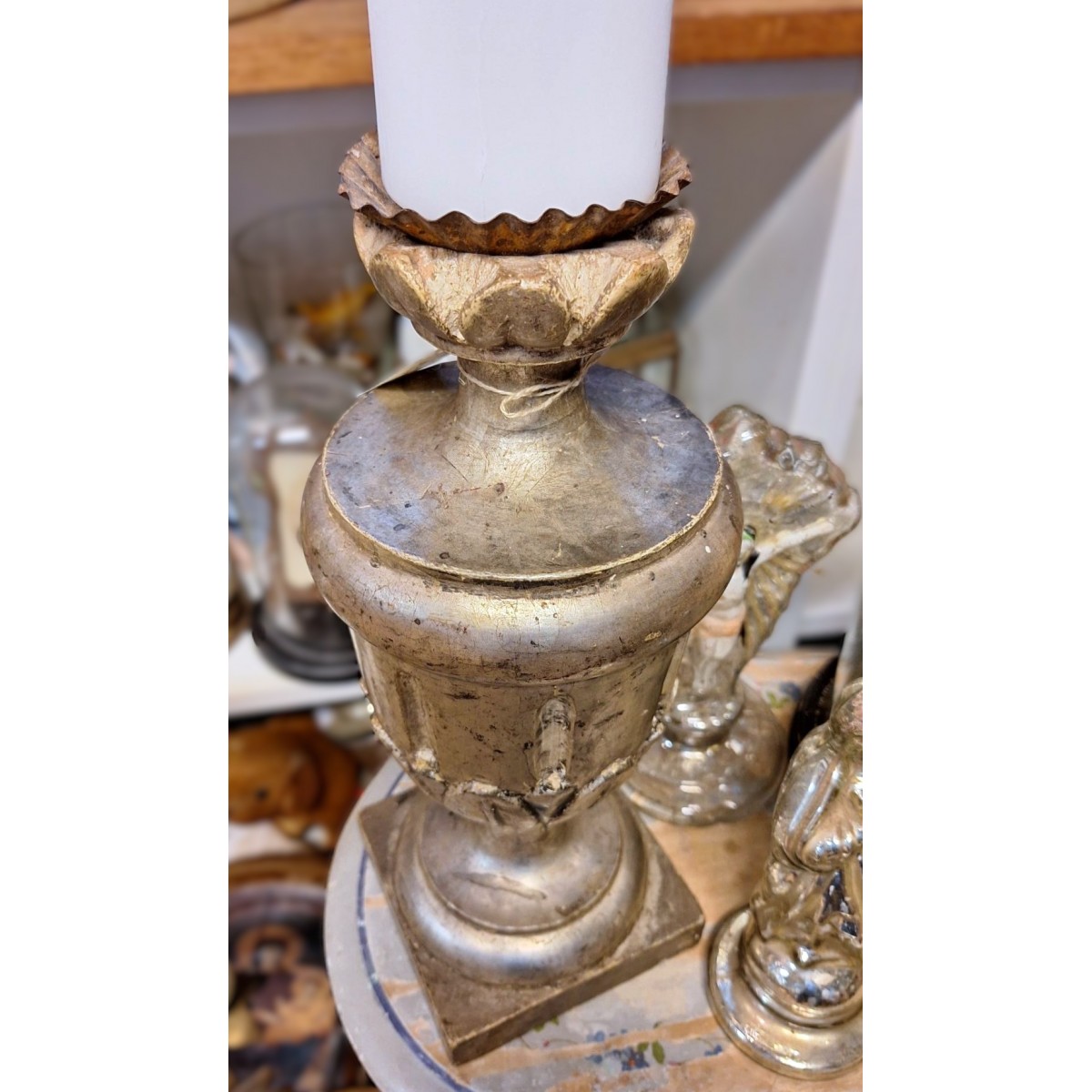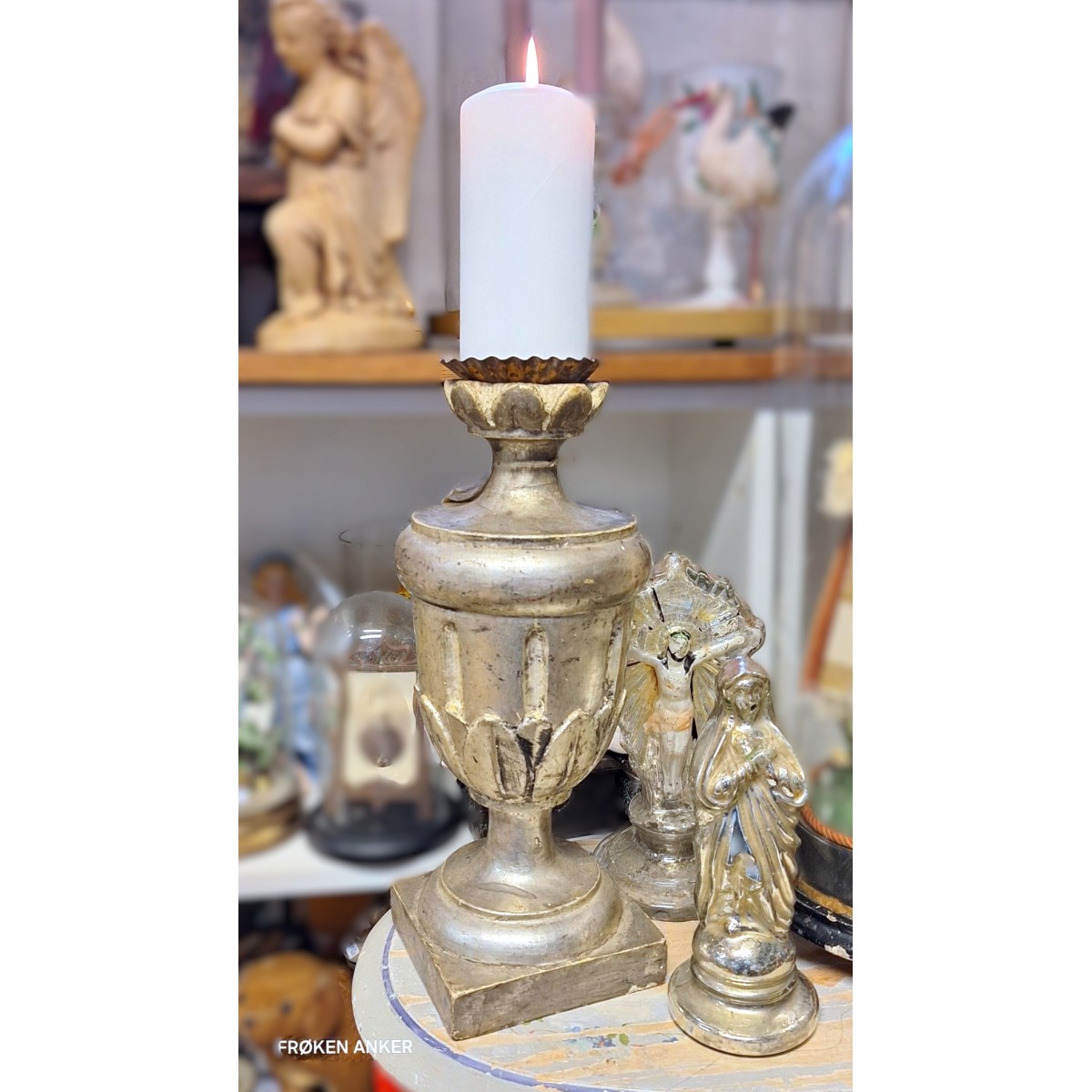 Italiensk alter lysestage i træ belagt med sølv. Alterstagen er fra 1800-tallet. Stagen har metalform til lyset. Velholdt, alderen taget i betragtning. Men også med brugsspor, og den smukkeste patina. Se billeder.