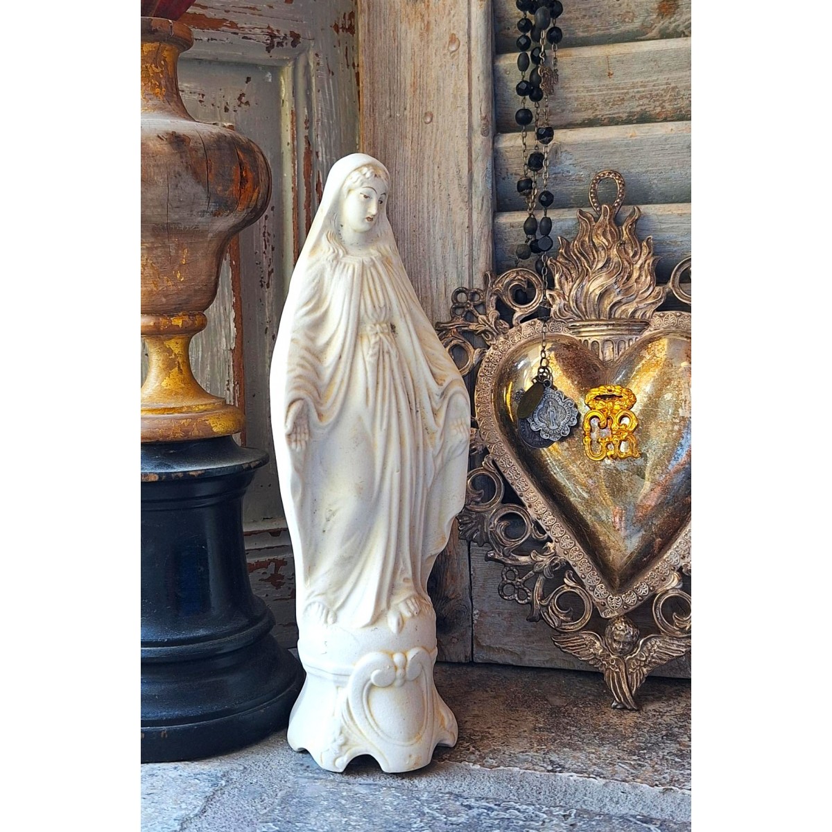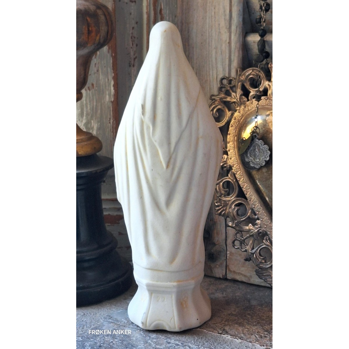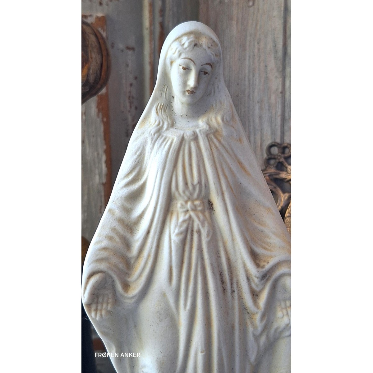 En meget smuk og gammel madonnafigur med åbne hænder, madonnaen af åbenbaringen. Figuren er fundet på et lager i en gammel fabrik i Frankrig...Læs mere..