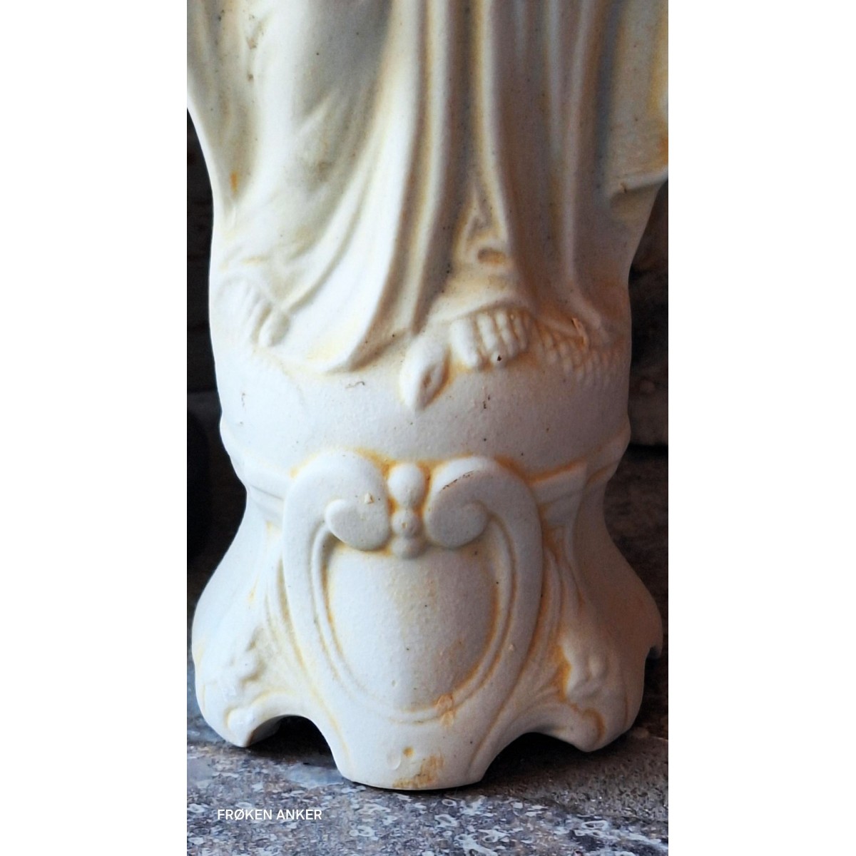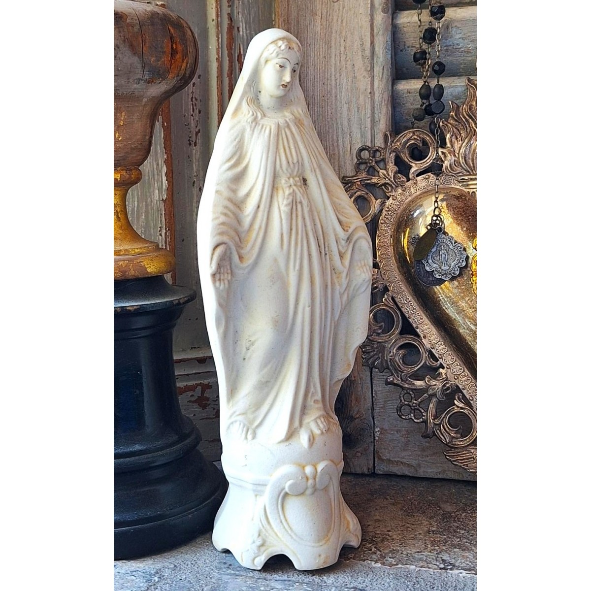 En meget smuk og gammel madonnafigur med åbne hænder, madonnaen af åbenbaringen. Figuren er fundet på et lager i en gammel fabrik i Frankrig. Figuren er støbt med en fin sokkel. Figuren har brugsrelateret patina fra mange år på et lager. SE BILLEDER...Bemærk slangen ved hendes fod