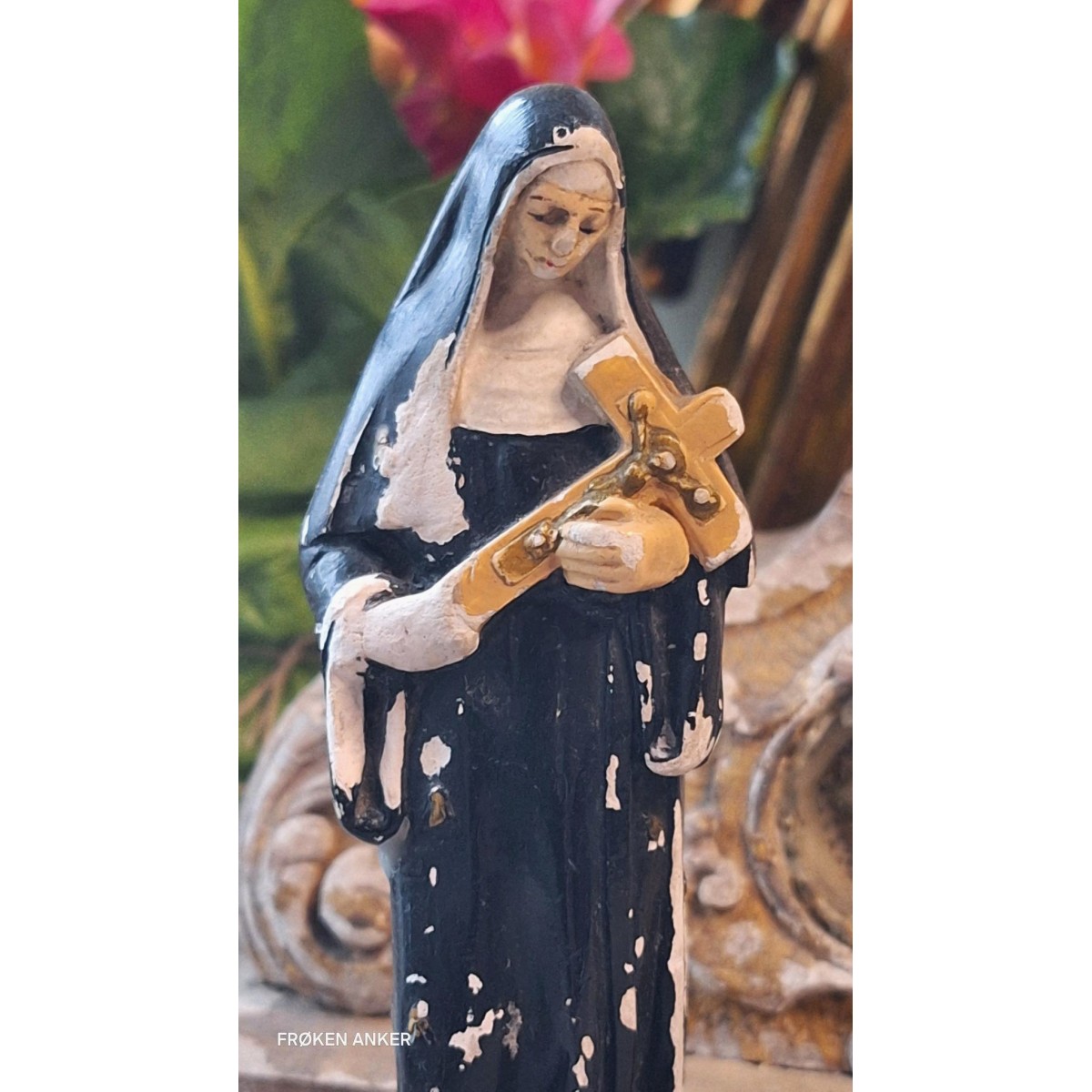 Se fuld størrelse En fin gammel figur af Skt. Rita i patineret, malet gips...Læs mere..