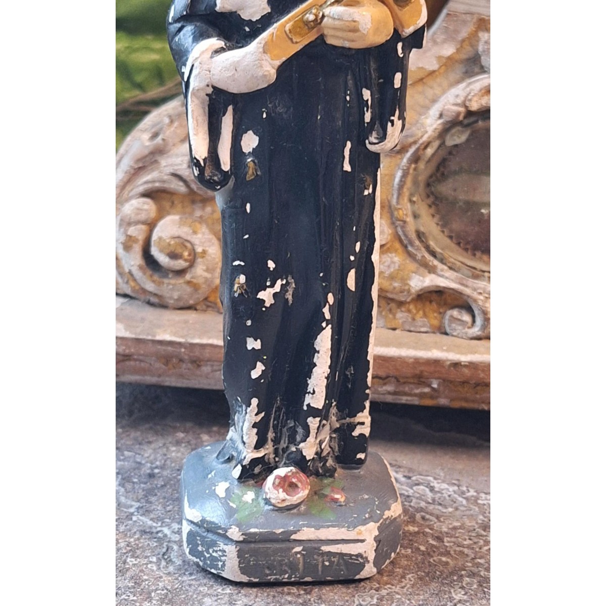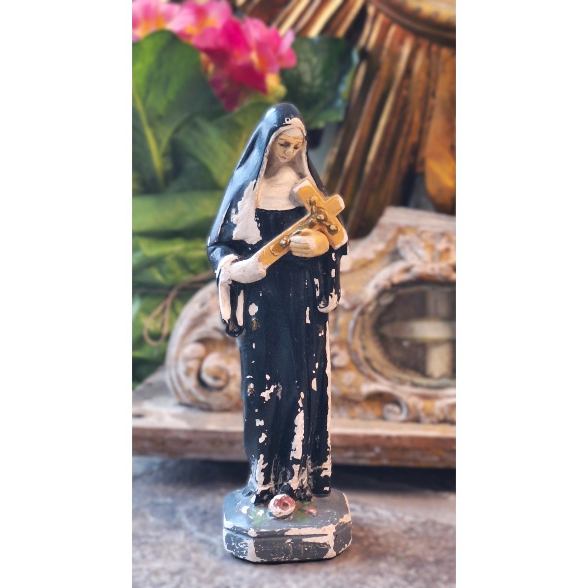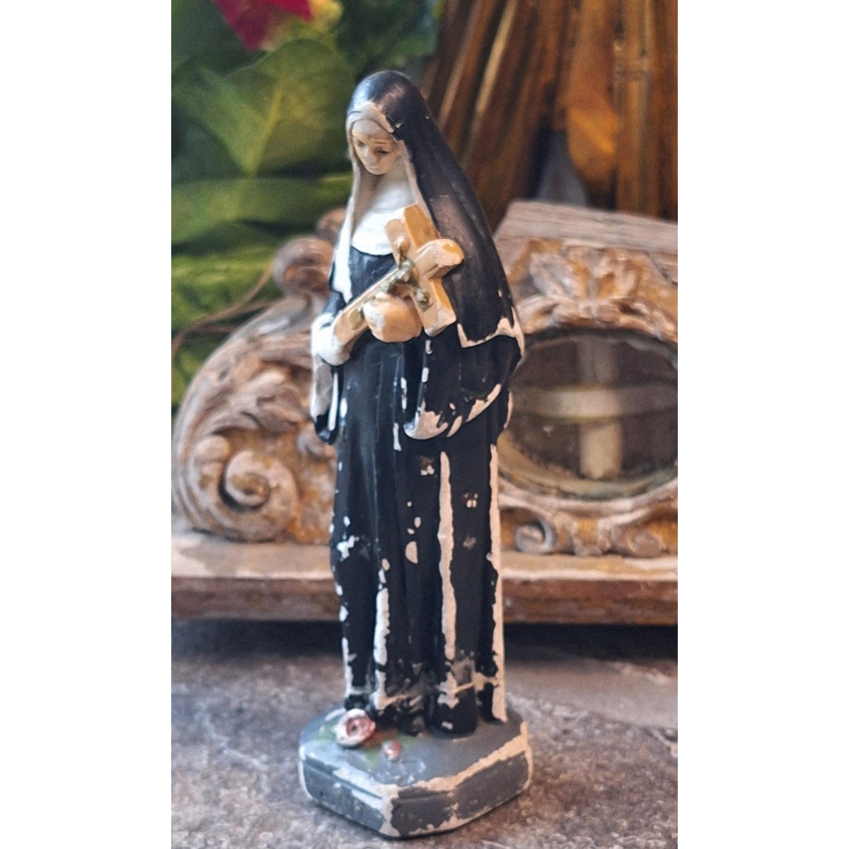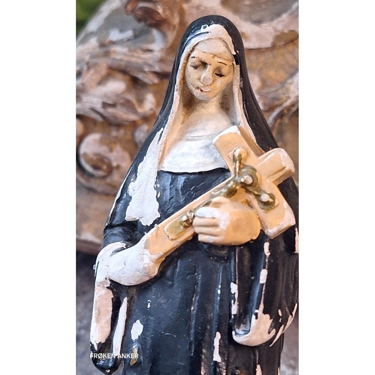 En fin gammel figur af Skt. Rita i patineret, malet gips. Overfladen har brugsspor... Se billeder, der er en del af brskrivelsen.