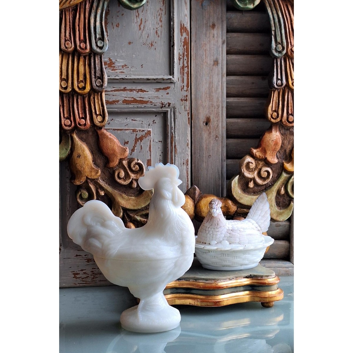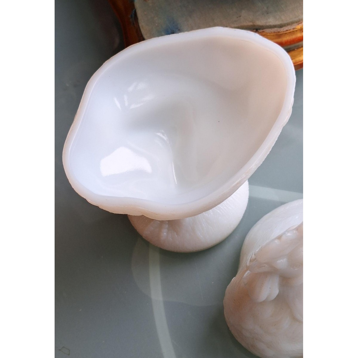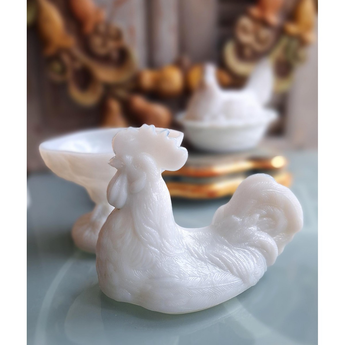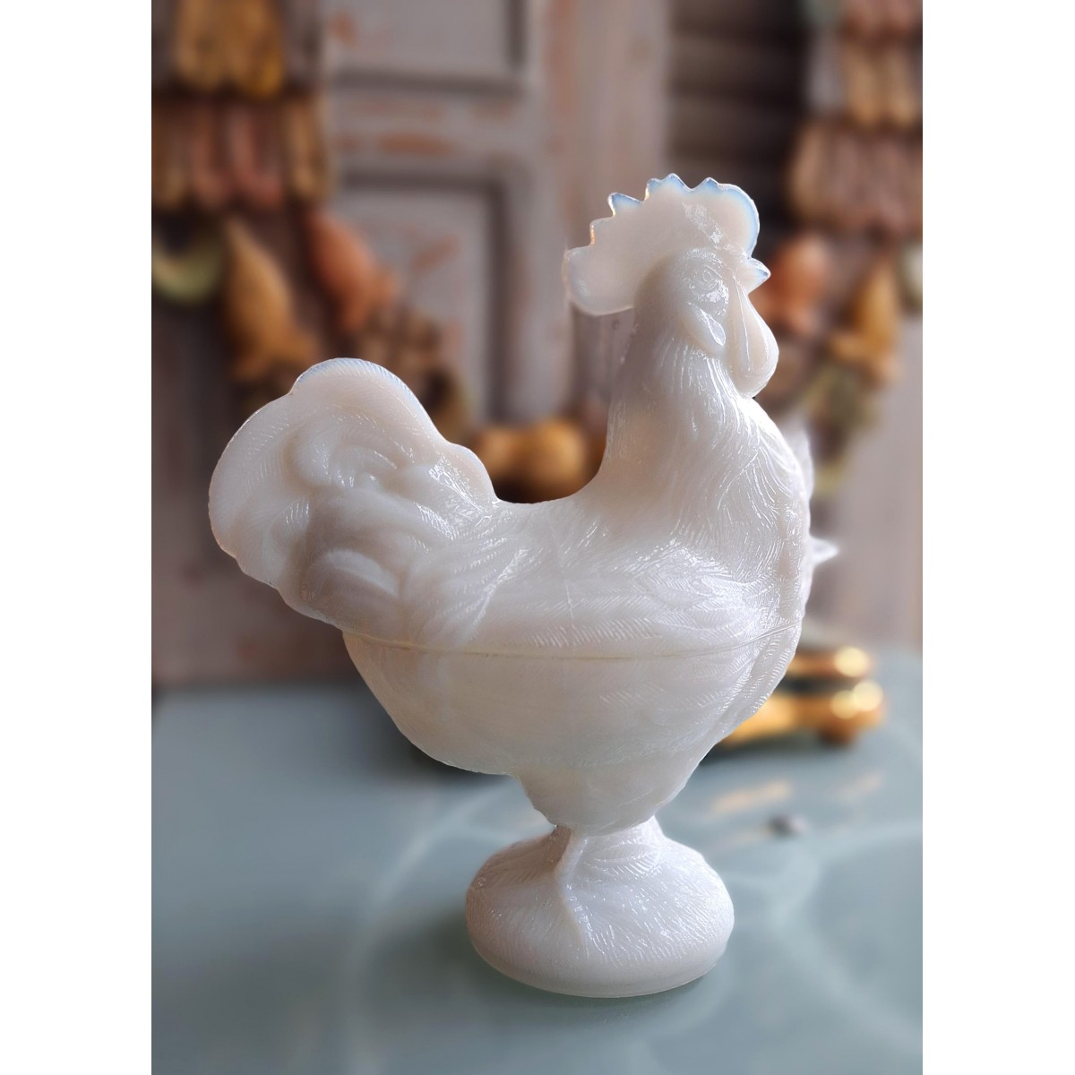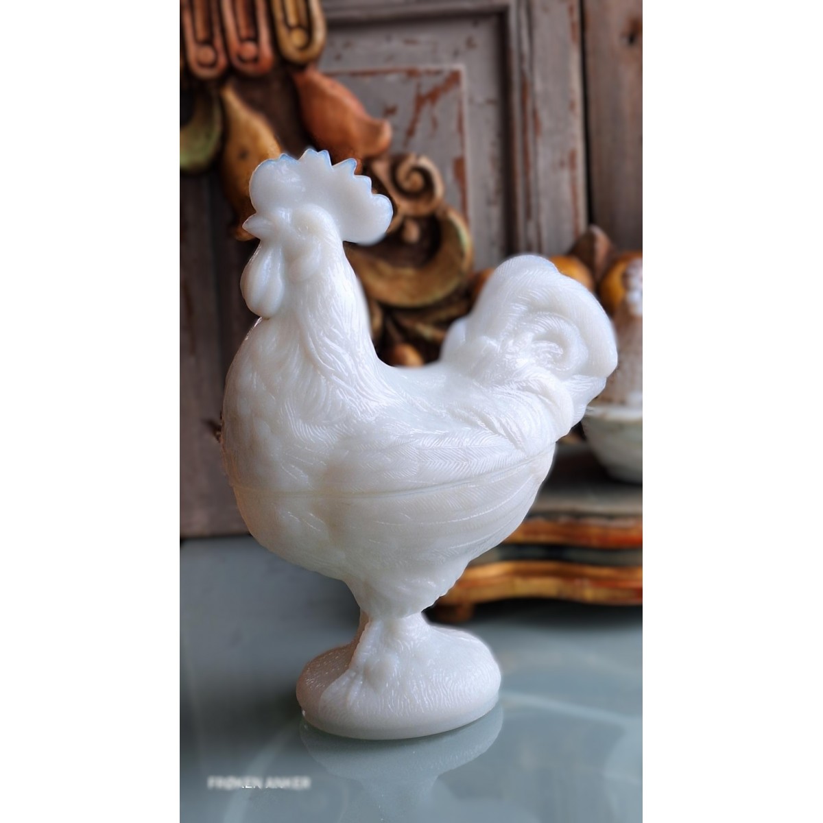 Se fuld størrelse Antik Bonbonniere HANE Opal/Mælkeglas (22x18cm) 1920