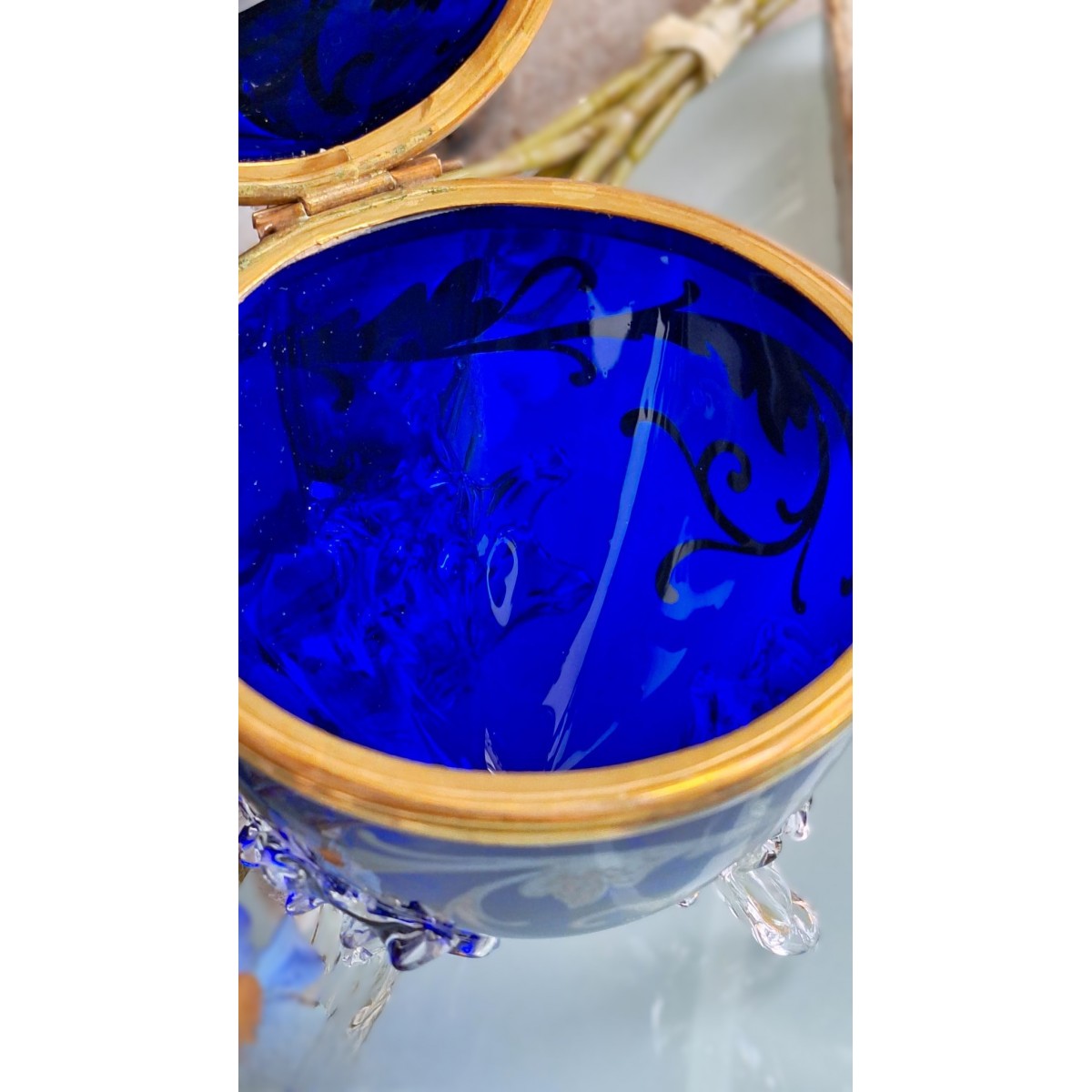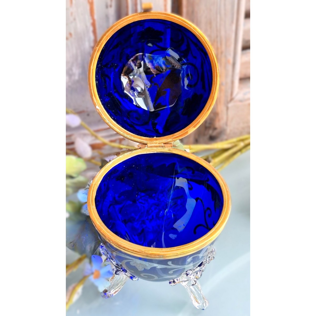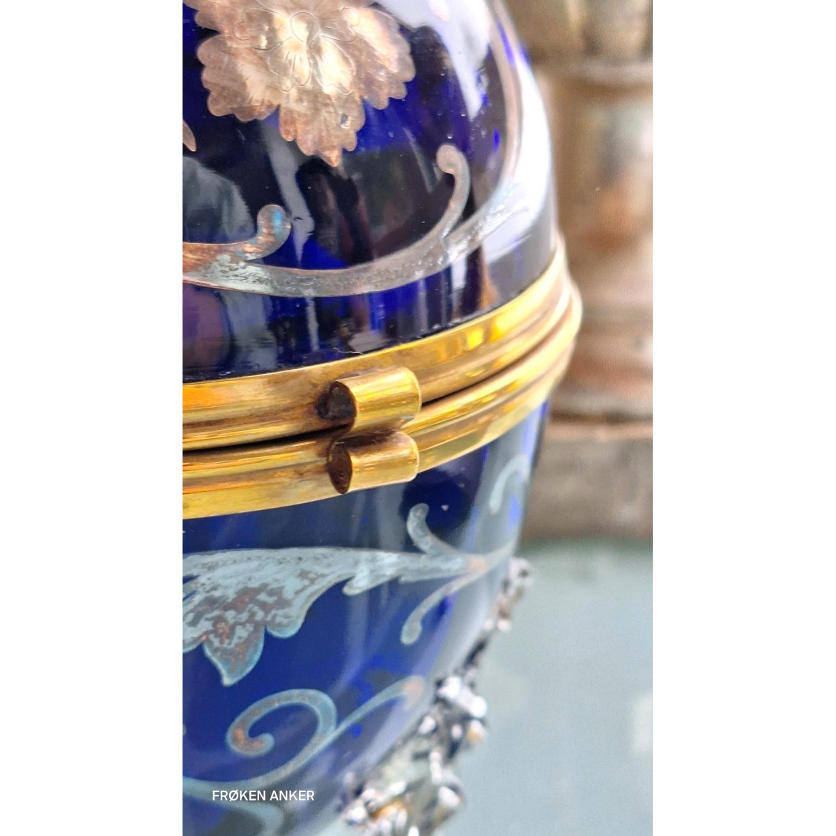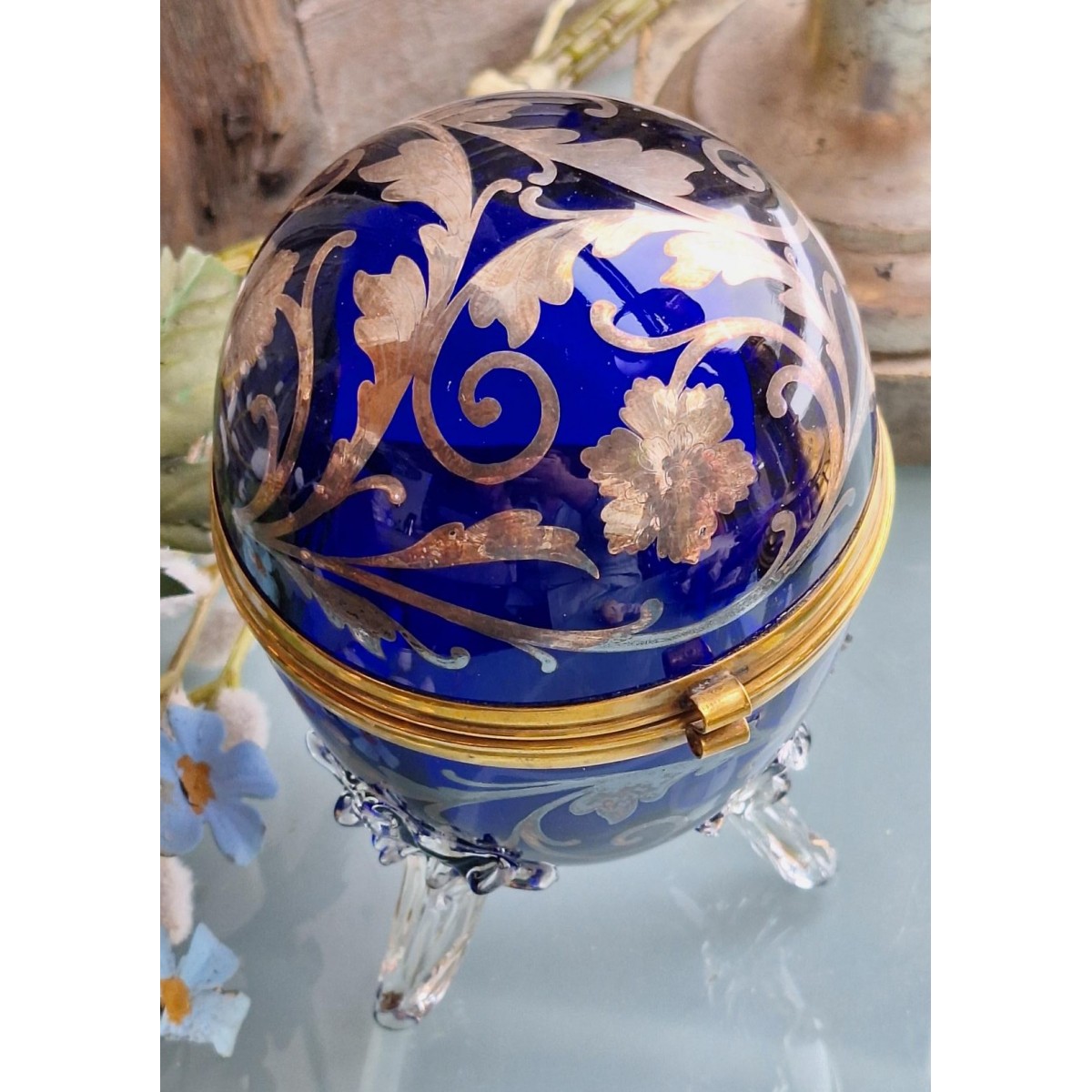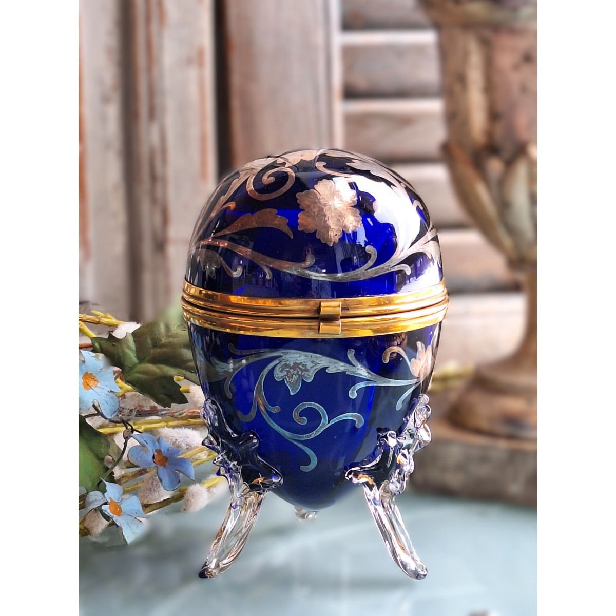 Stort ældre mundblæst glas- eller krystalæg (formentligt Murano) i midnatsblå, og med en smuk blomsterdekoration i sølv. Ægget står på 3 ben i klart glas, og har messingkant, der er blevet patineret med årene. Ægget er købt ved en udenlandsk samler, og er velholdt. Lidt slitage i malingen...SE BILLEDER, der er en del af beskrivelsen
