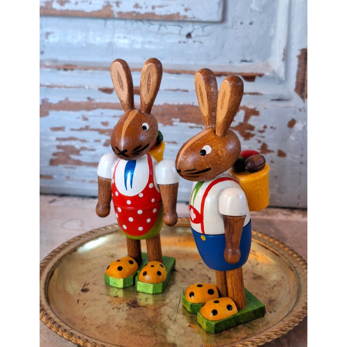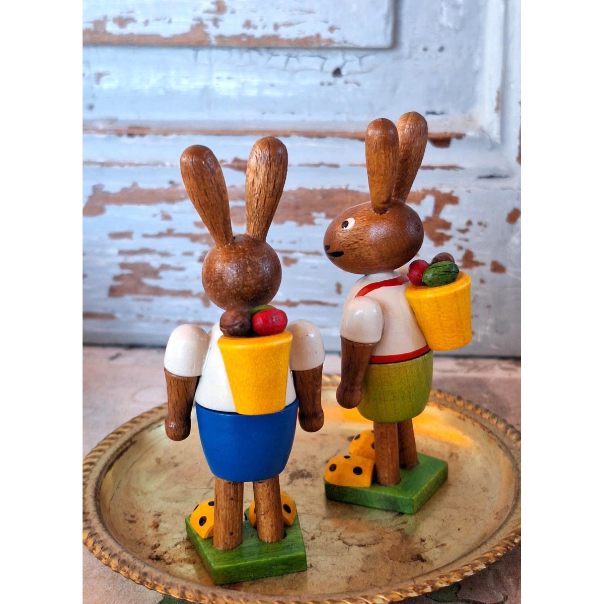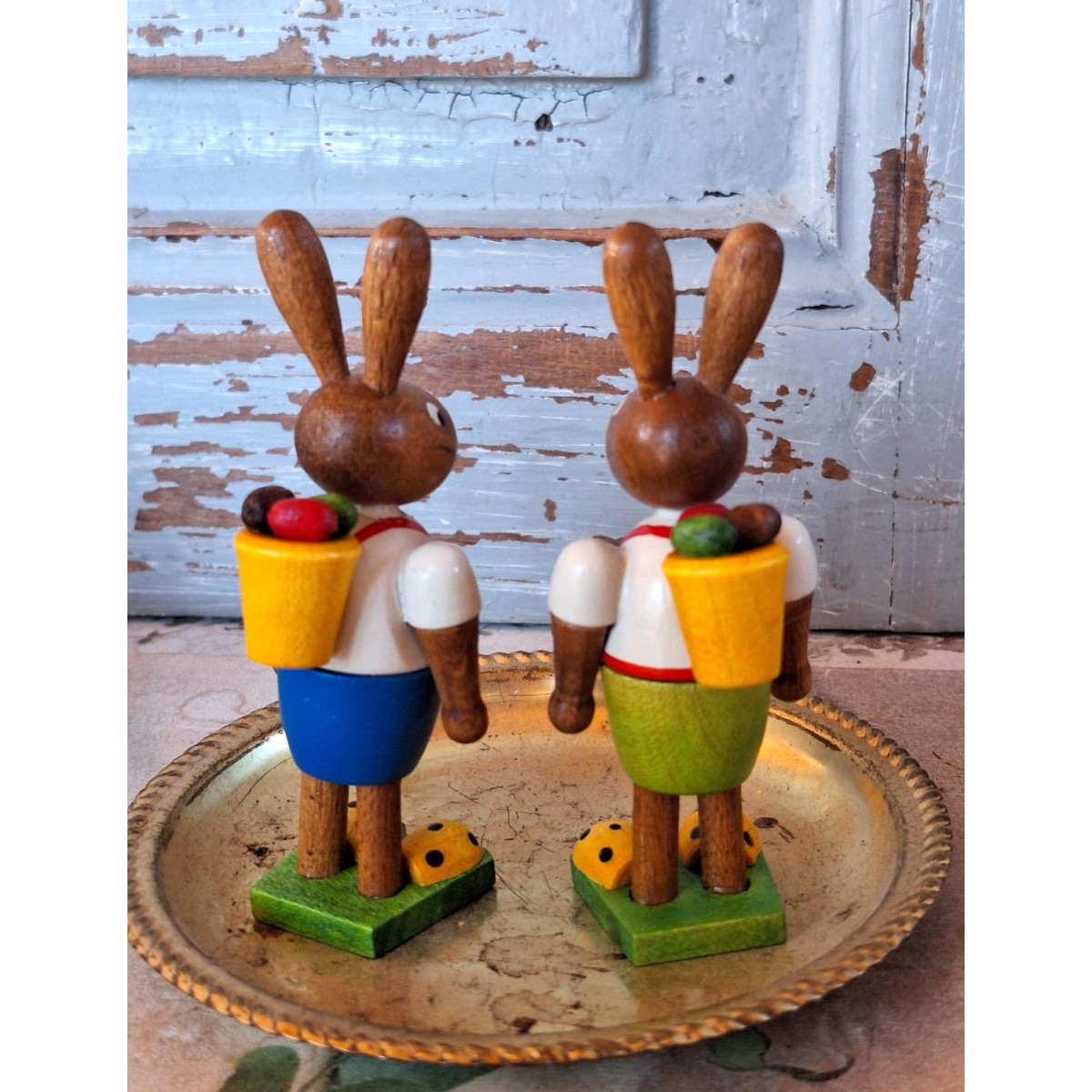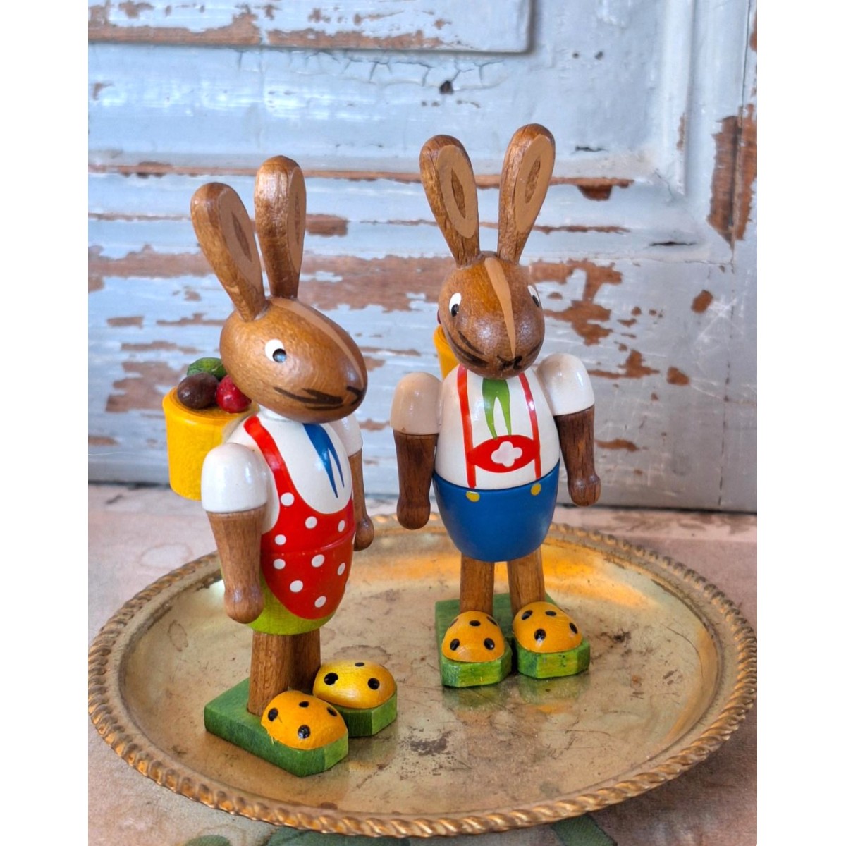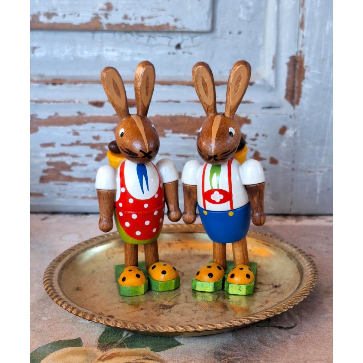 De søde påskeharer er i massiv træ og er meget dekorativ. Bemærk de gule sko - de lyser op. Figurerne sælges samlet