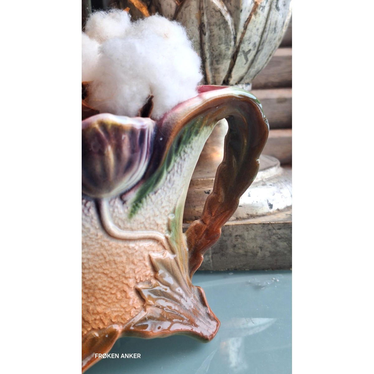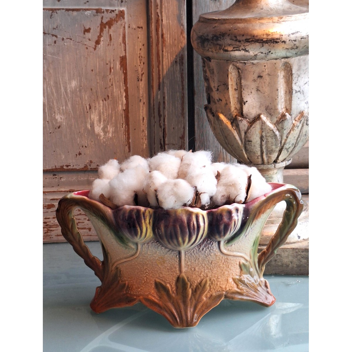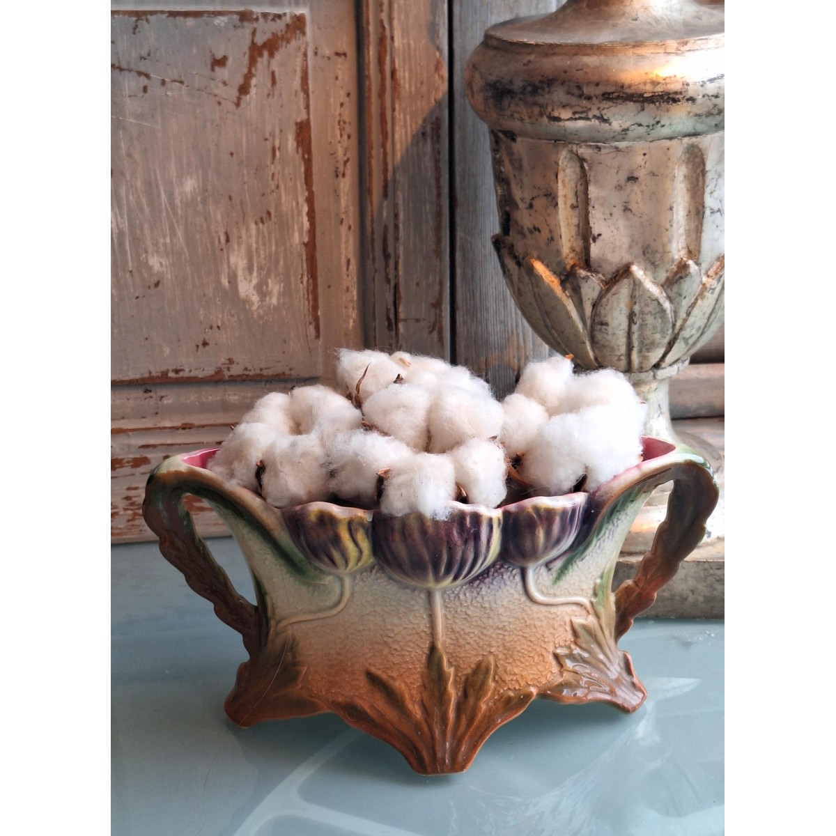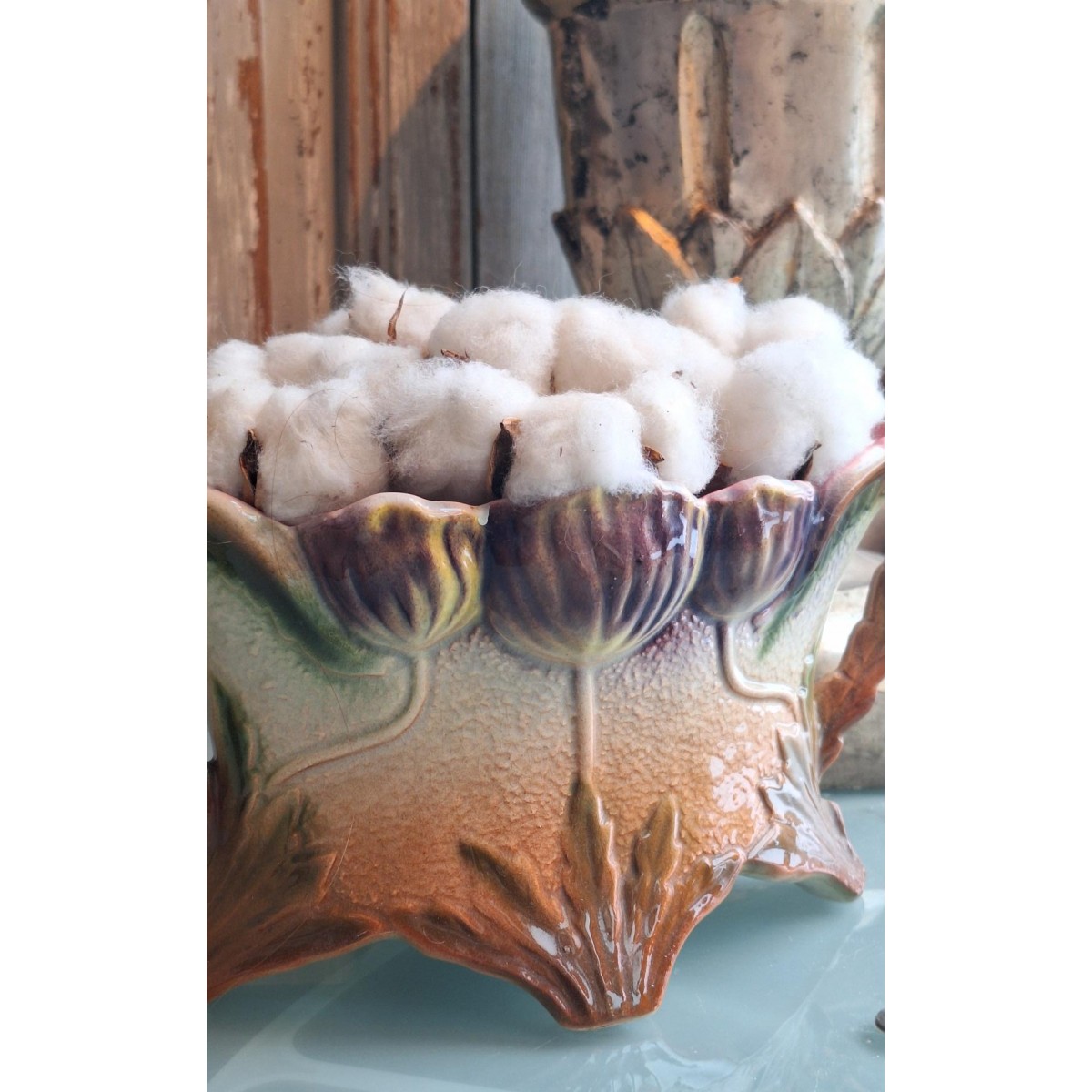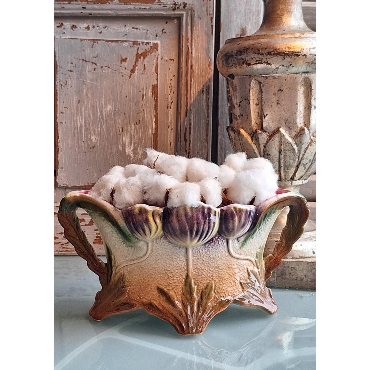 Smuk gammel fransk Art Nouveau jardiniere. Der er præget valmuer, på begge sider. Der er lidt forskel i farverne på de to sider. Den fine jardiniere er meget flot og velholdt - se billeder.